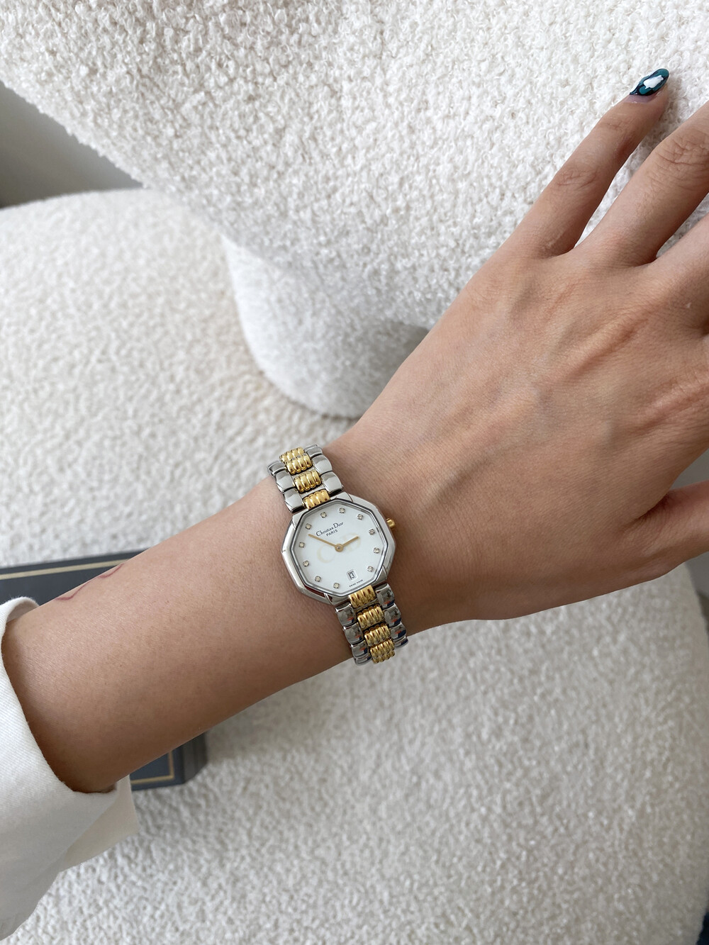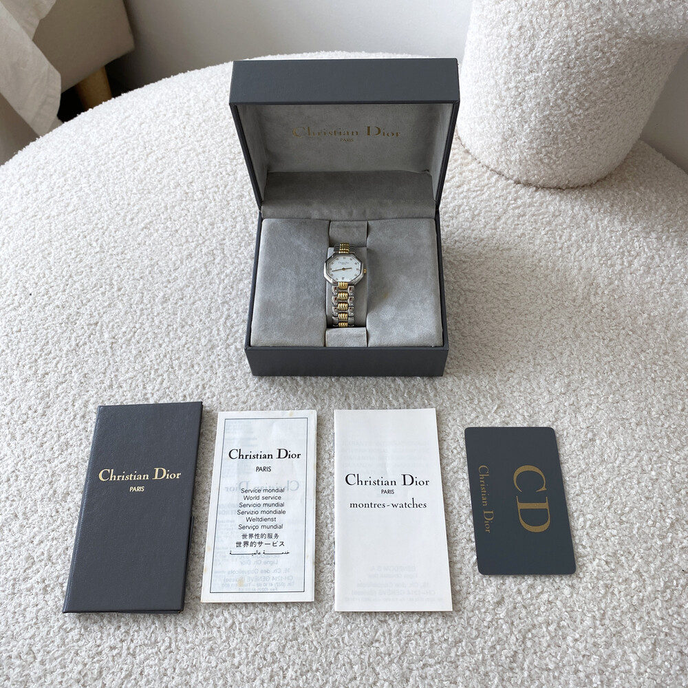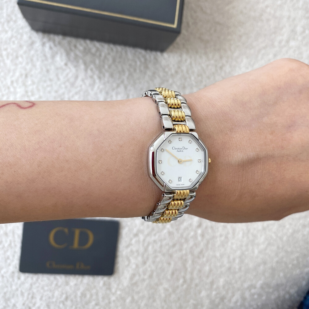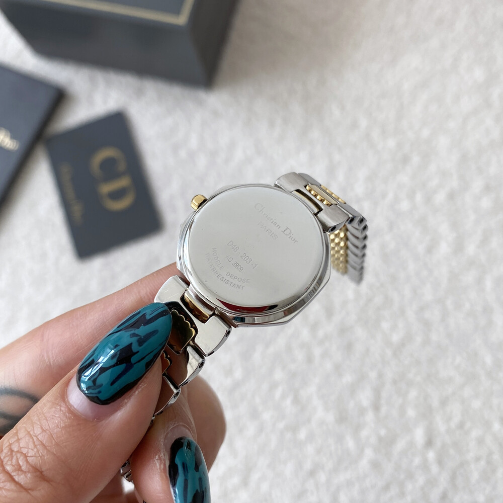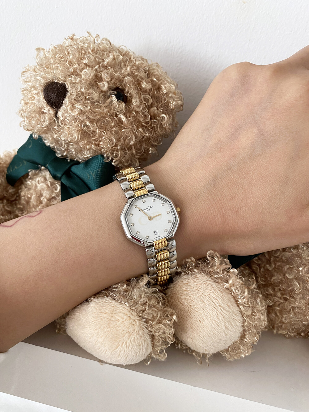 여성용으로 제작된 빈티지 디올 시계이며 스위스에서 생산된 쿼츠 무브먼트로 제작되었습니다.