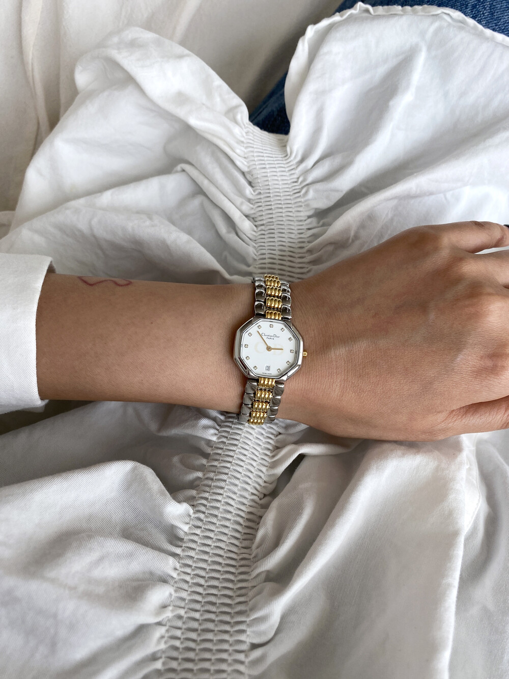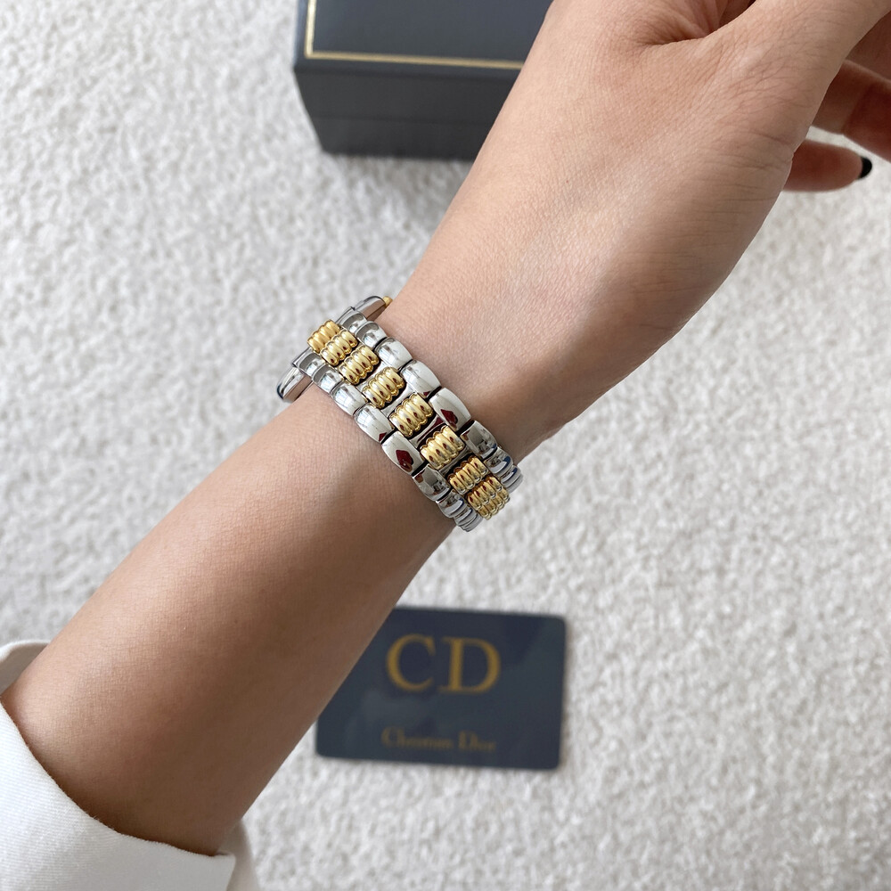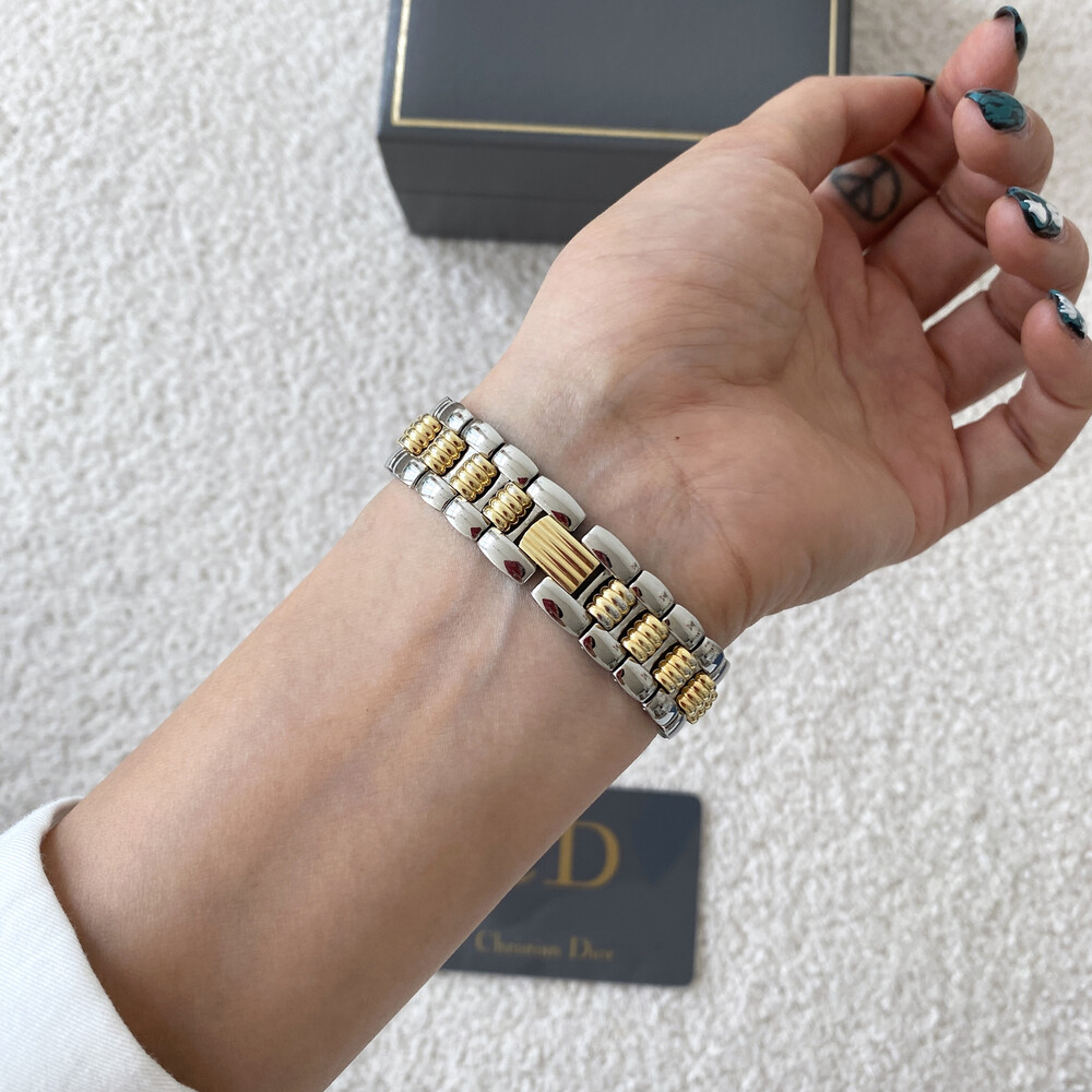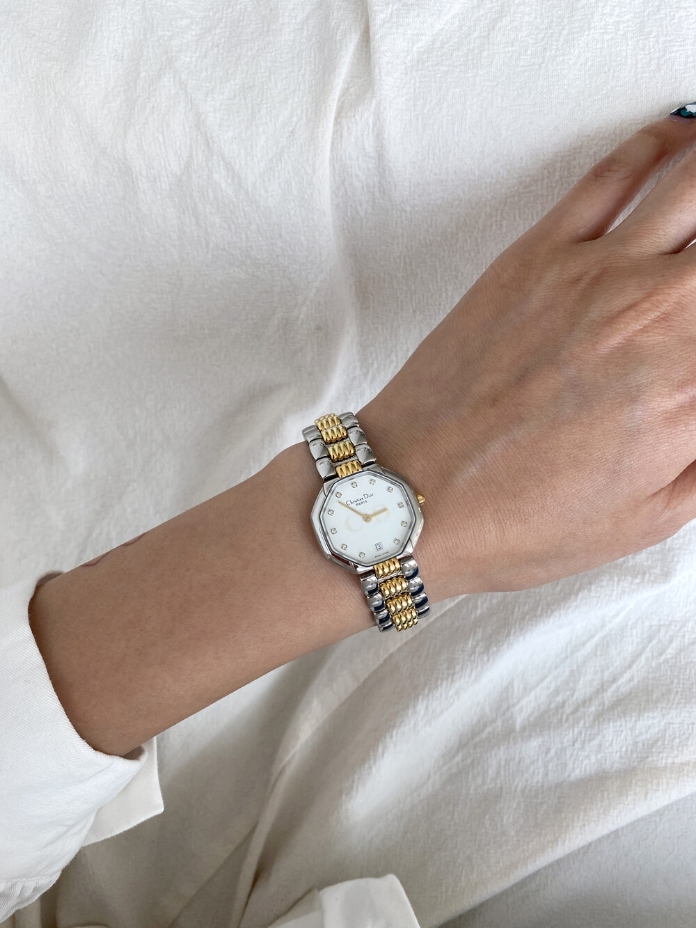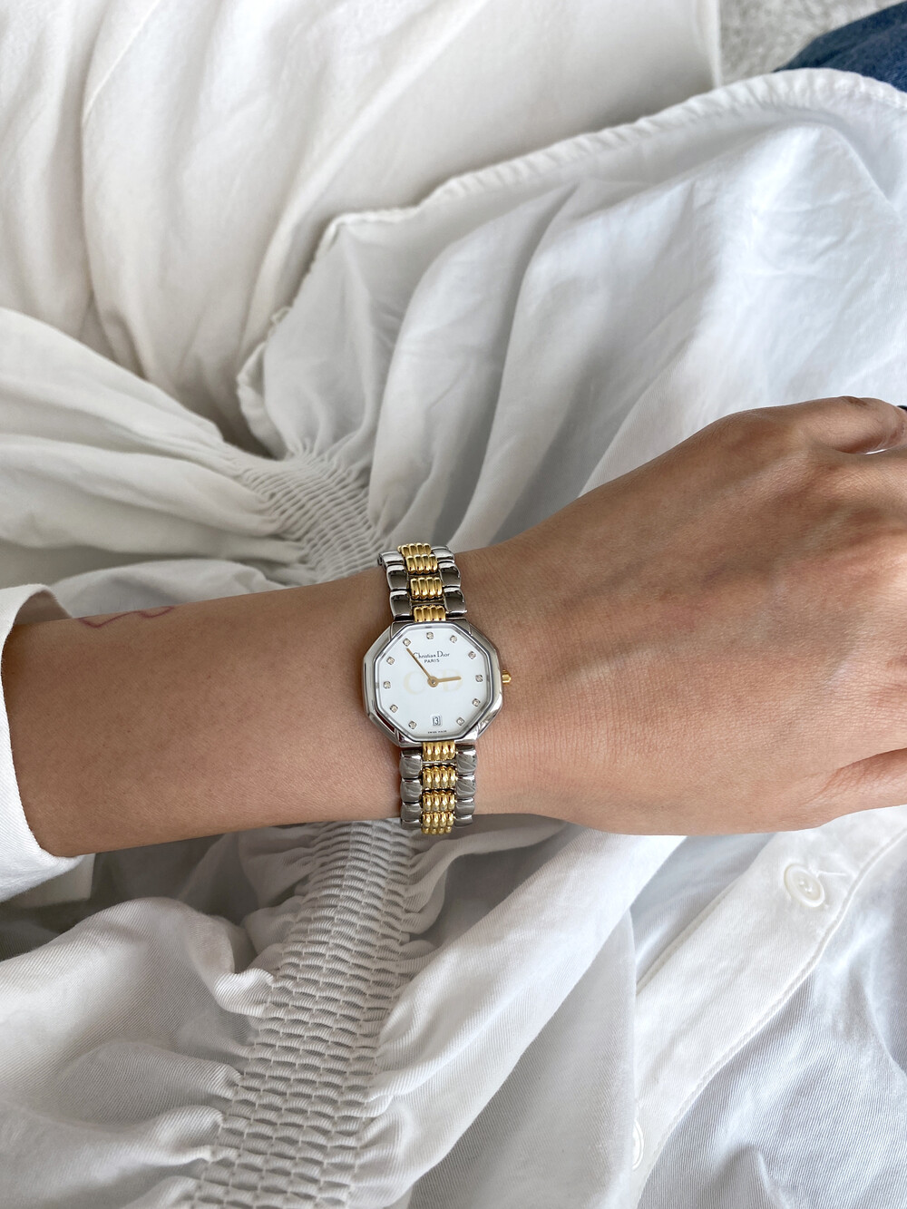 여성용으로 제작된 빈티지 디올 시계이며 스위스에서 생산된 쿼츠 무브먼트로 제작되었습니다.