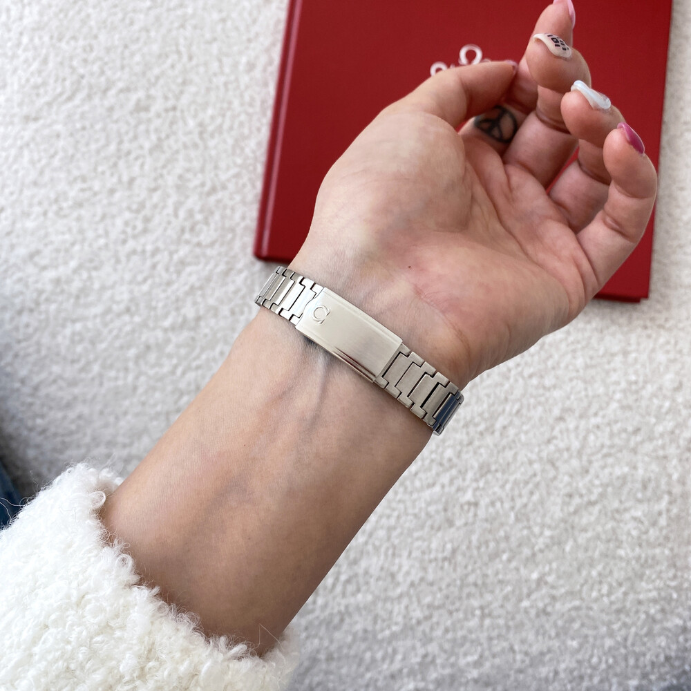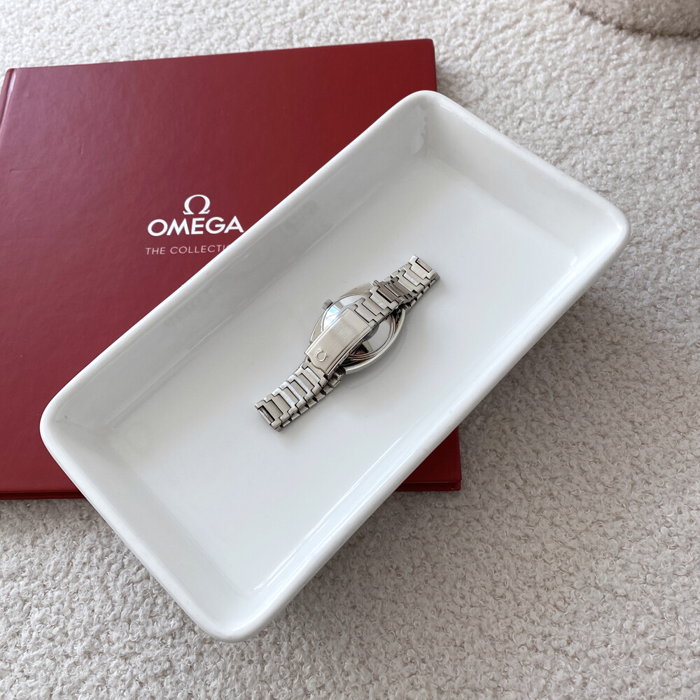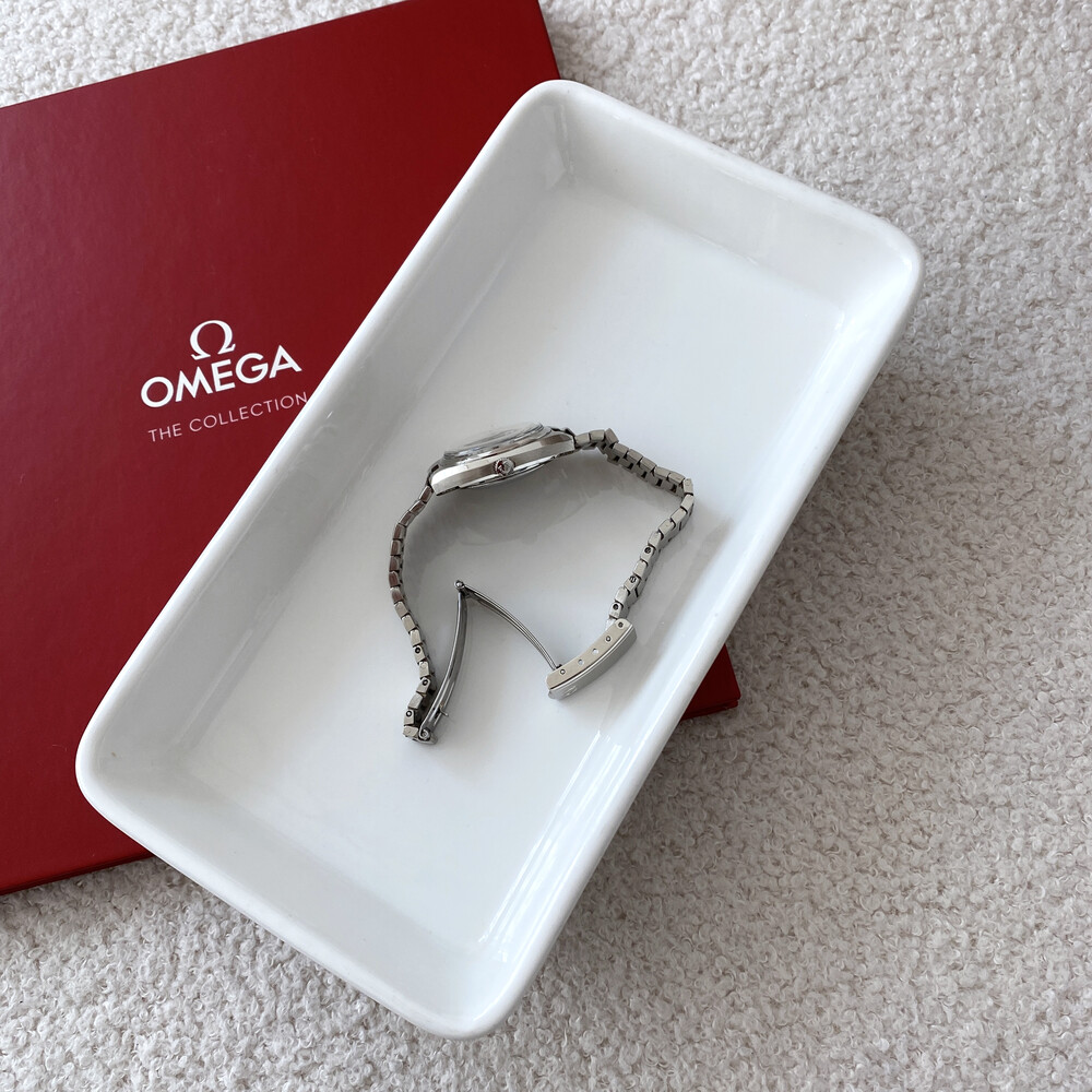 깔끔한 실버 다이얼 위를 장식하는 오메가 심볼이 매력적인 모델입니다.