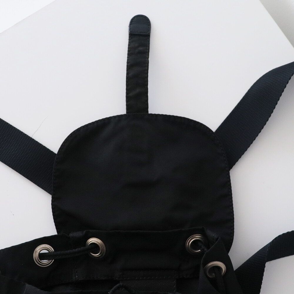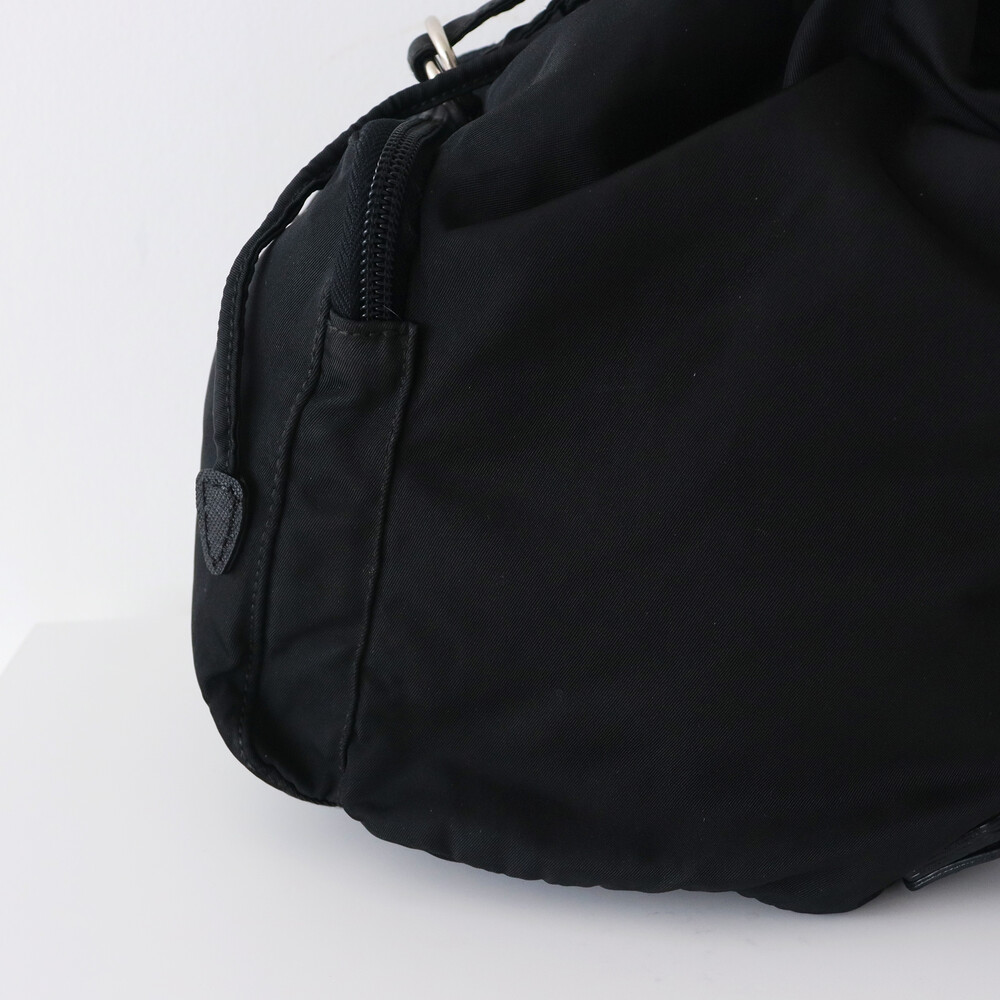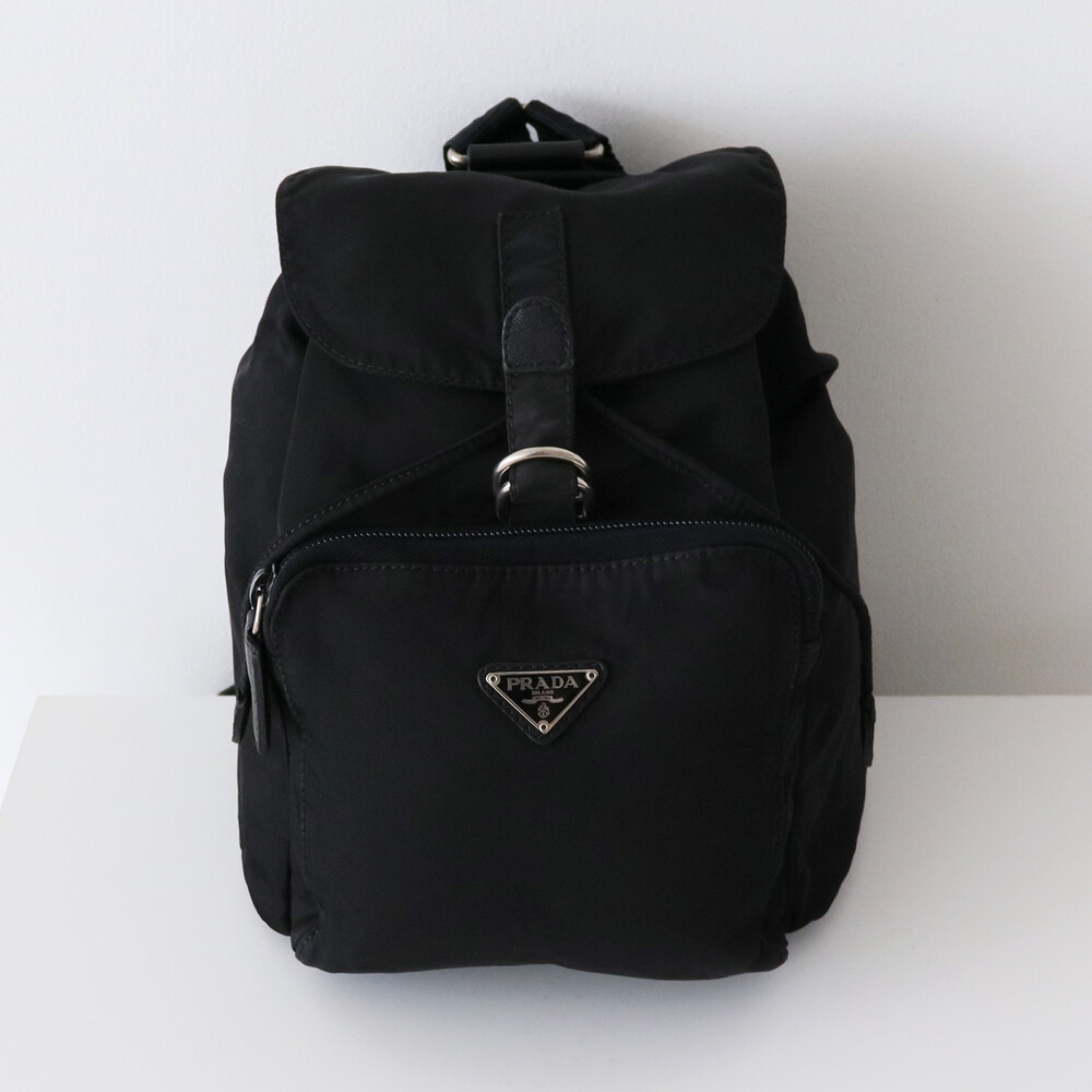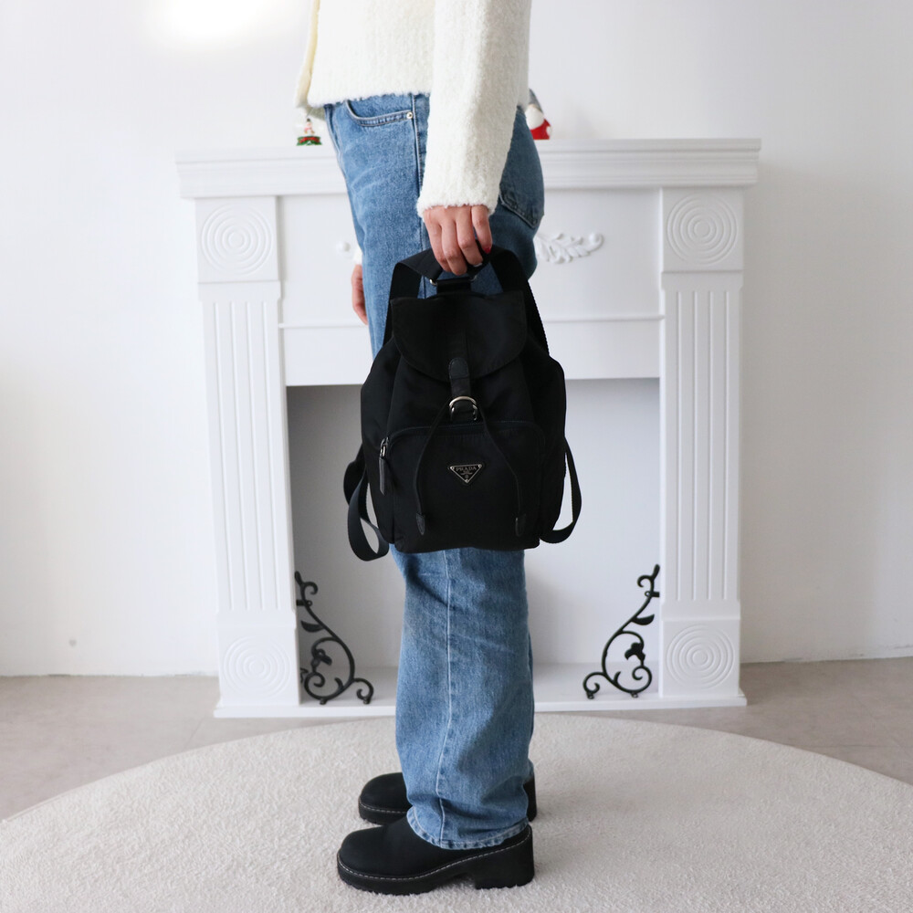 블랙 컬러의 나일론 바디와 프라다 시그니처 삼각 메탈 장식이 매력적인 모델입니다.
