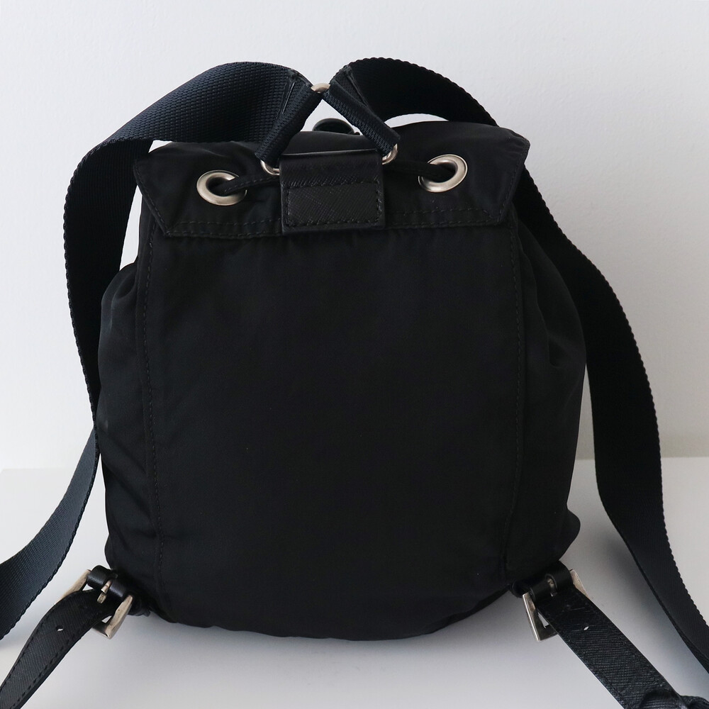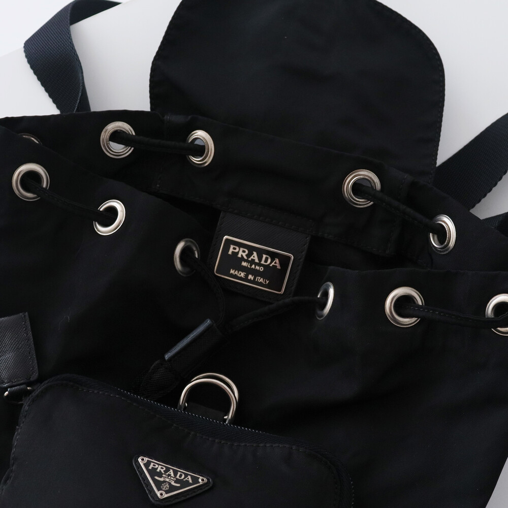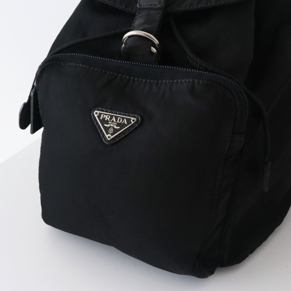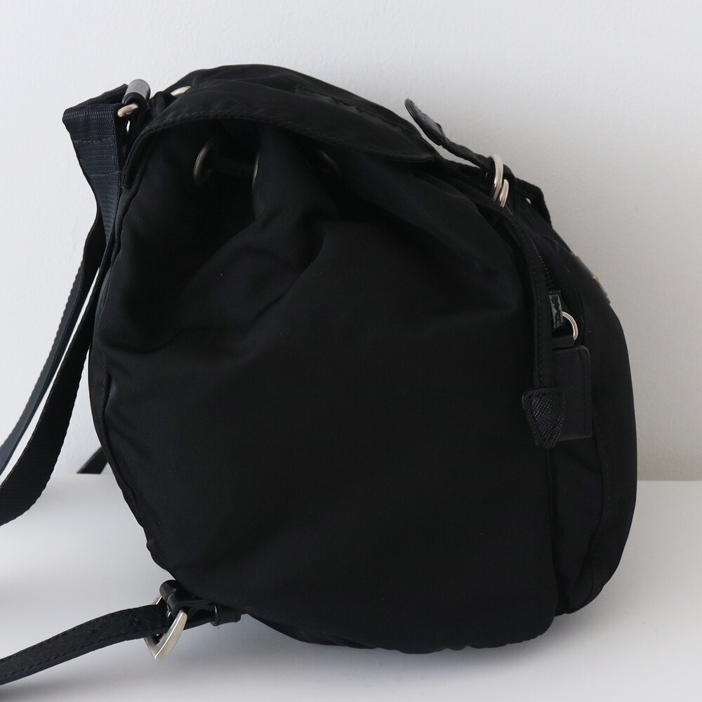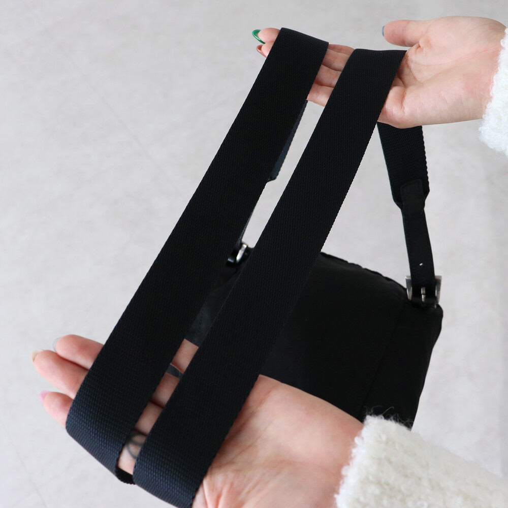 블랙 컬러의 나일론 바디와 프라다 시그니처 삼각 메탈 장식이 매력적인 모델입니다.