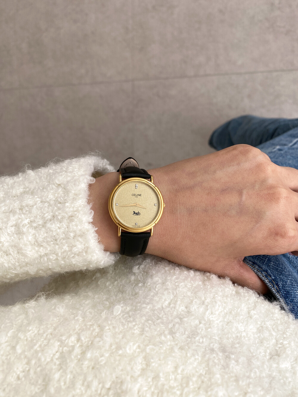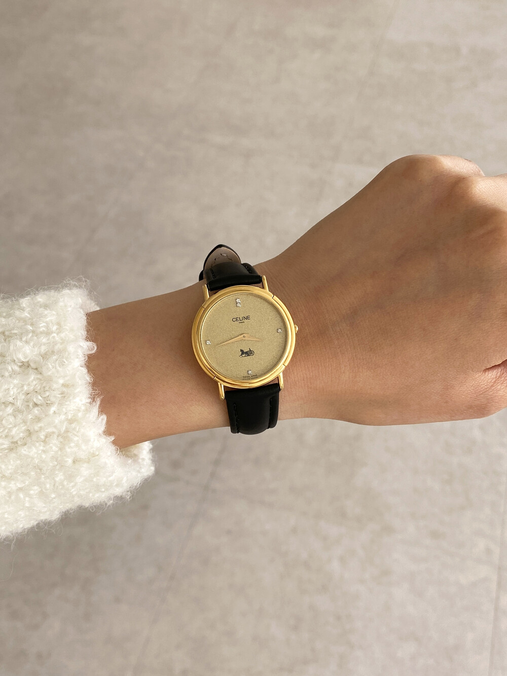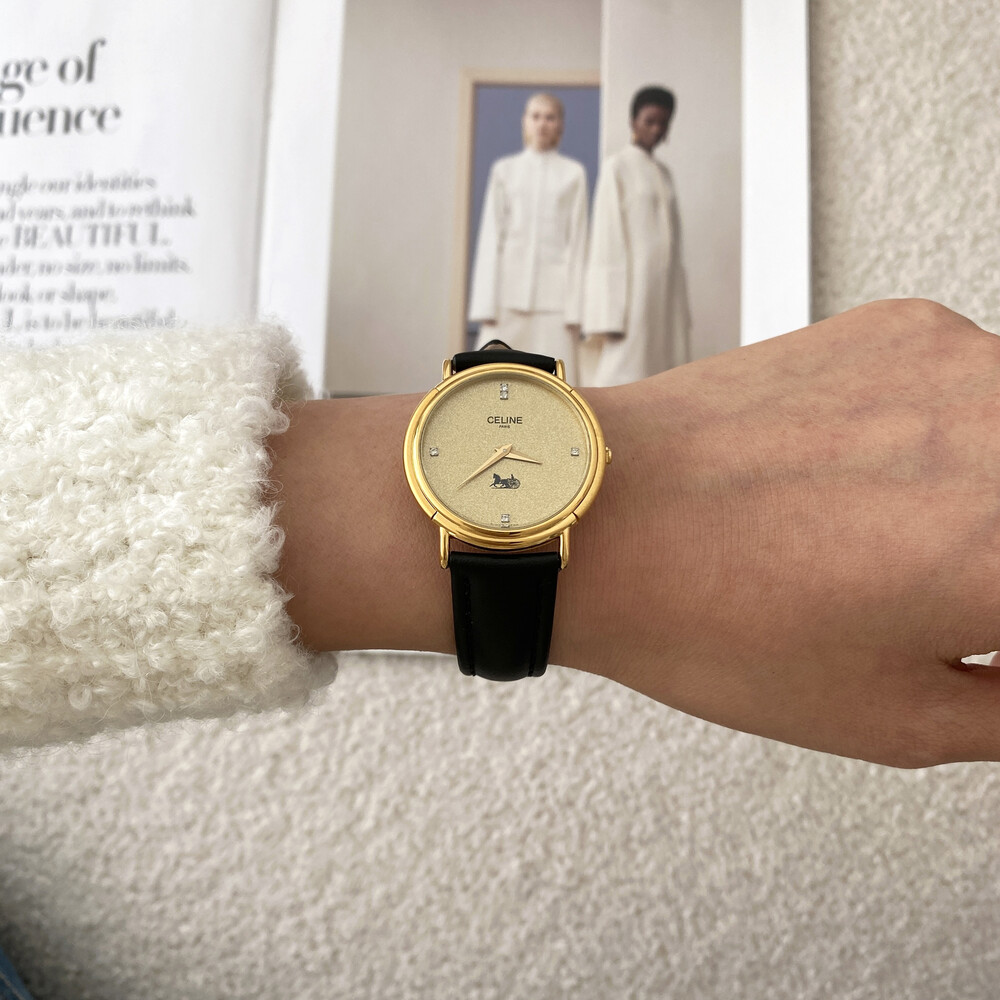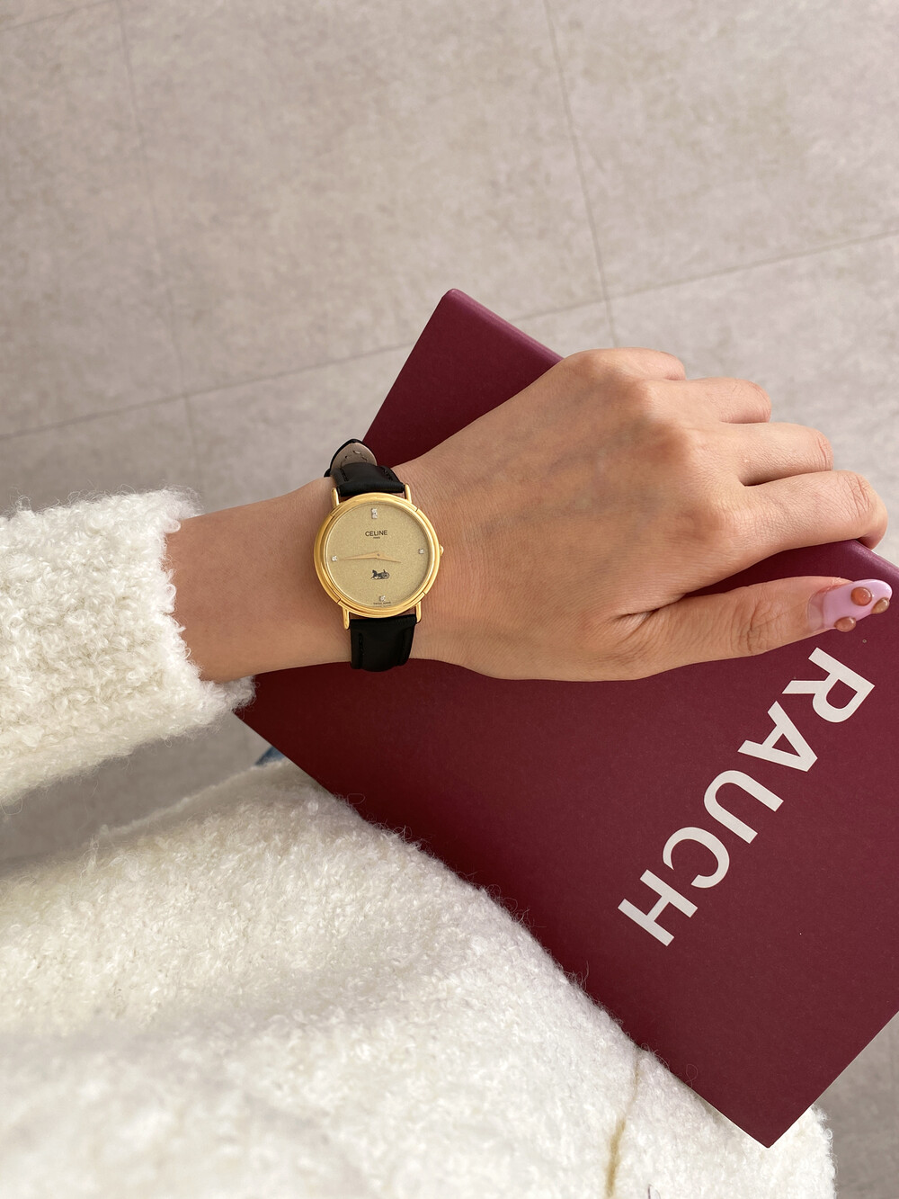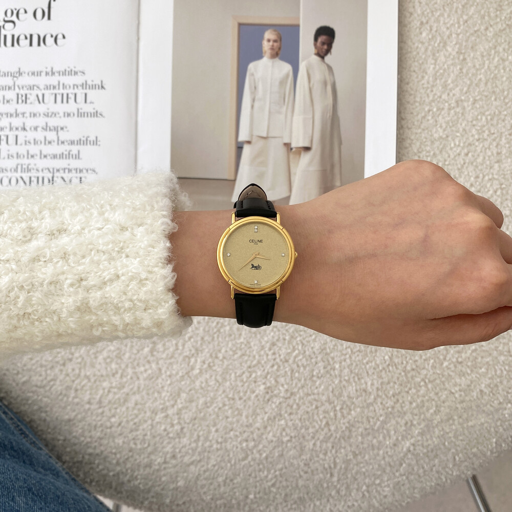 부드러운 골드 라운드 케이스와 다이얼 위를 장식하는 셀린느 마차 심볼이 매력적인 모델입니다.