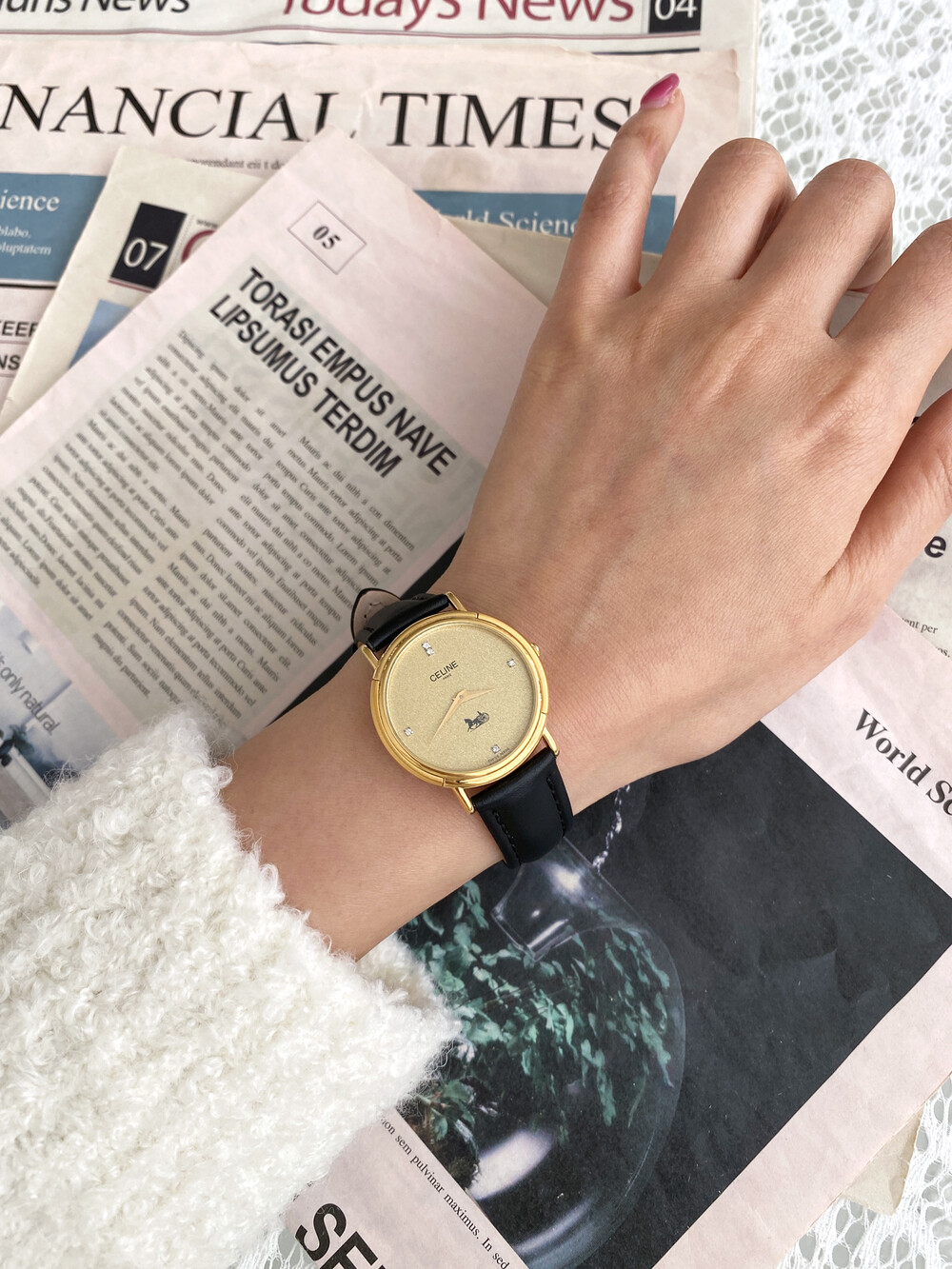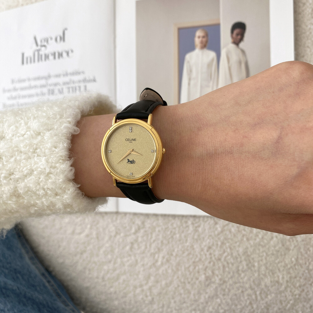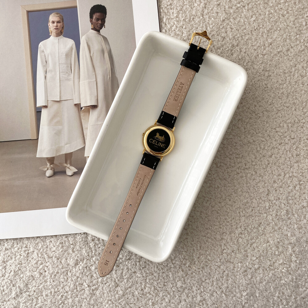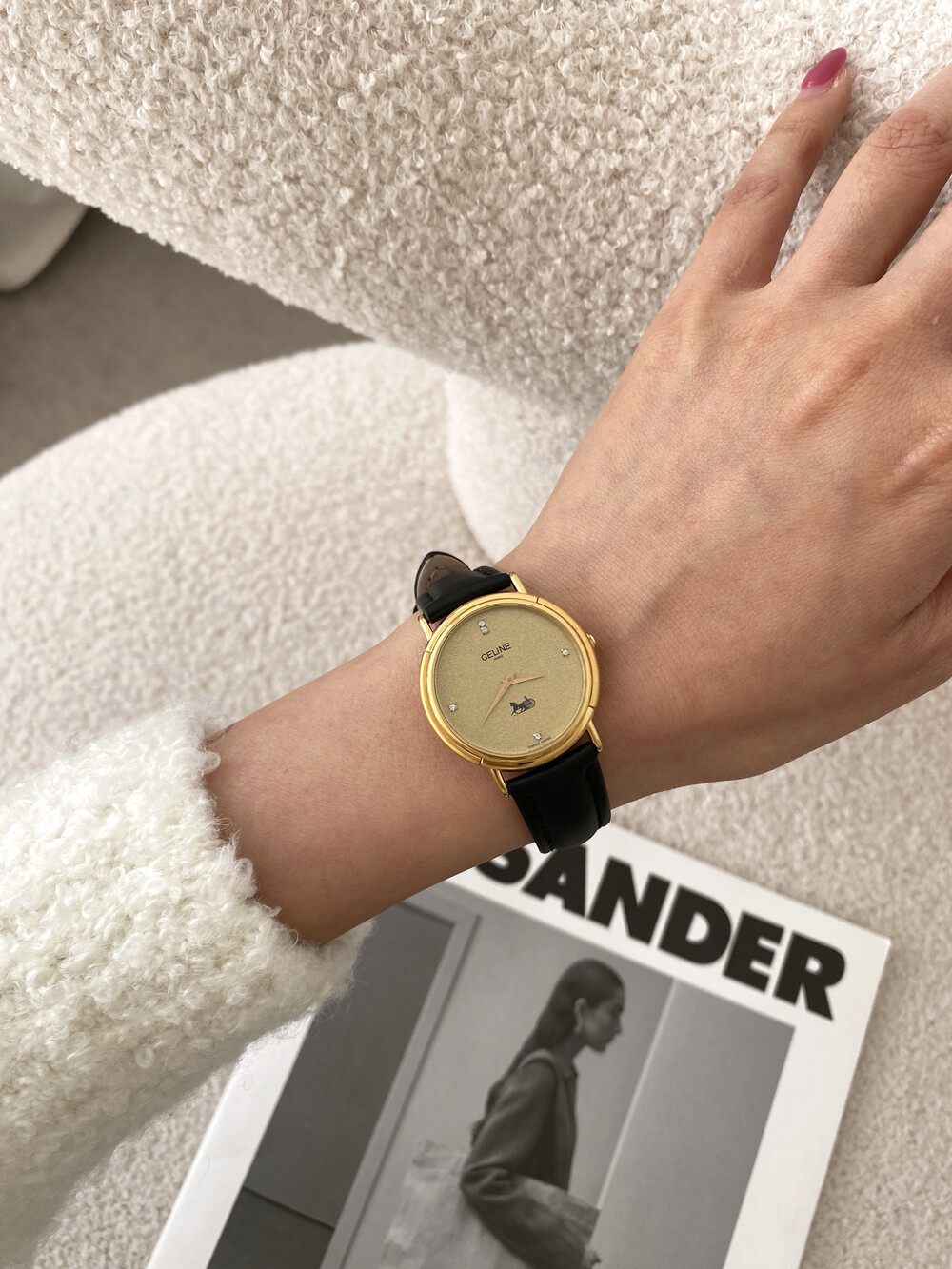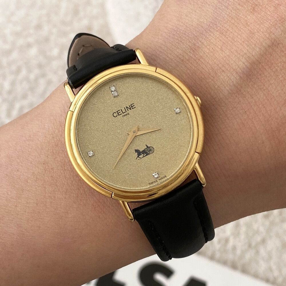 부드러운 골드 라운드 케이스와 다이얼 위를 장식하는 셀린느 마차 심볼이 매력적인 모델입니다.