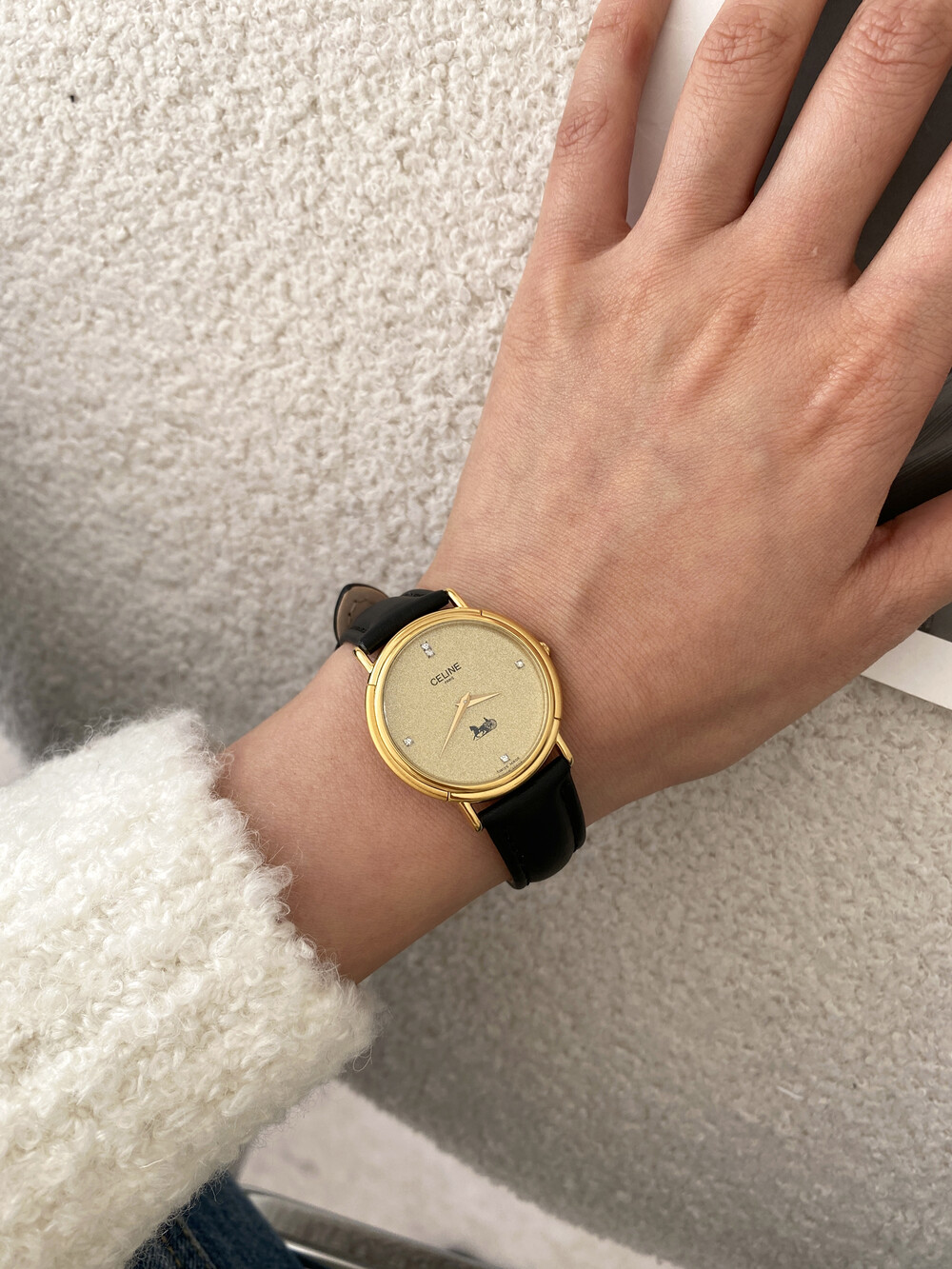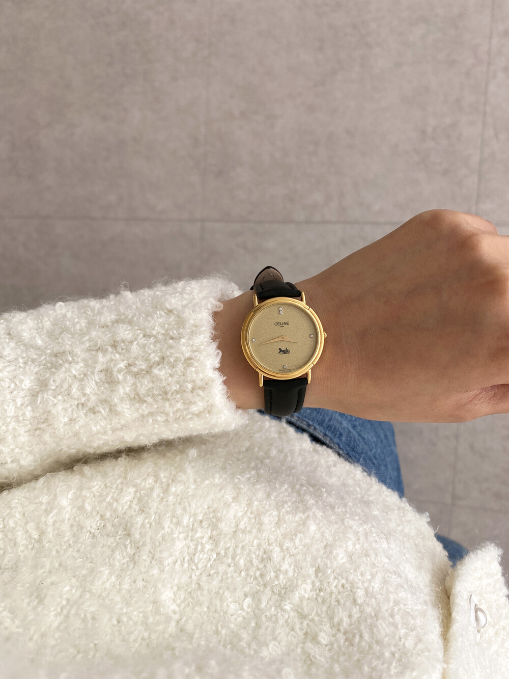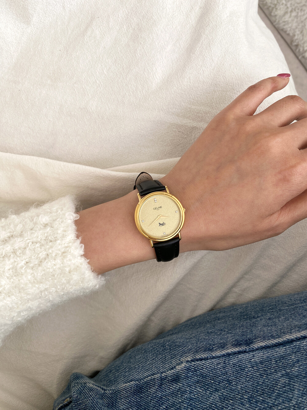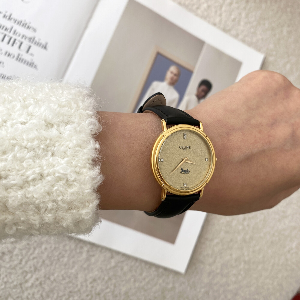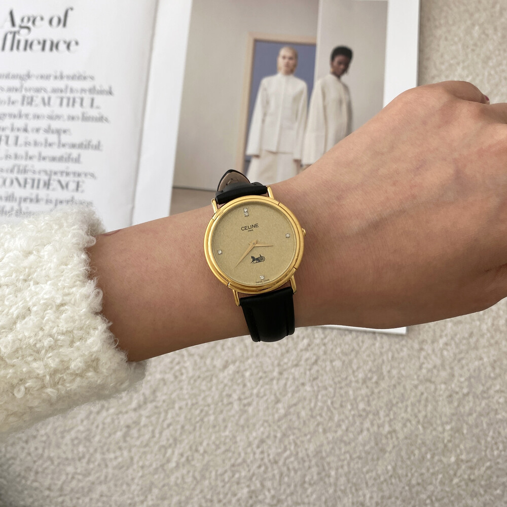 부드러운 골드 라운드 케이스와 다이얼 위를 장식하는 셀린느 마차 심볼이 매력적인 모델입니다.