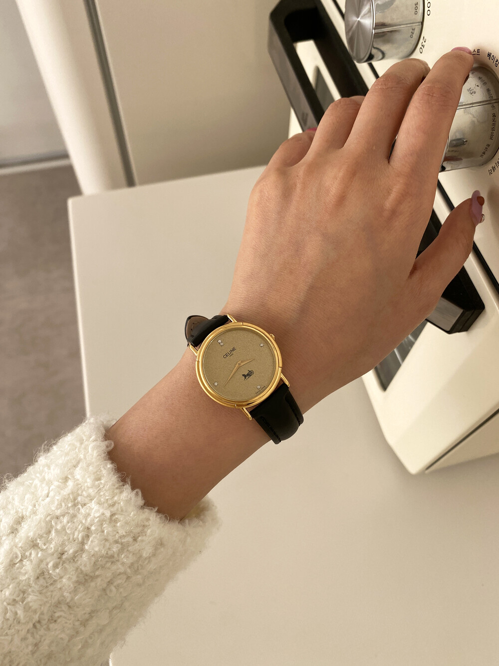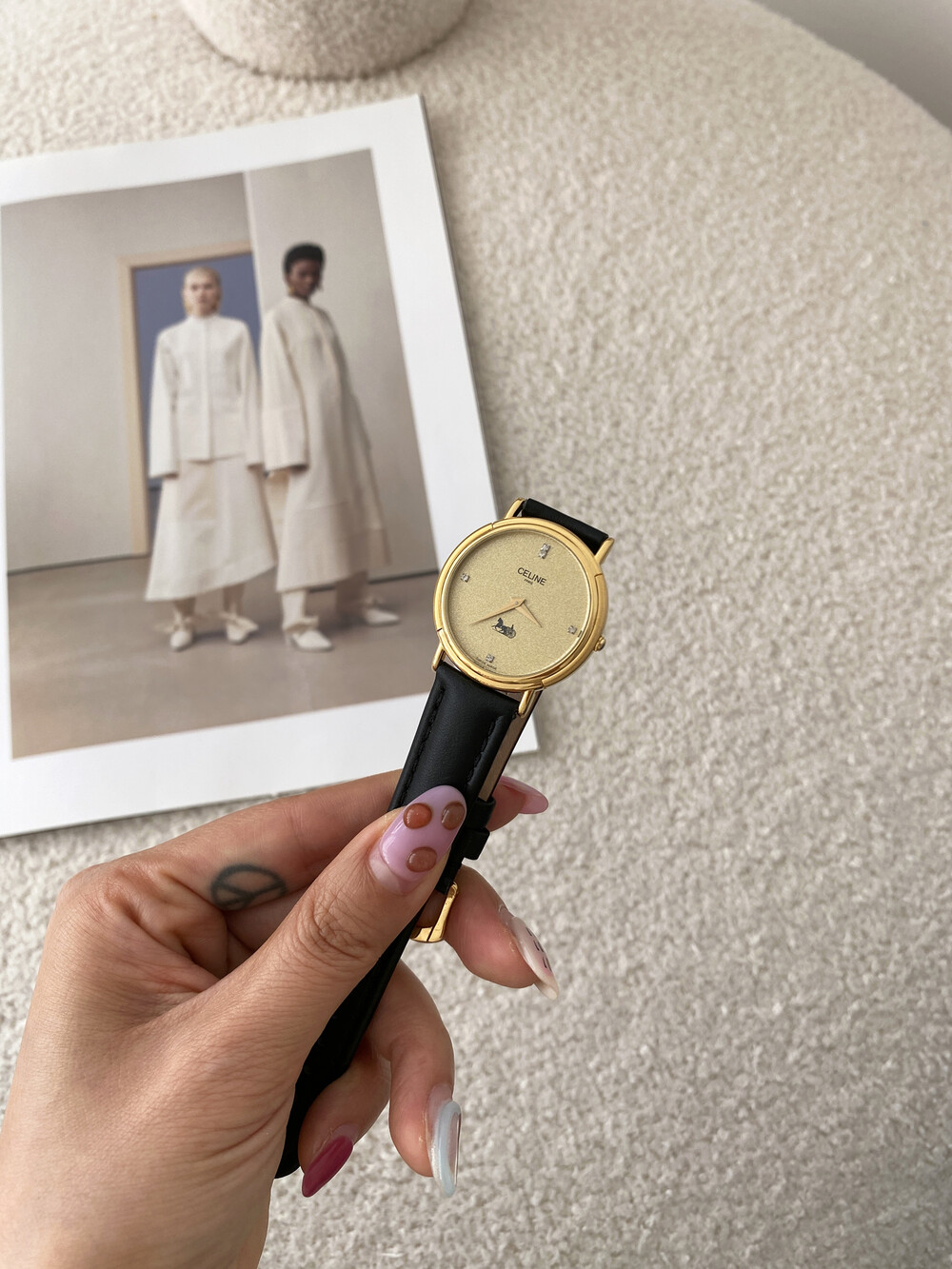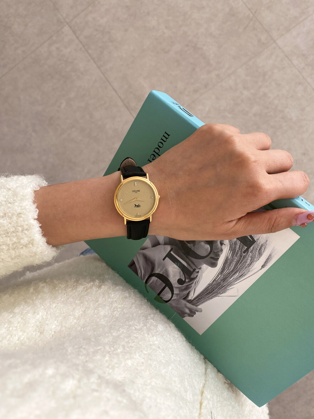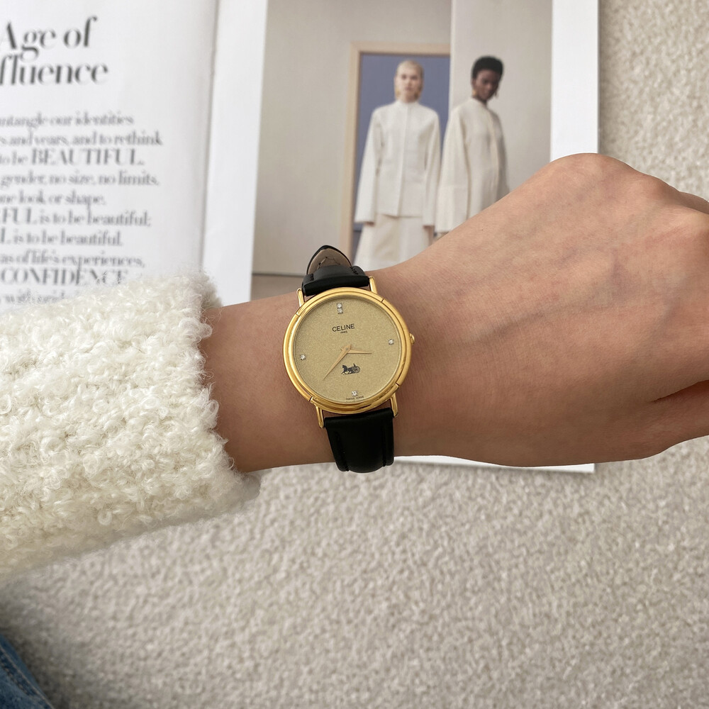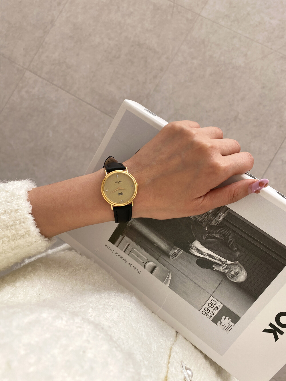 부드러운 골드 라운드 케이스와 다이얼 위를 장식하는 셀린느 마차 심볼이 매력적인 모델입니다.