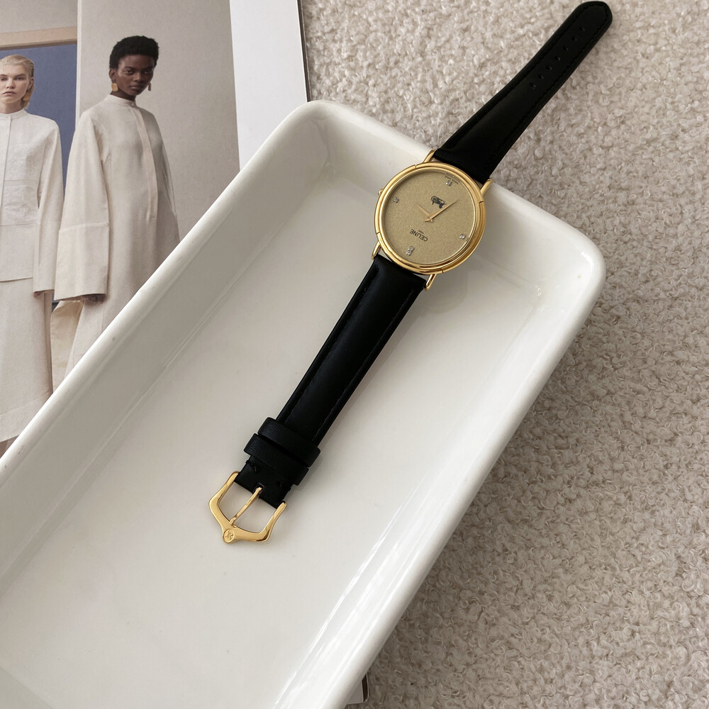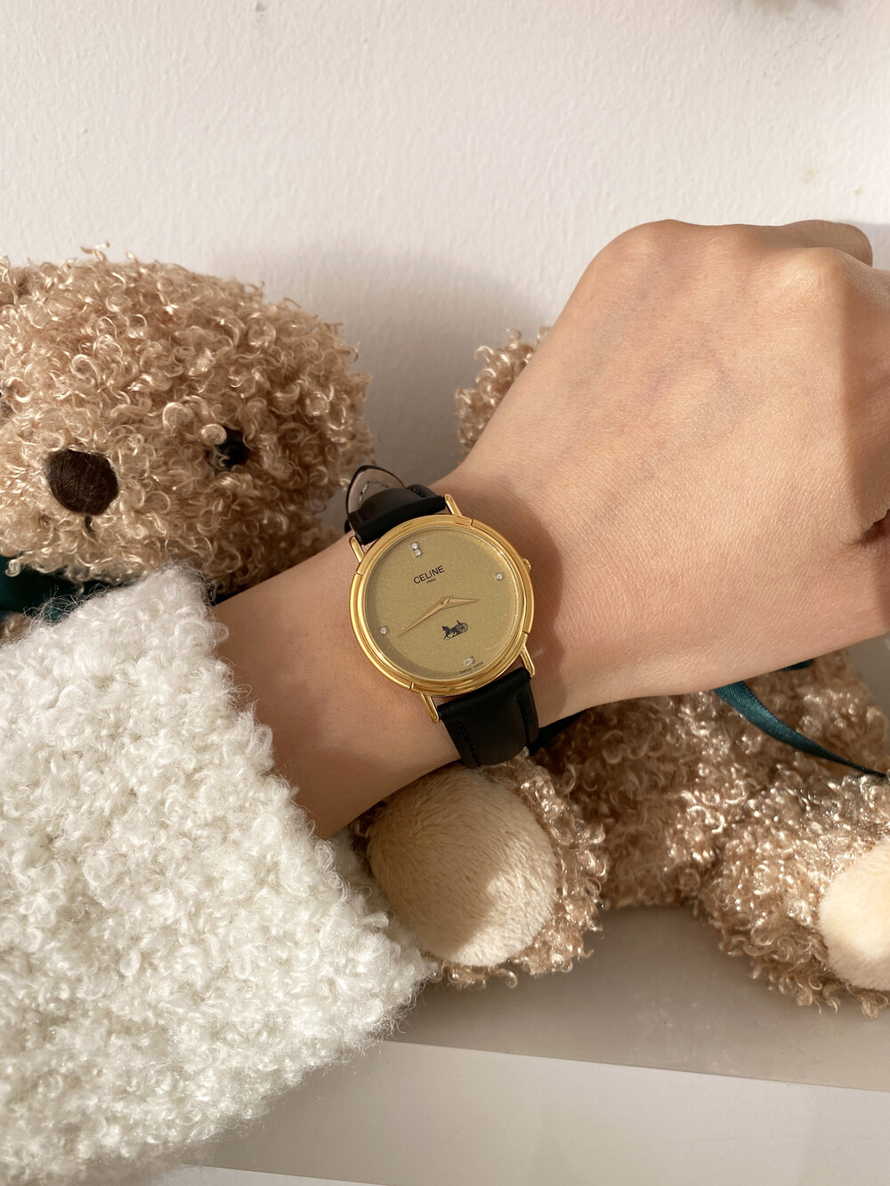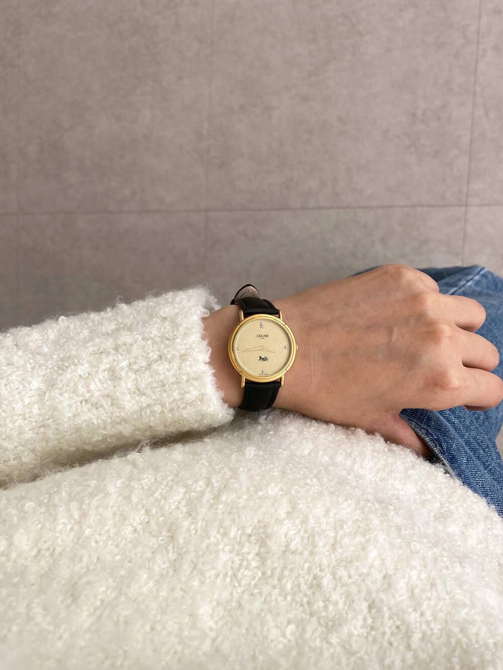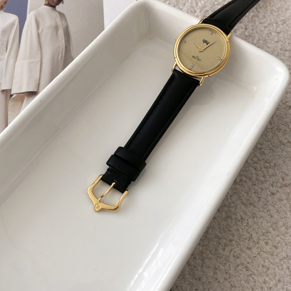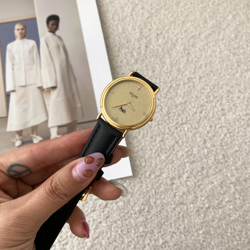 부드러운 골드 라운드 케이스와 다이얼 위를 장식하는 셀린느 마차 심볼이 매력적인 모델입니다.