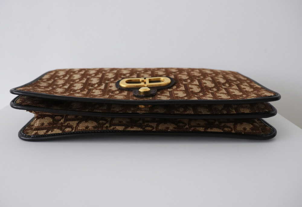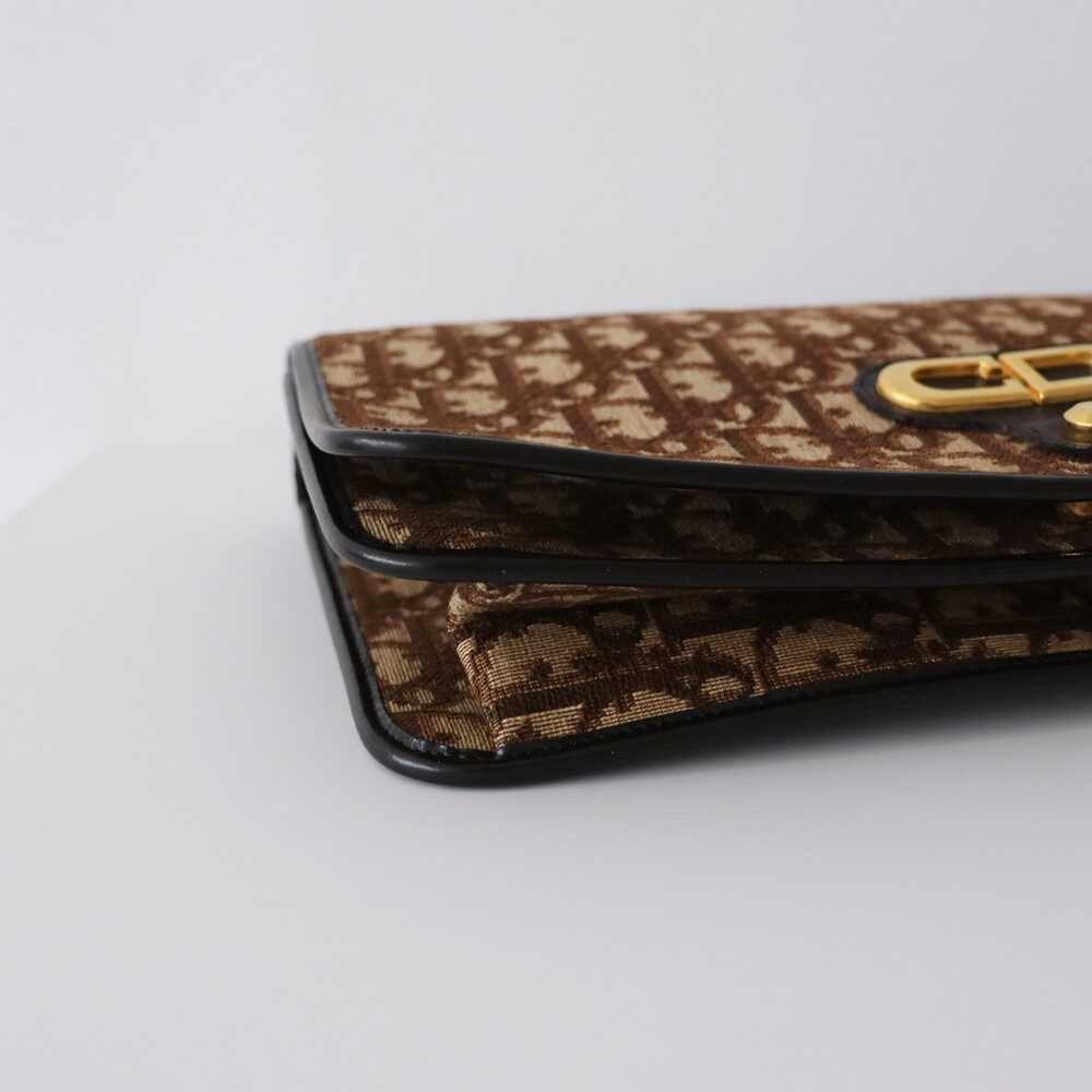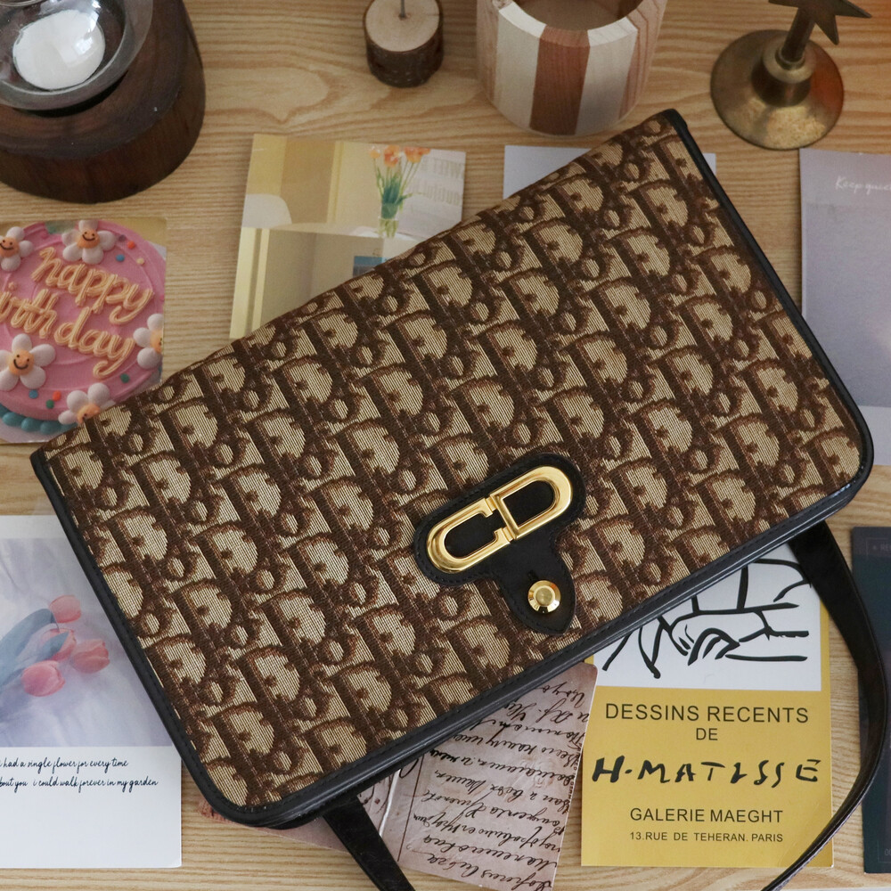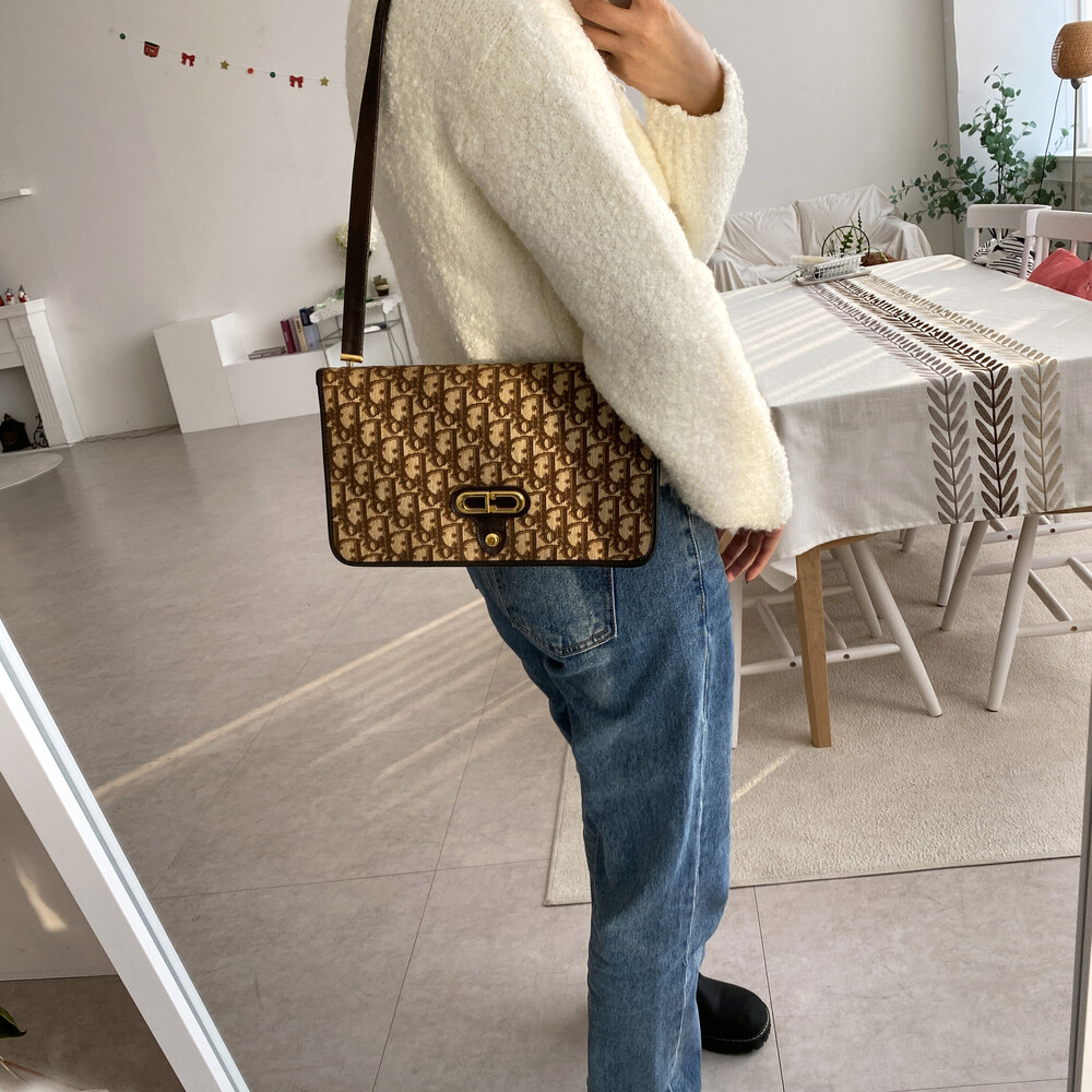 브라운 톤의 디올 시그니처 오블리크 패턴 캔버스와 중앙의 골드 CD 로고 장식이 조화를 이루어, 브랜드 특유의 클래식한 감성을 담은 모델입니다.