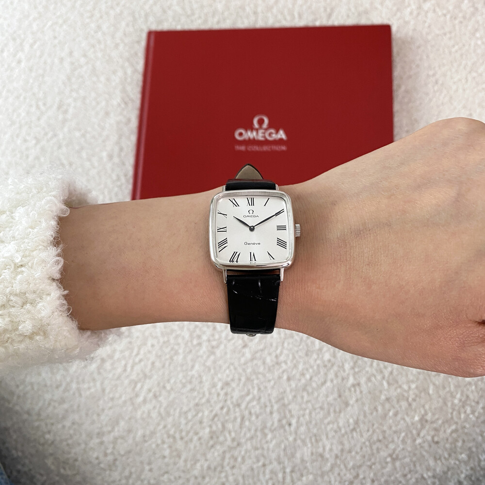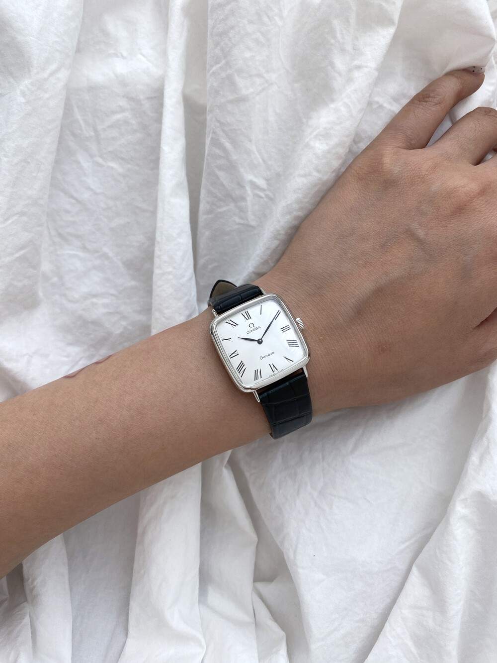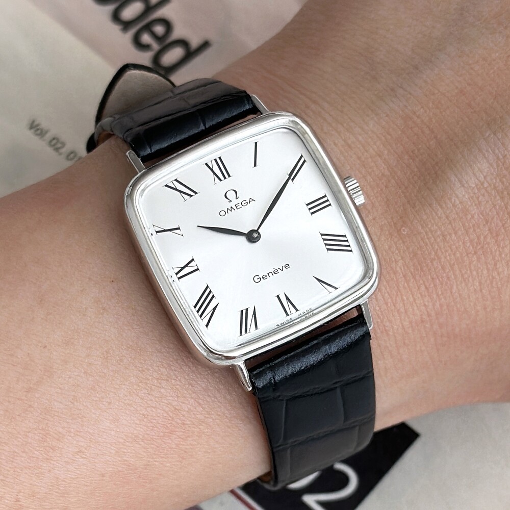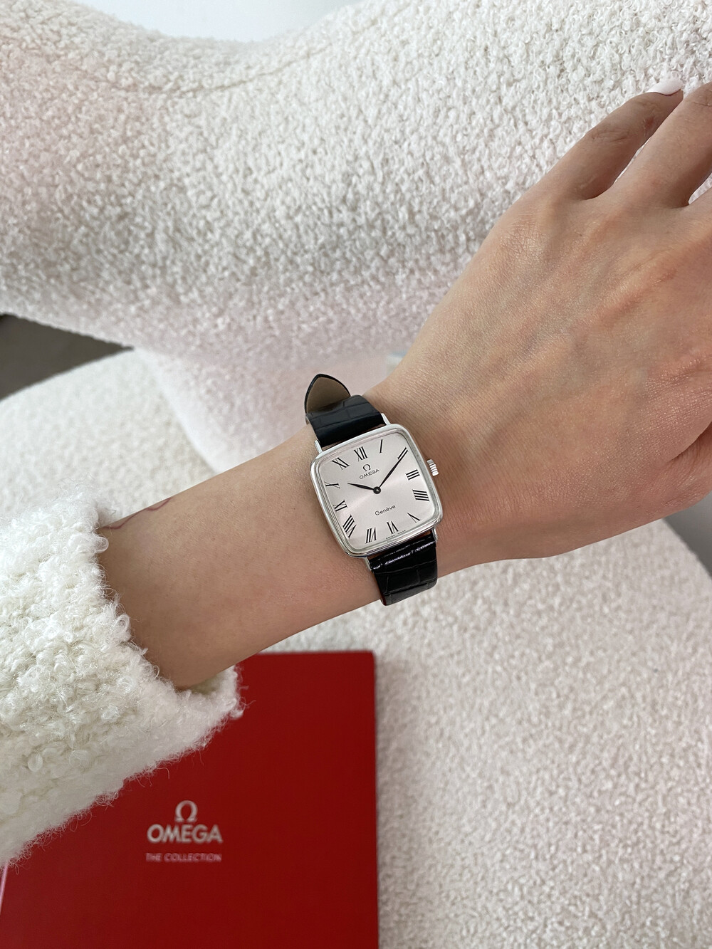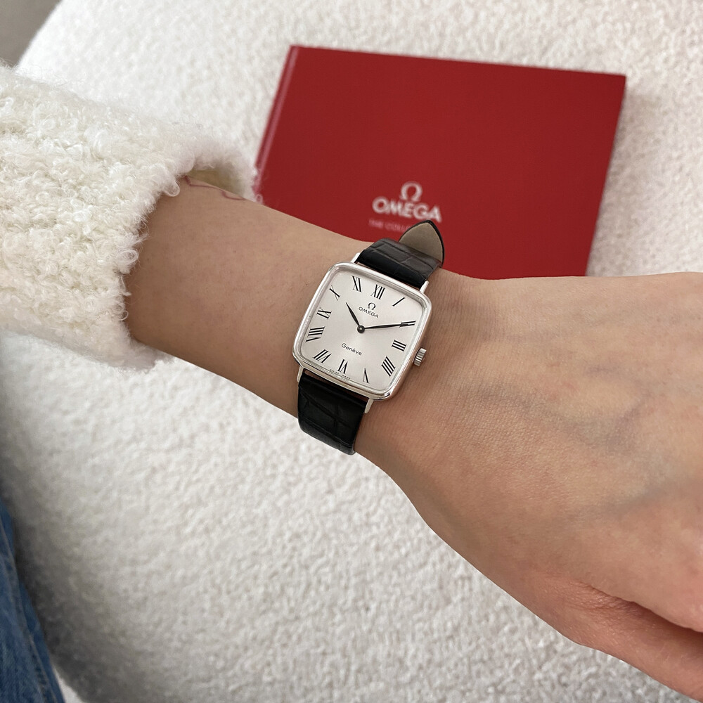 1974년도에 제작된 오메가 제네브 모델로 부드러운 곡선의 스퀘어 타입의 실버 케이스,