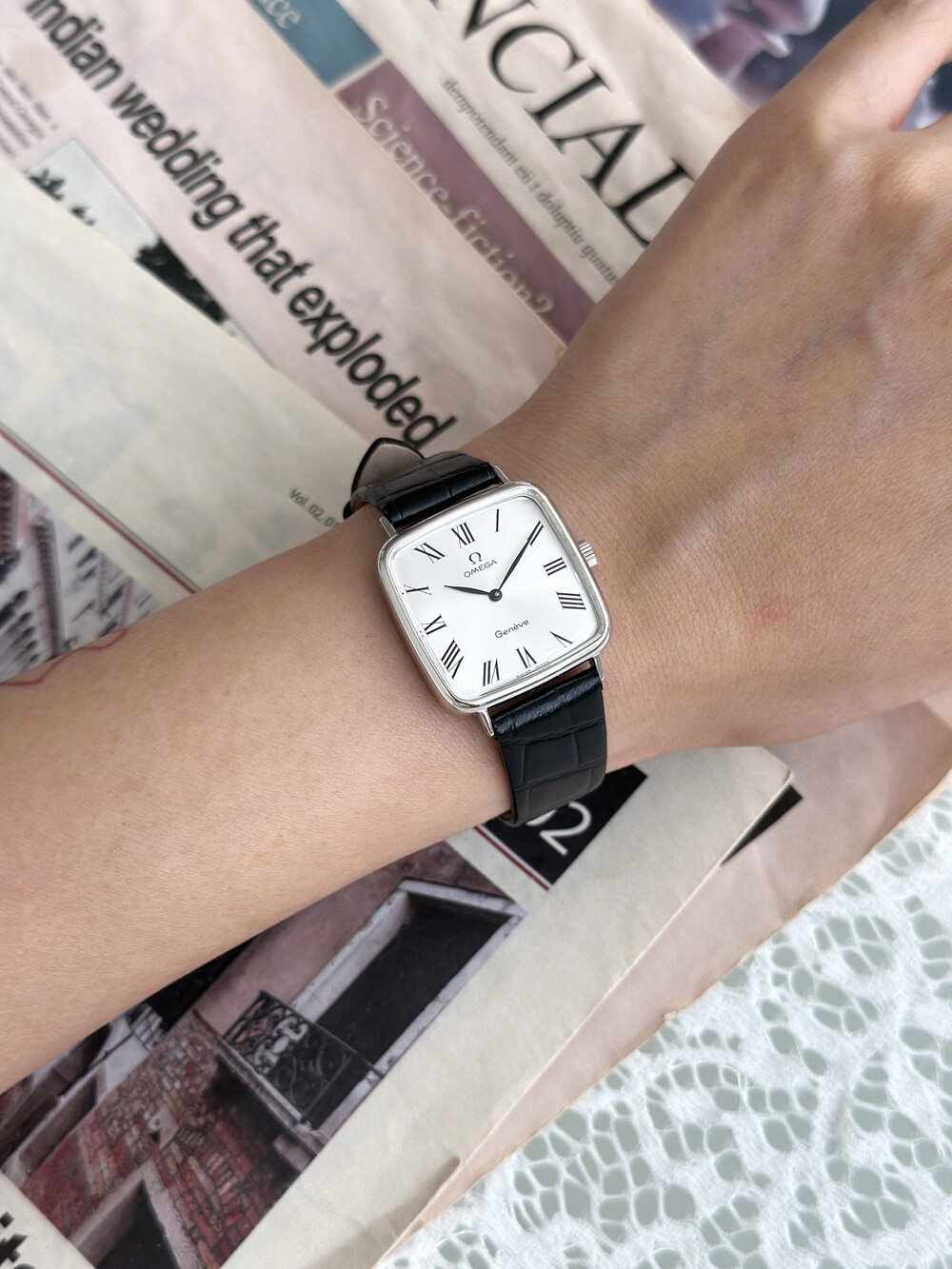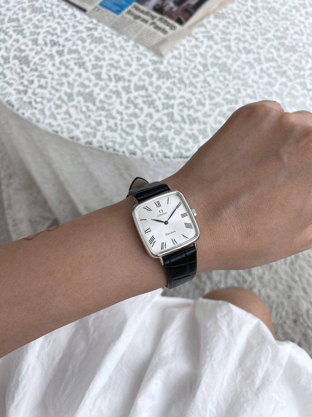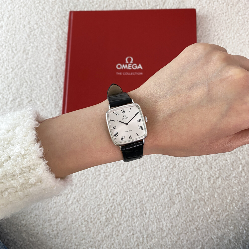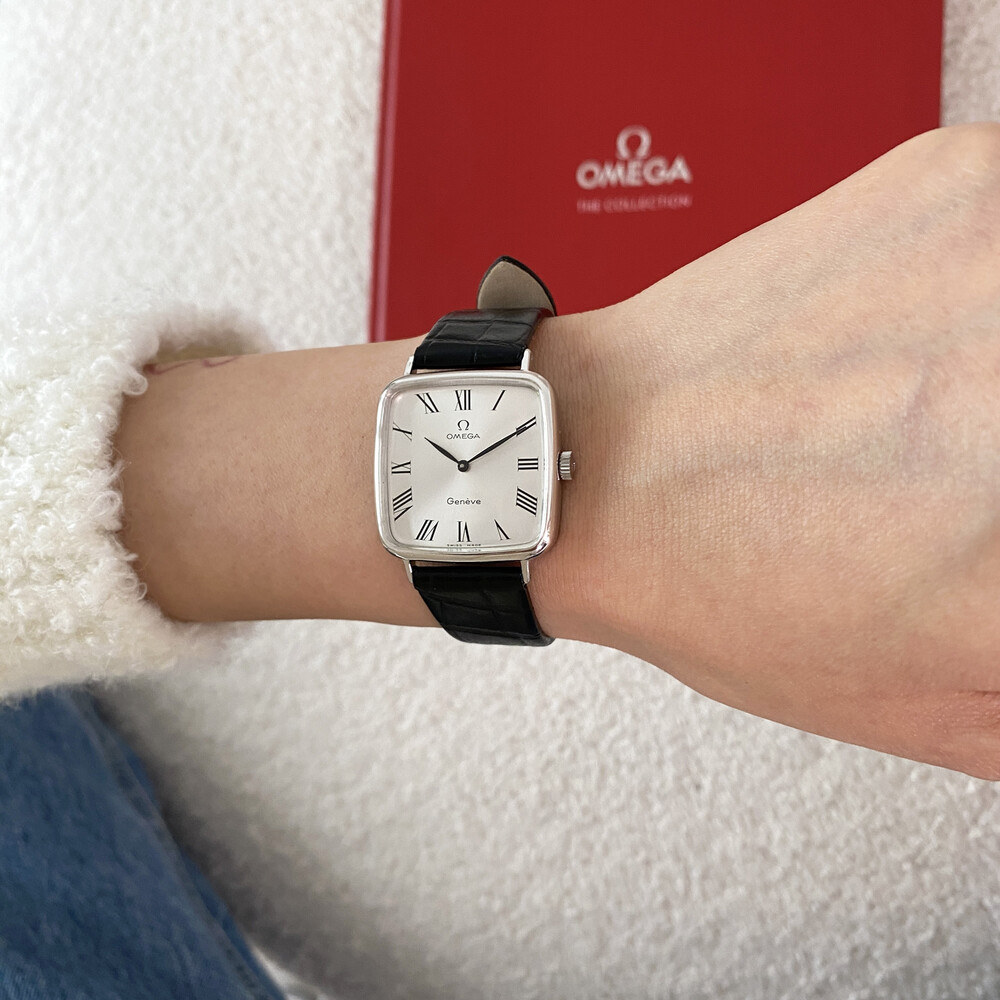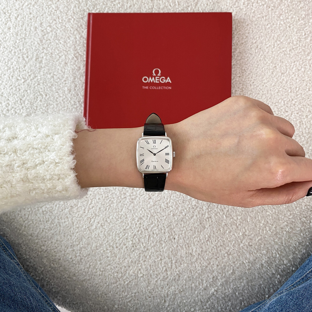 1974년도에 제작된 오메가 제네브 모델로 부드러운 곡선의 스퀘어 타입의 실버 케이스,