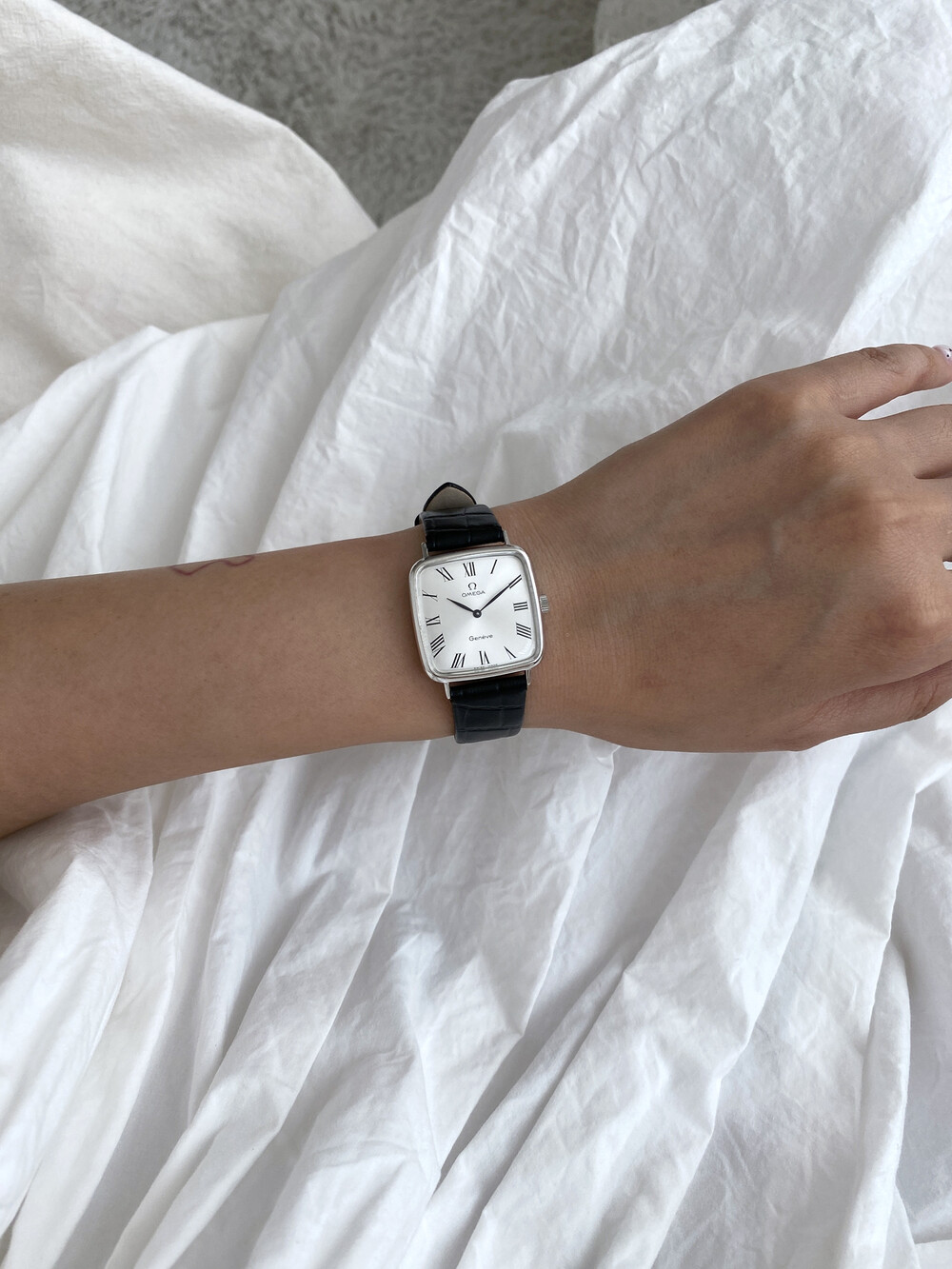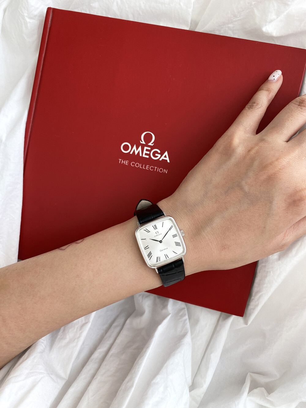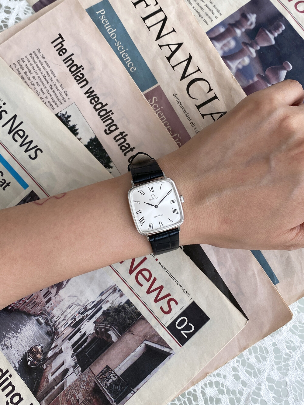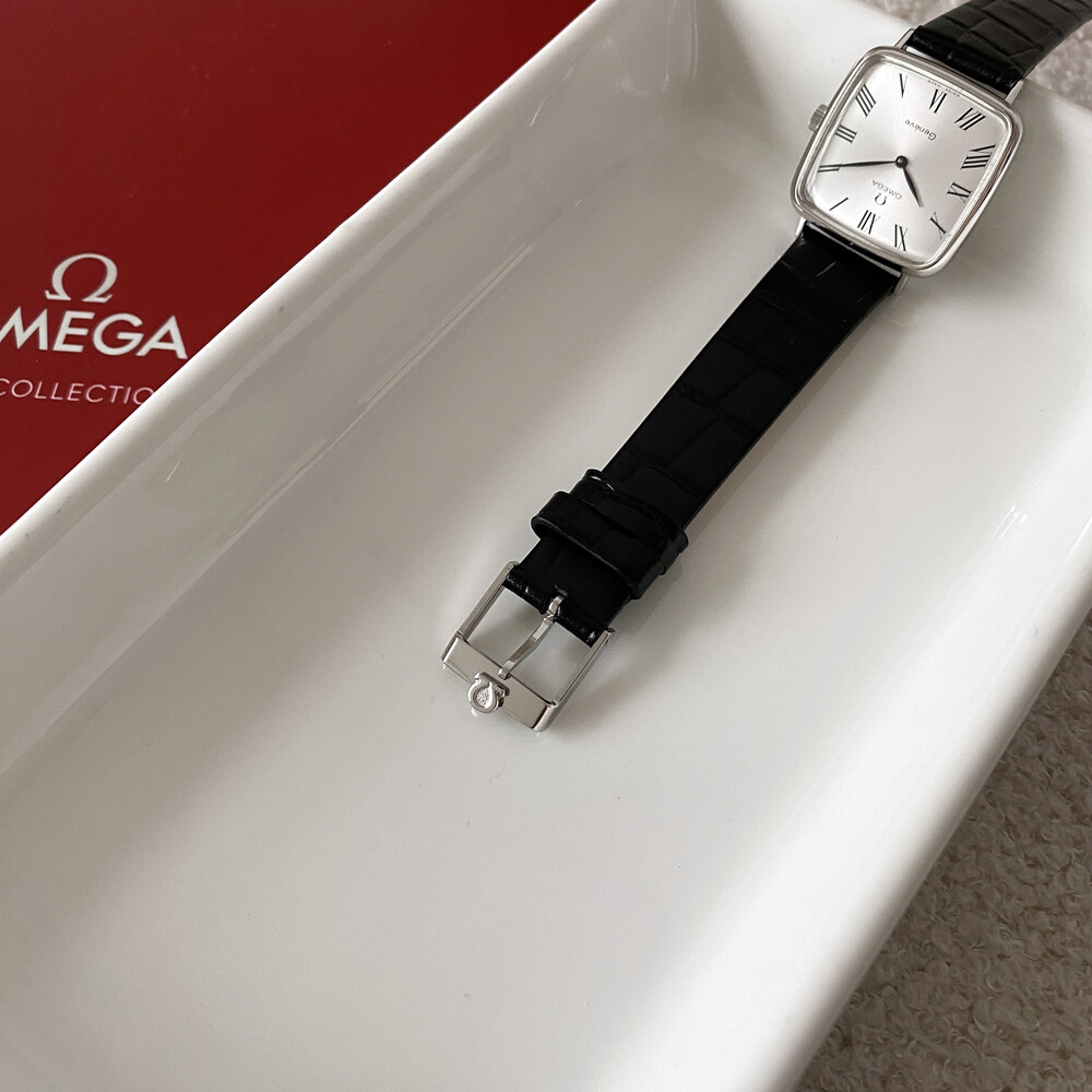 1974년도에 제작된 오메가 제네브 모델로 부드러운 곡선의 스퀘어 타입의 실버 케이스,