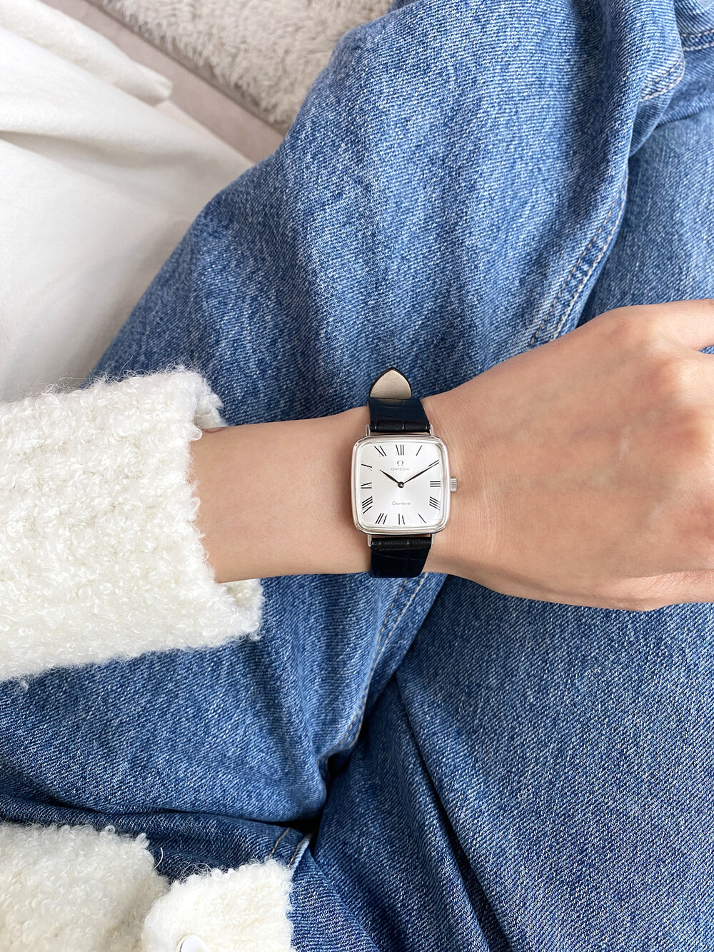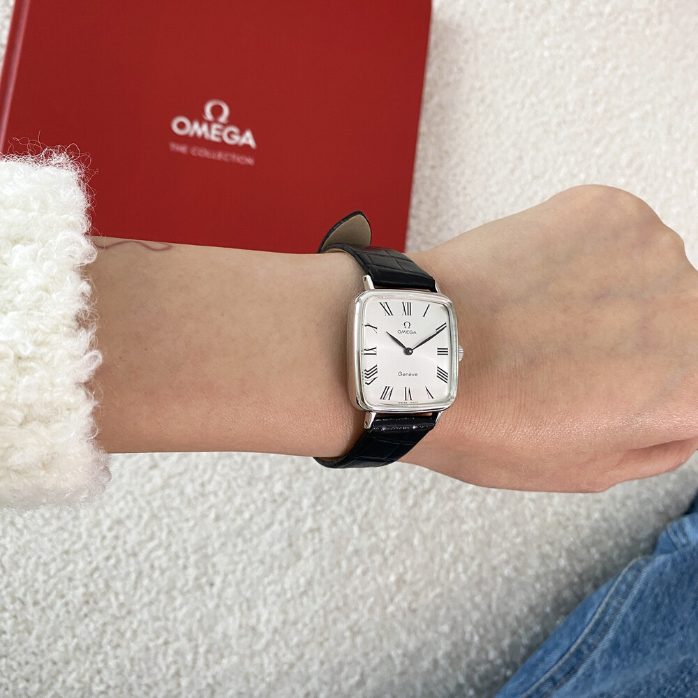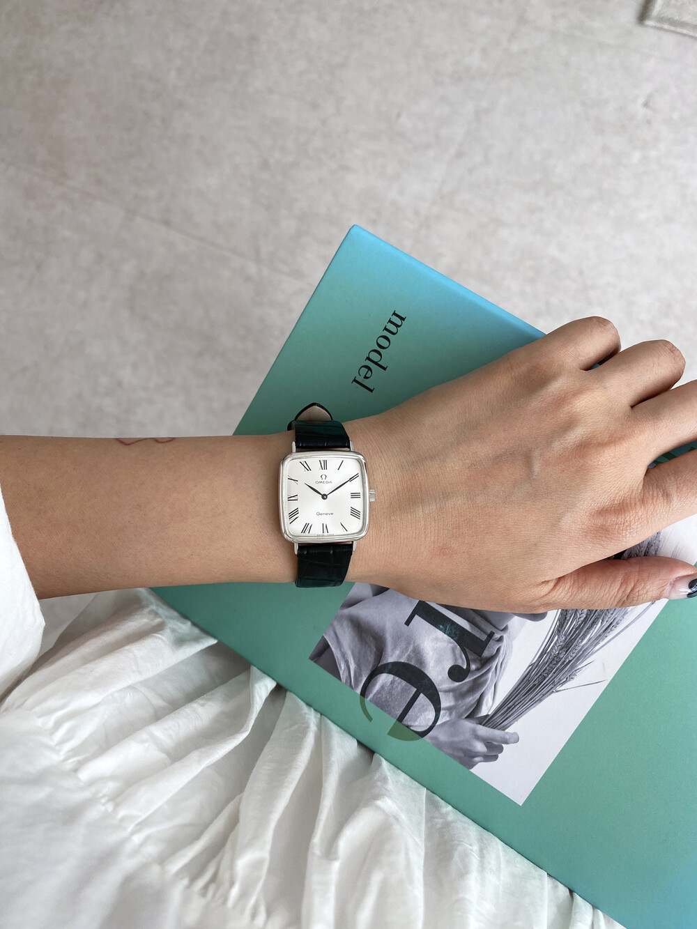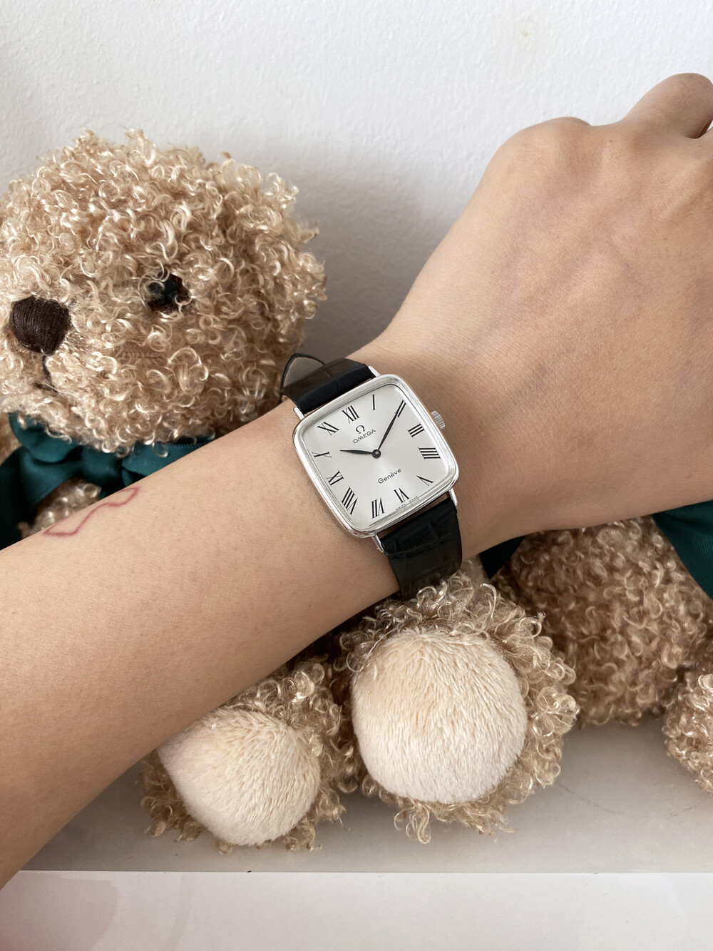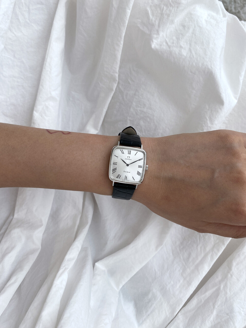 1974년도에 제작된 오메가 제네브 모델로 부드러운 곡선의 스퀘어 타입의 실버 케이스,