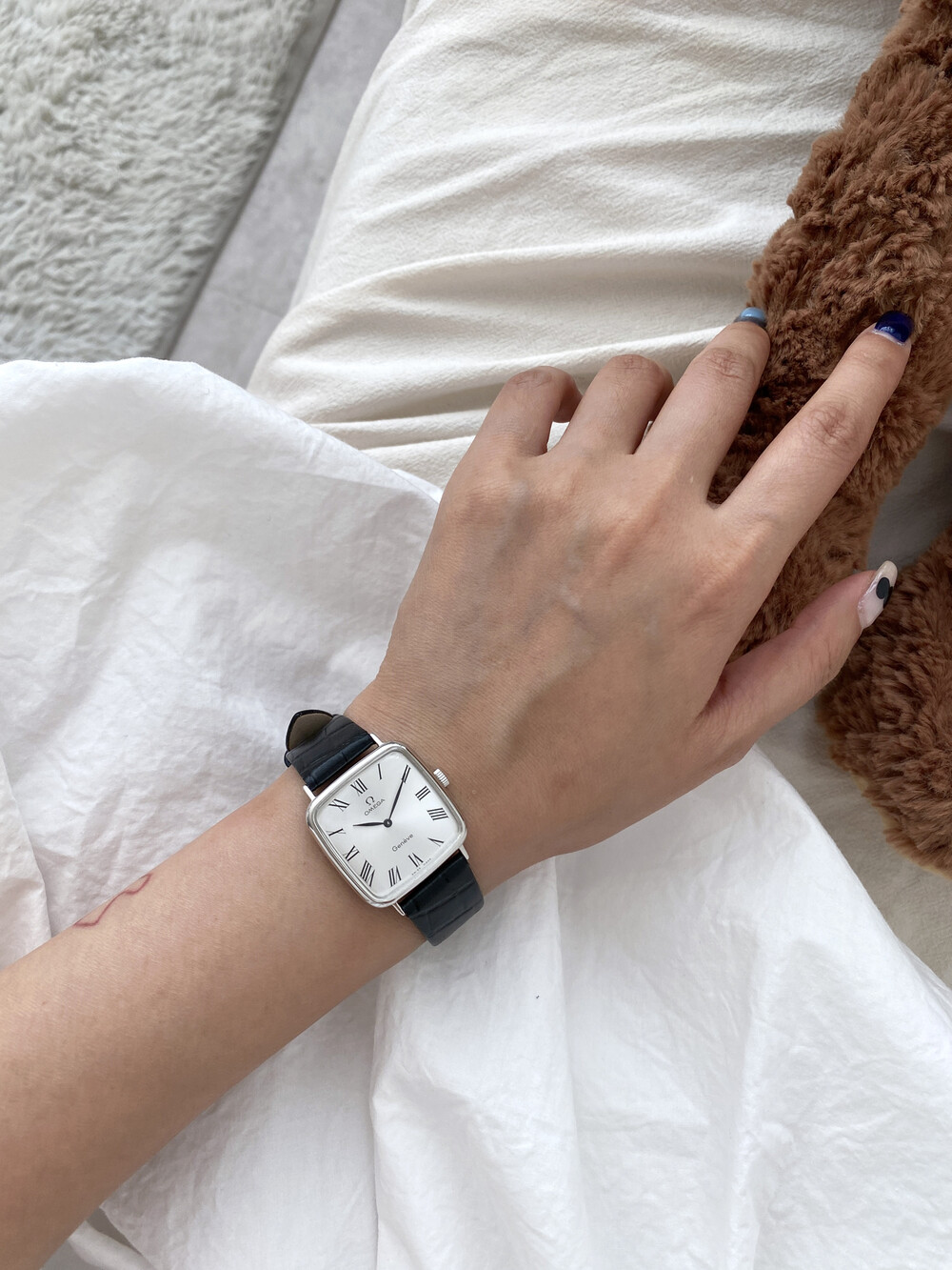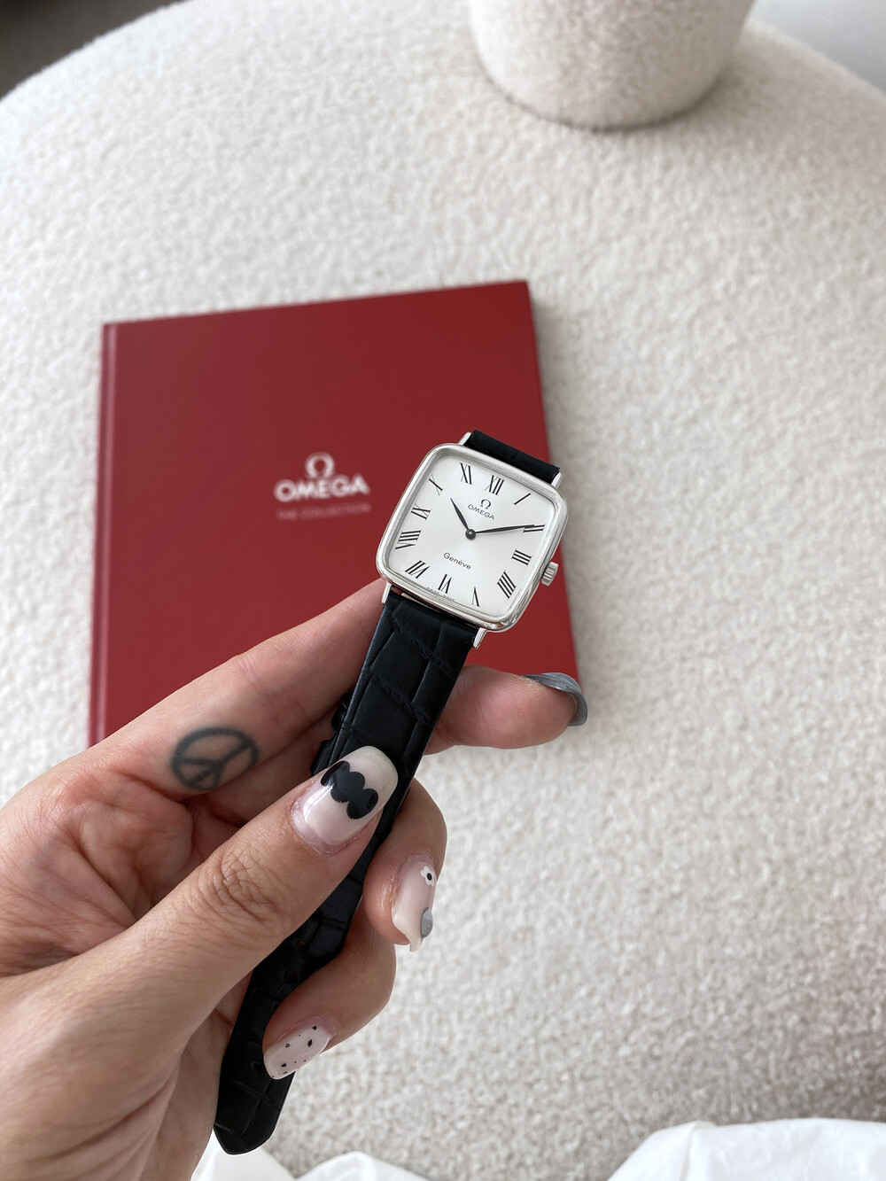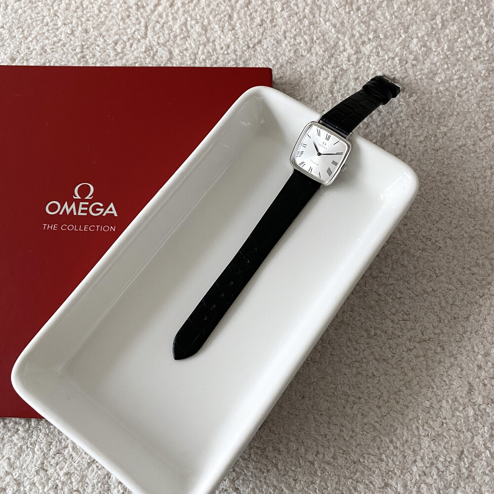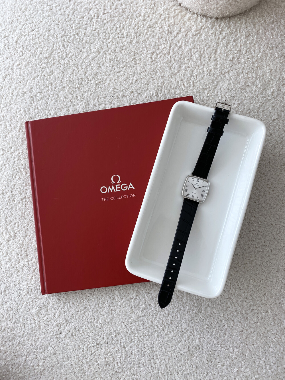 1974년도에 제작된 오메가 제네브 모델로 부드러운 곡선의 스퀘어 타입의 실버 케이스,
