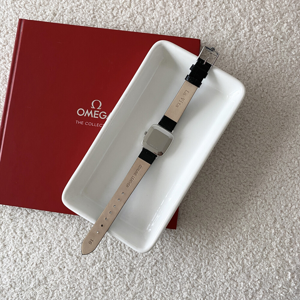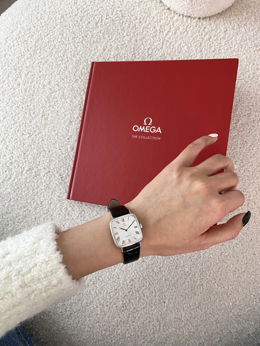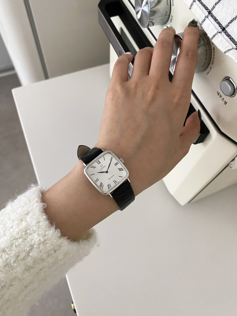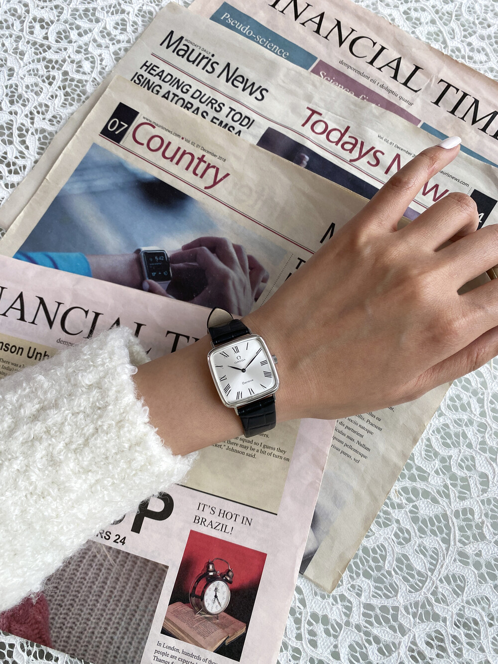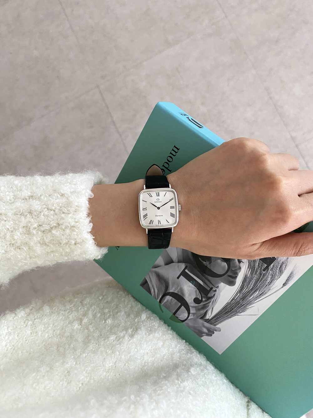 1974년도에 제작된 오메가 제네브 모델로 부드러운 곡선의 스퀘어 타입의 실버 케이스,