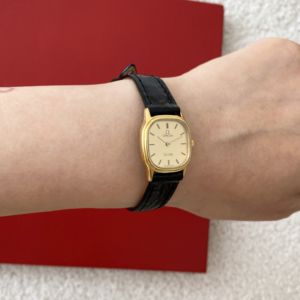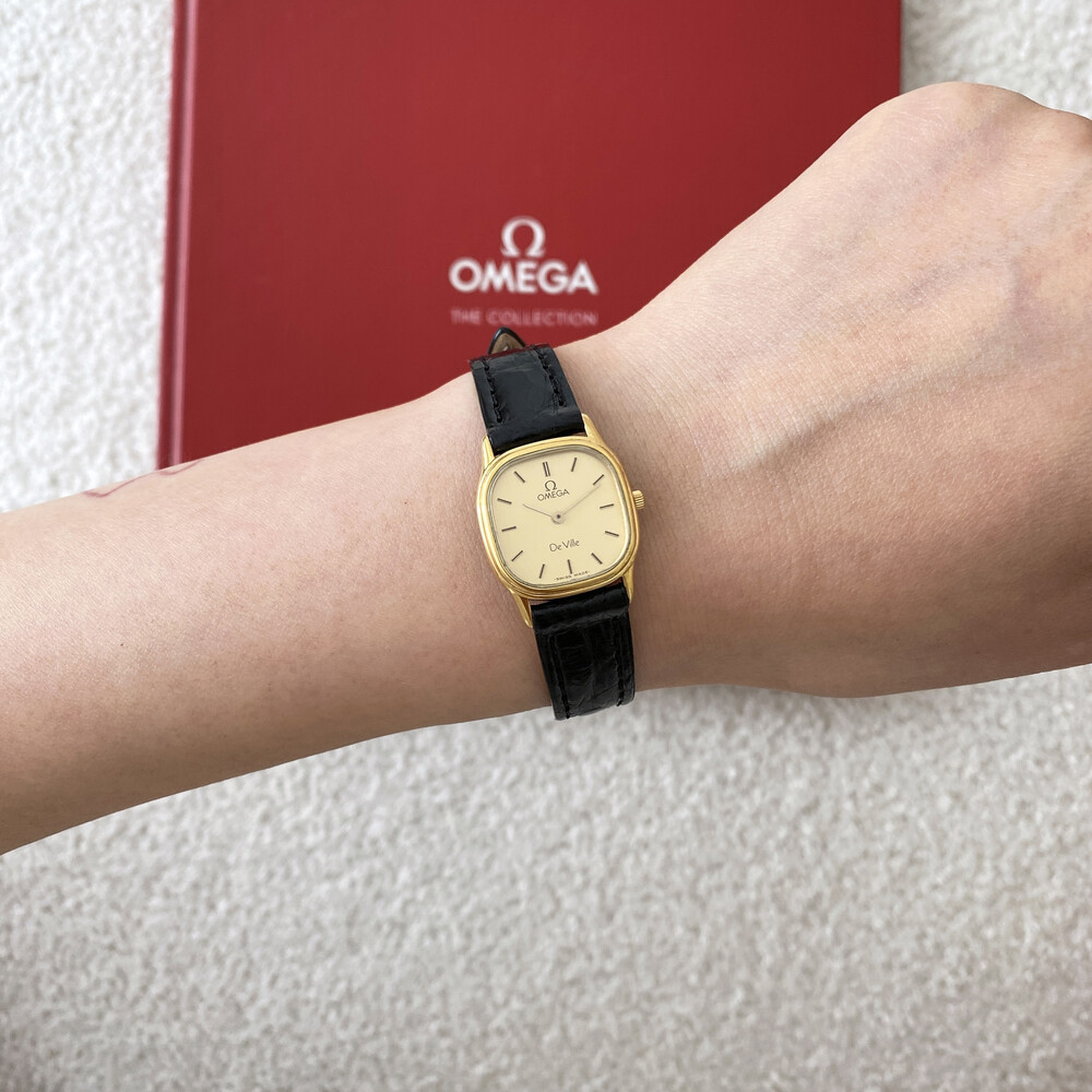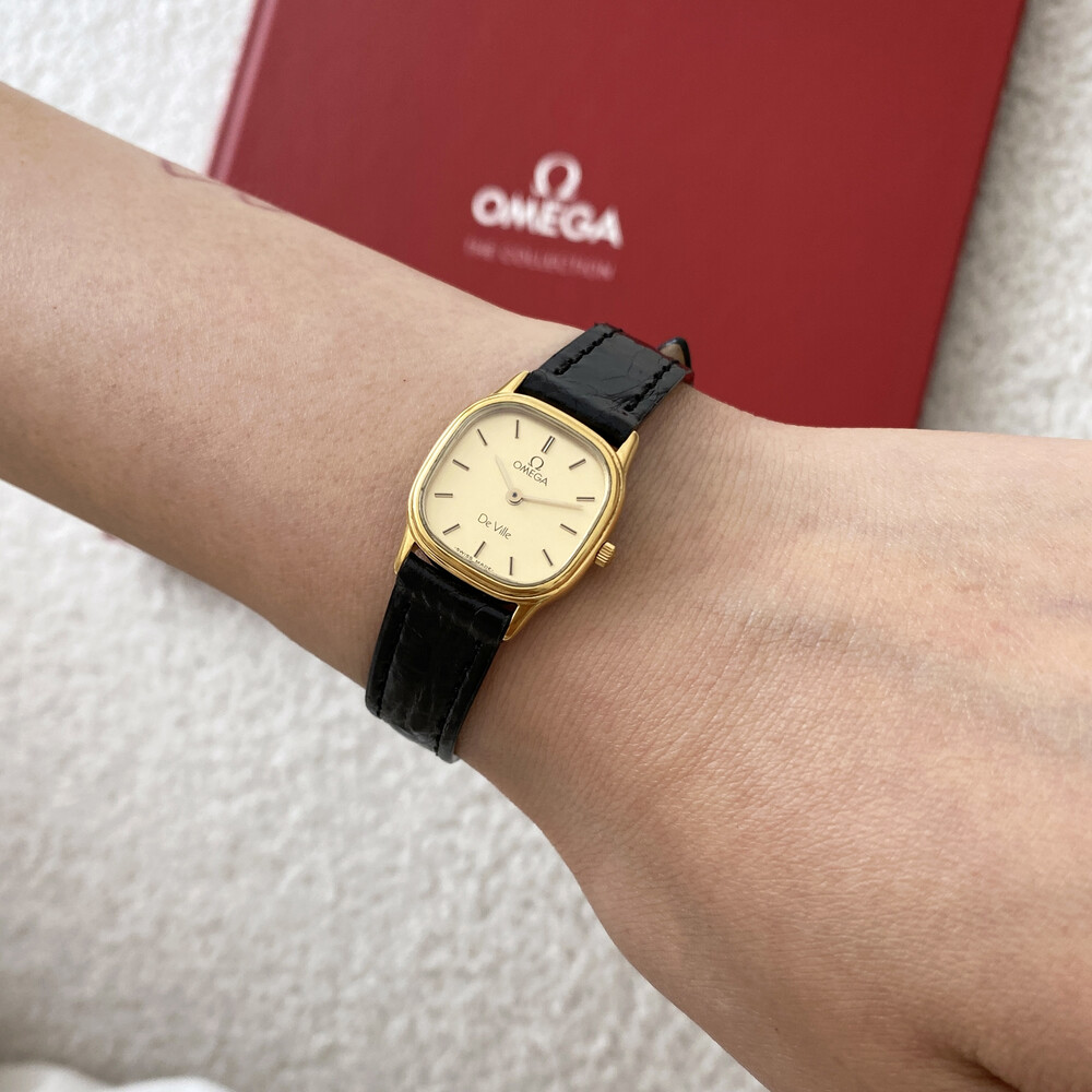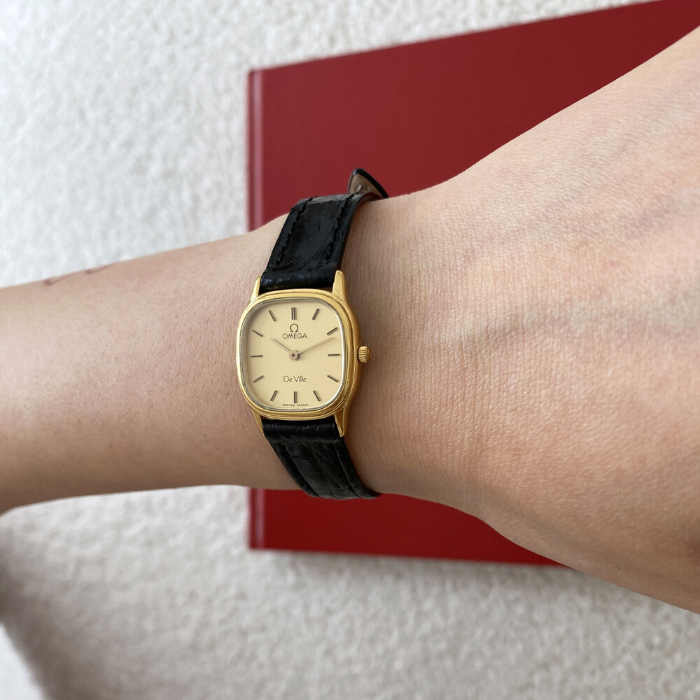 1986년에 제작된 오메가 드빌 모델로 골드톤 스퀘어 케이스와
