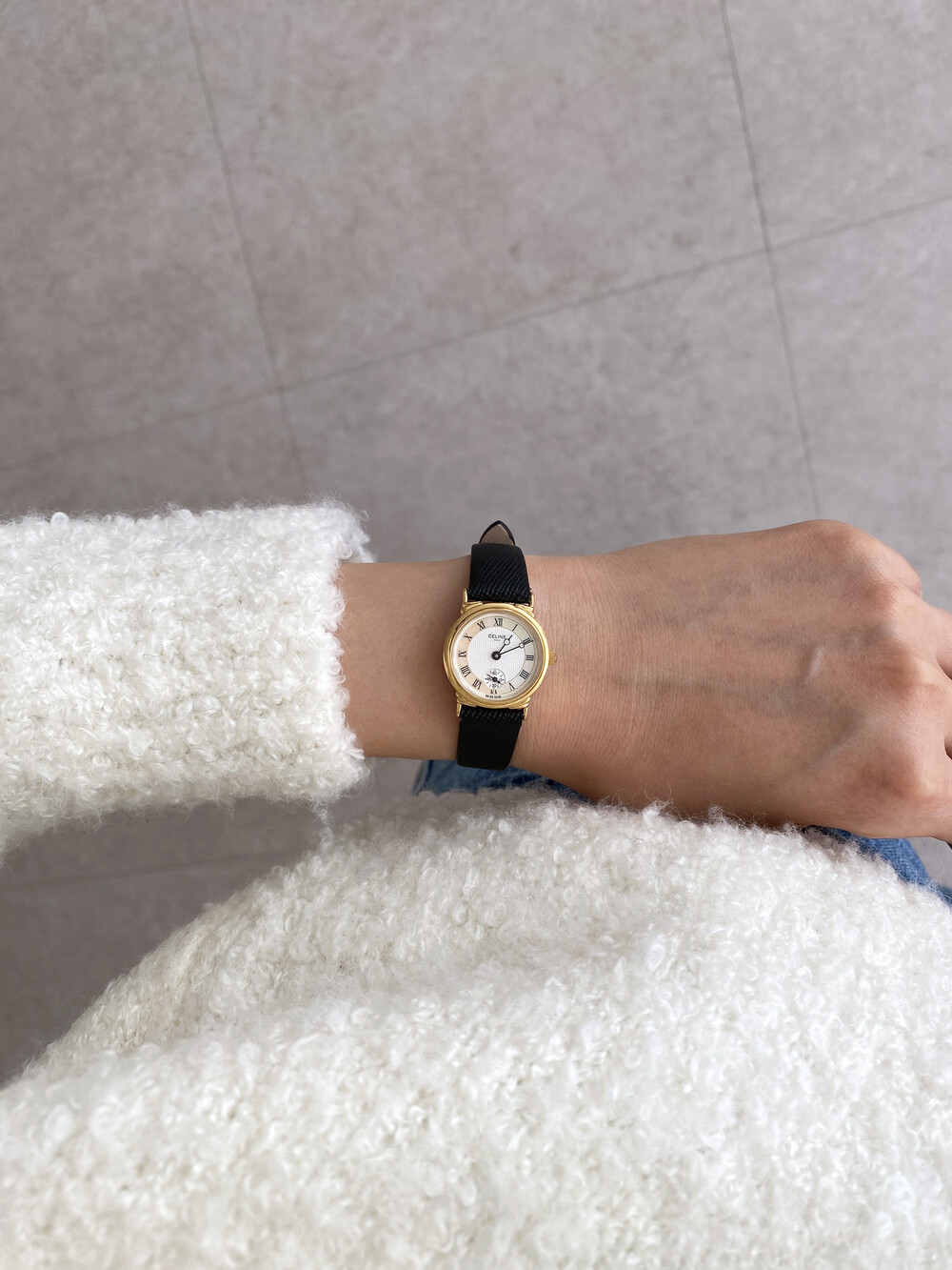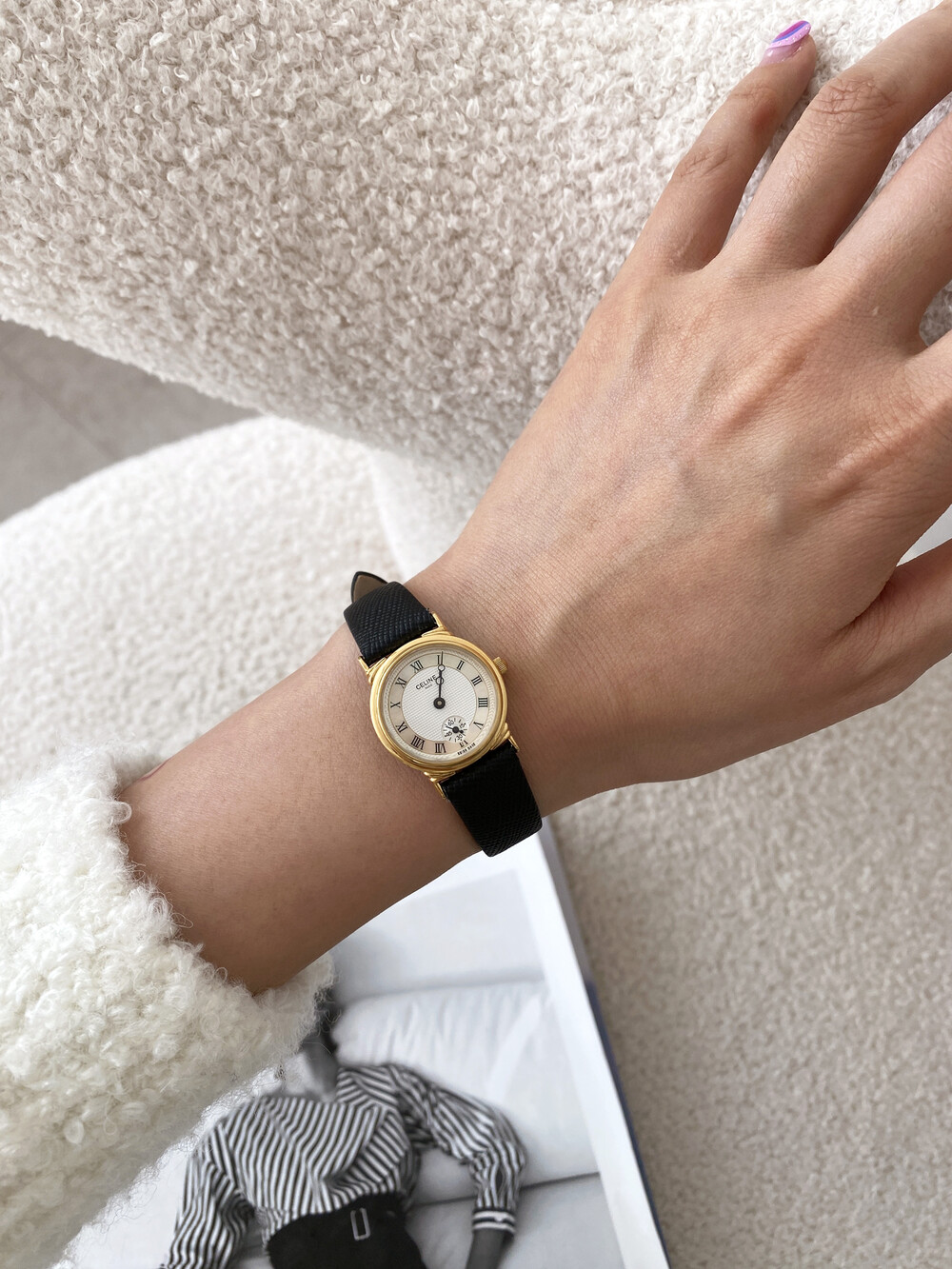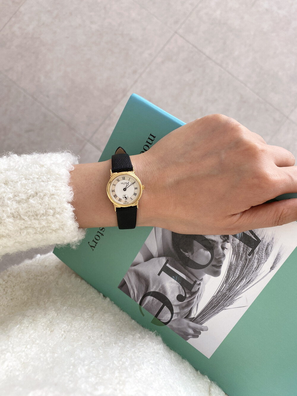 부드러운 골드 톤 라운드 케이스와 엠보 다이얼 위를 장식하는 자개 장식이 매력적인 모델입니다.