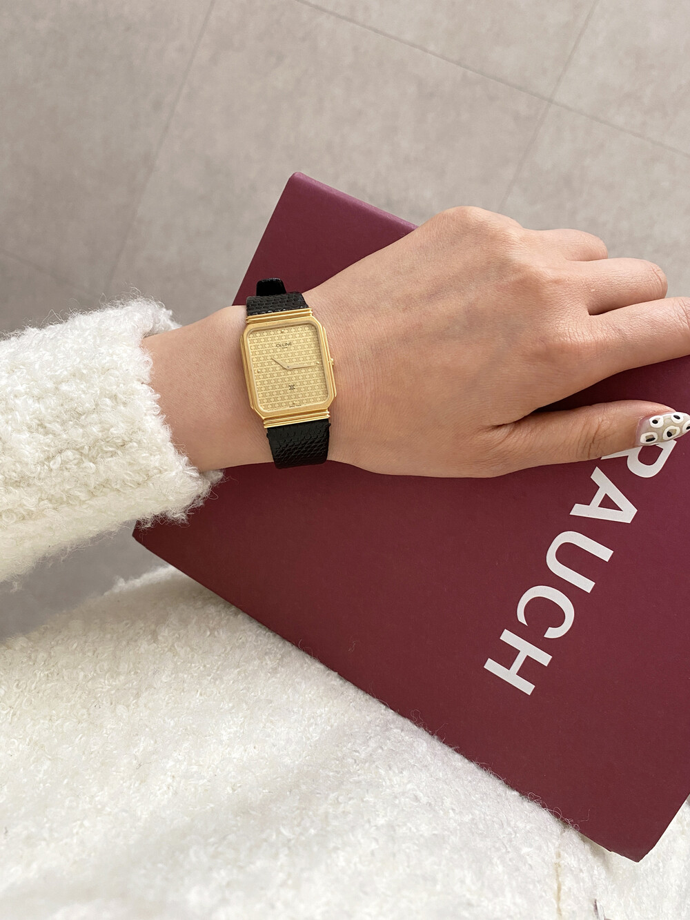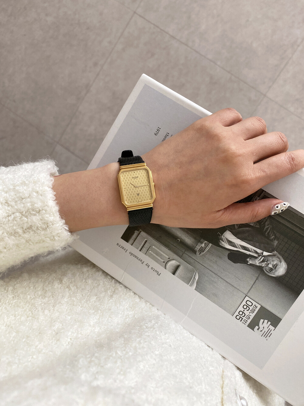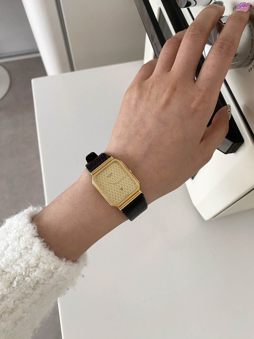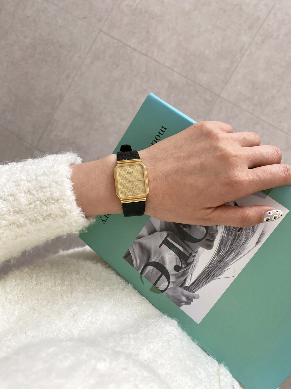 부드러운 골드 톤 스퀘어 케이스와 다이얼 위를 장식하는