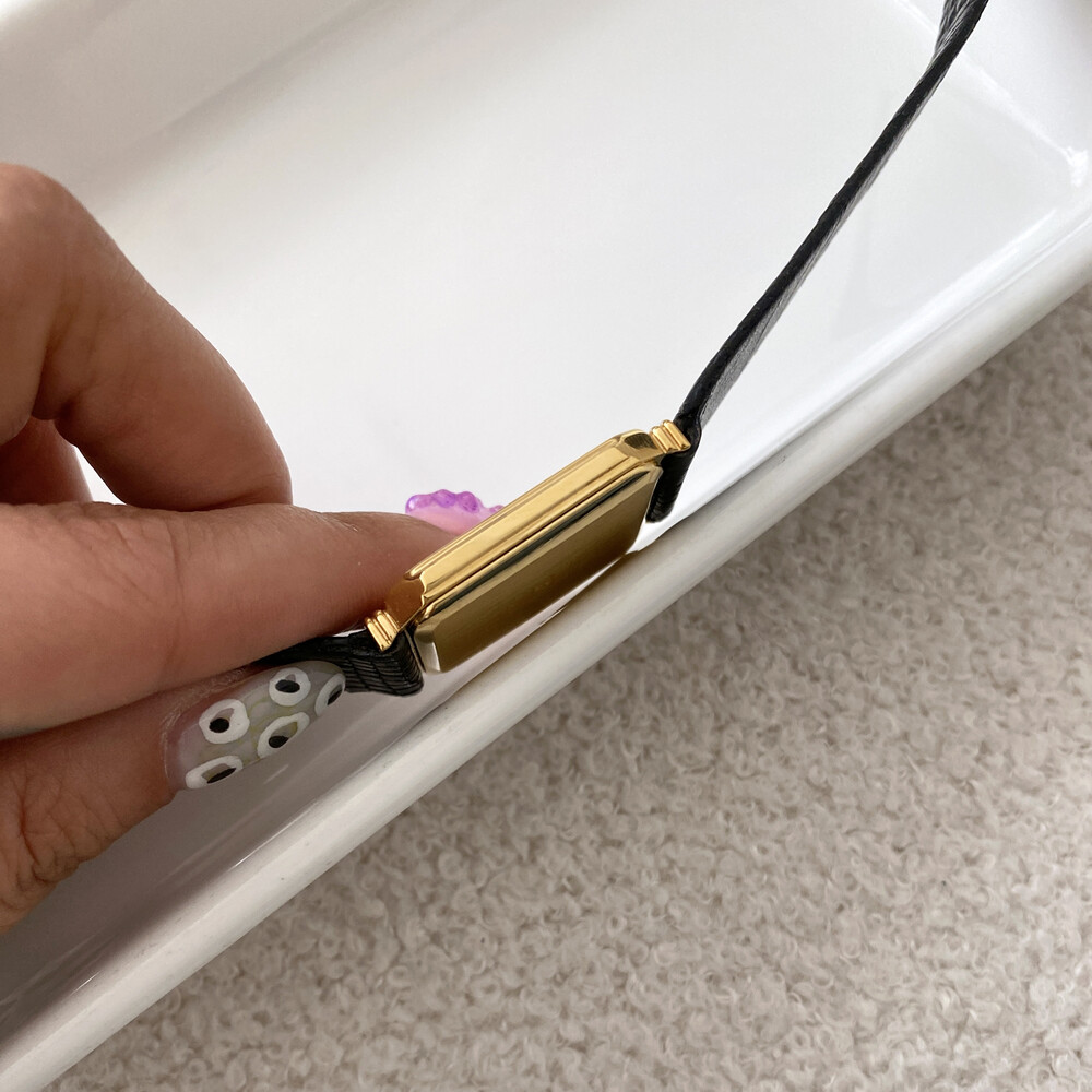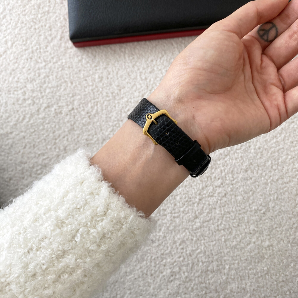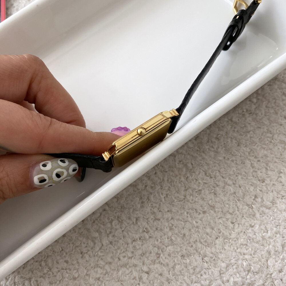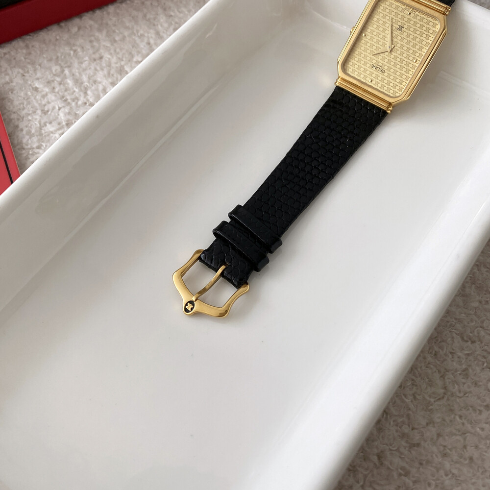 부드러운 골드 톤 스퀘어 케이스와 다이얼 위를 장식하는