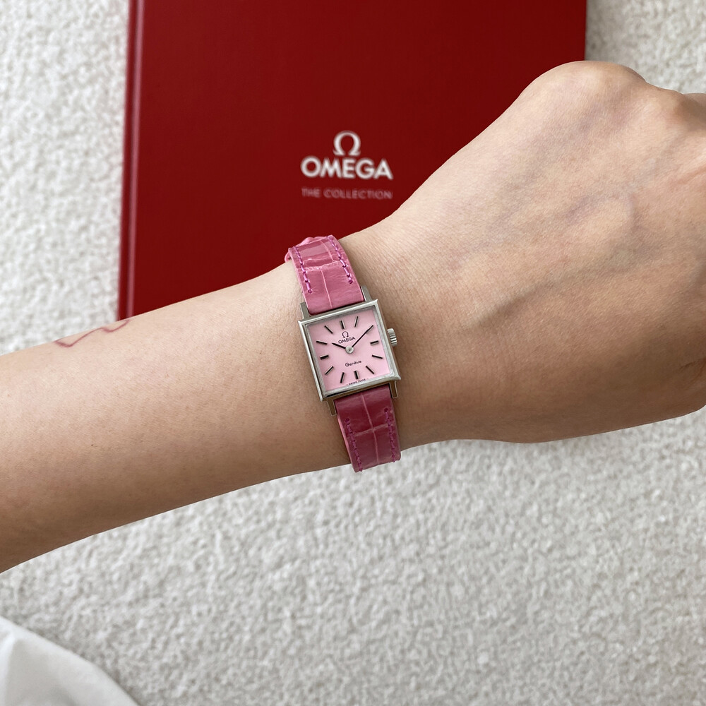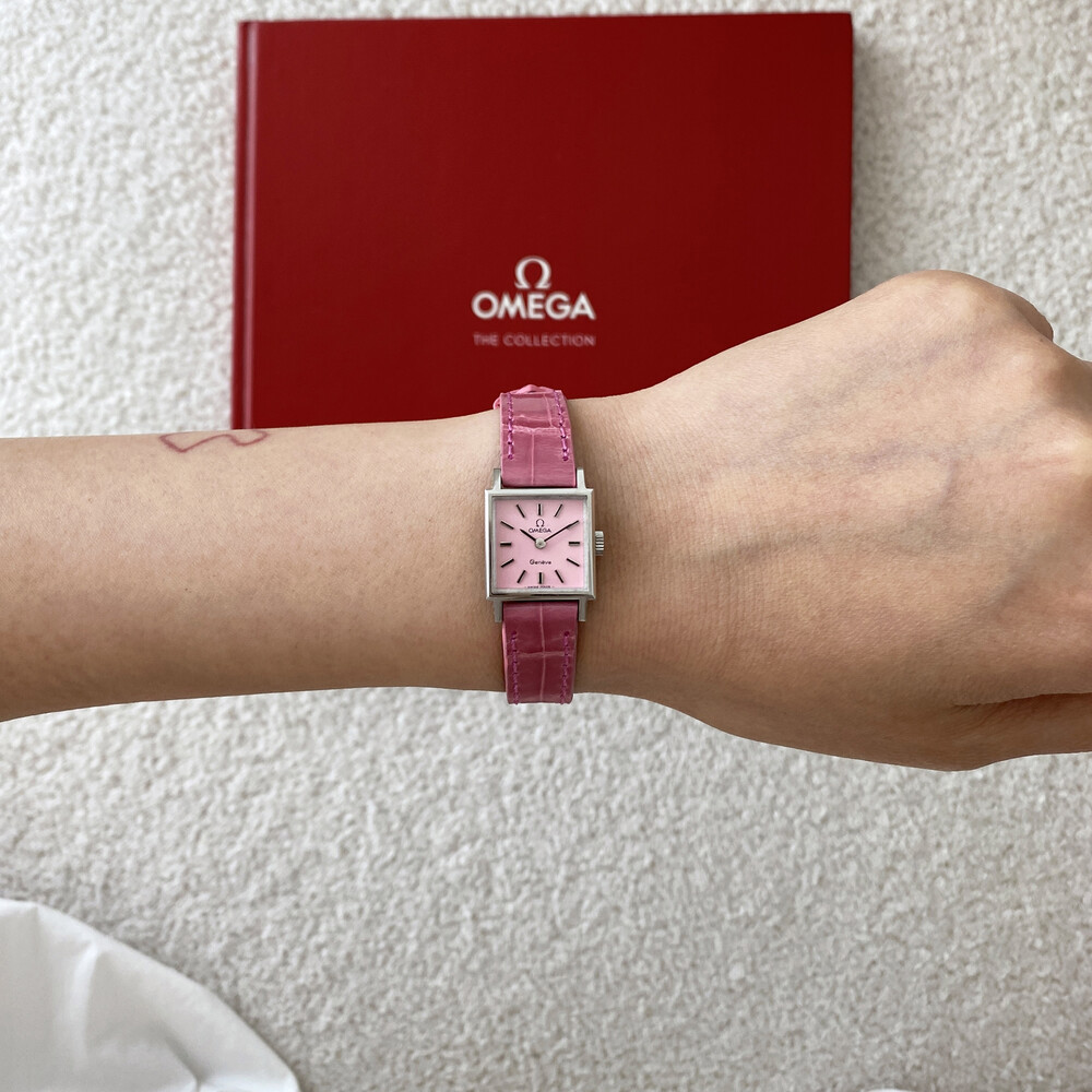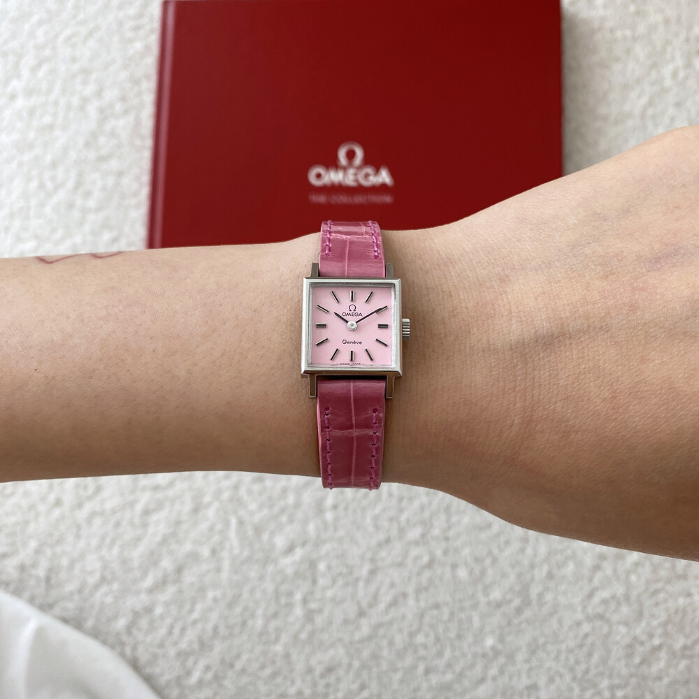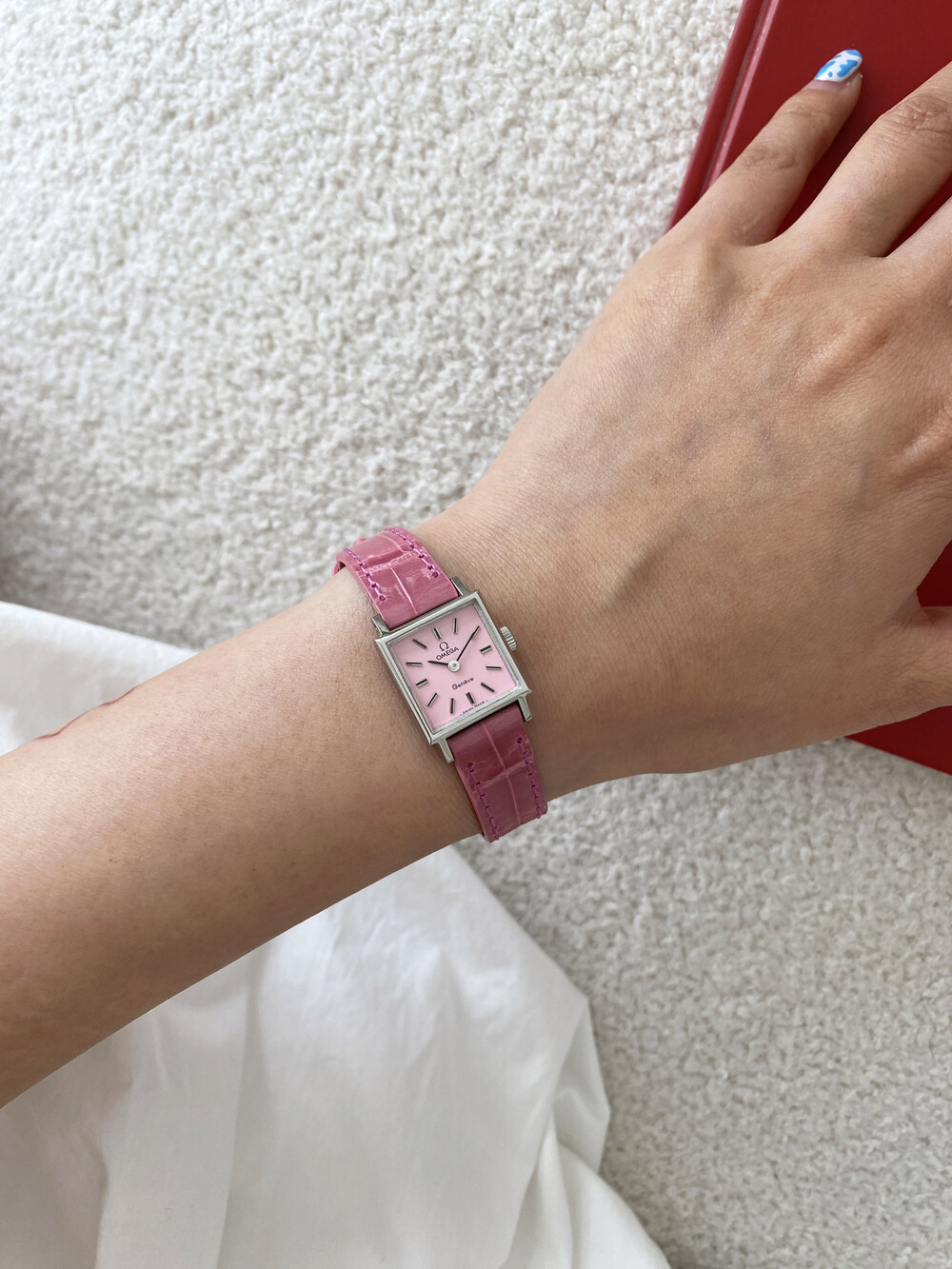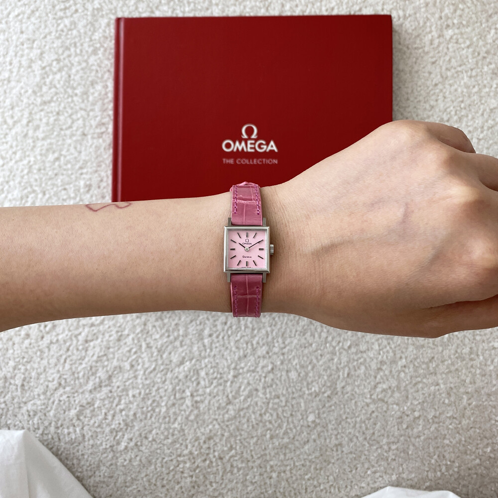 1974년도에 제작된 여성용 오메가 제네브 모델로 스퀘어 타입의 실버 케이스와