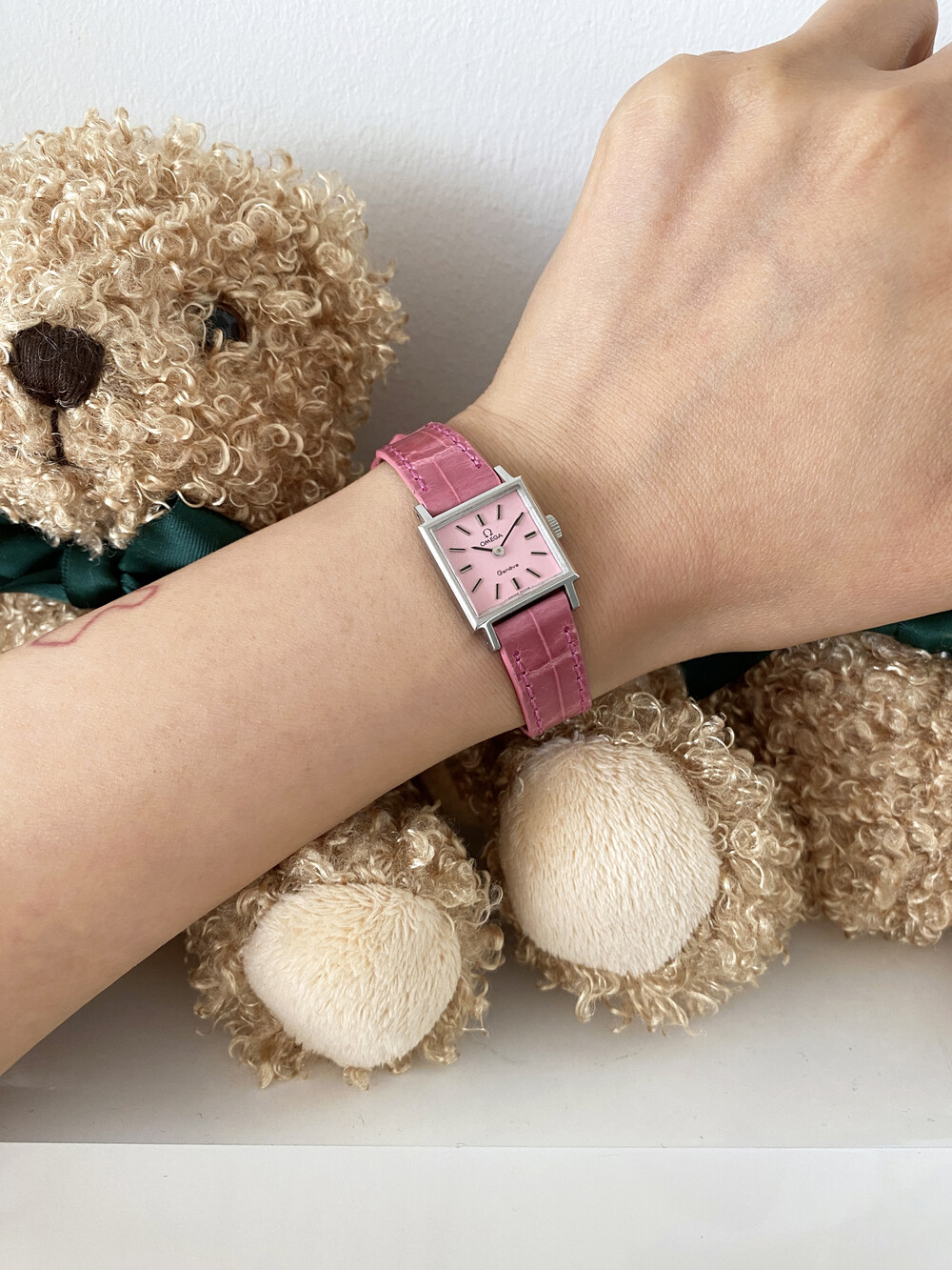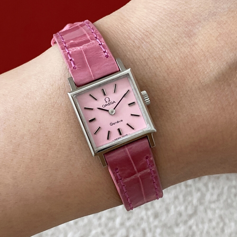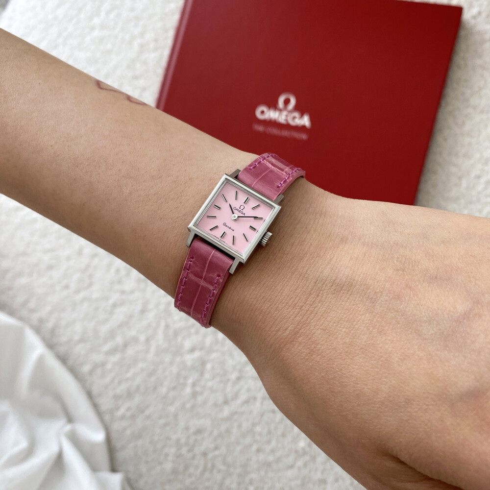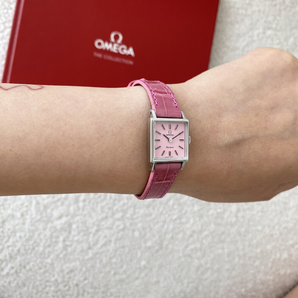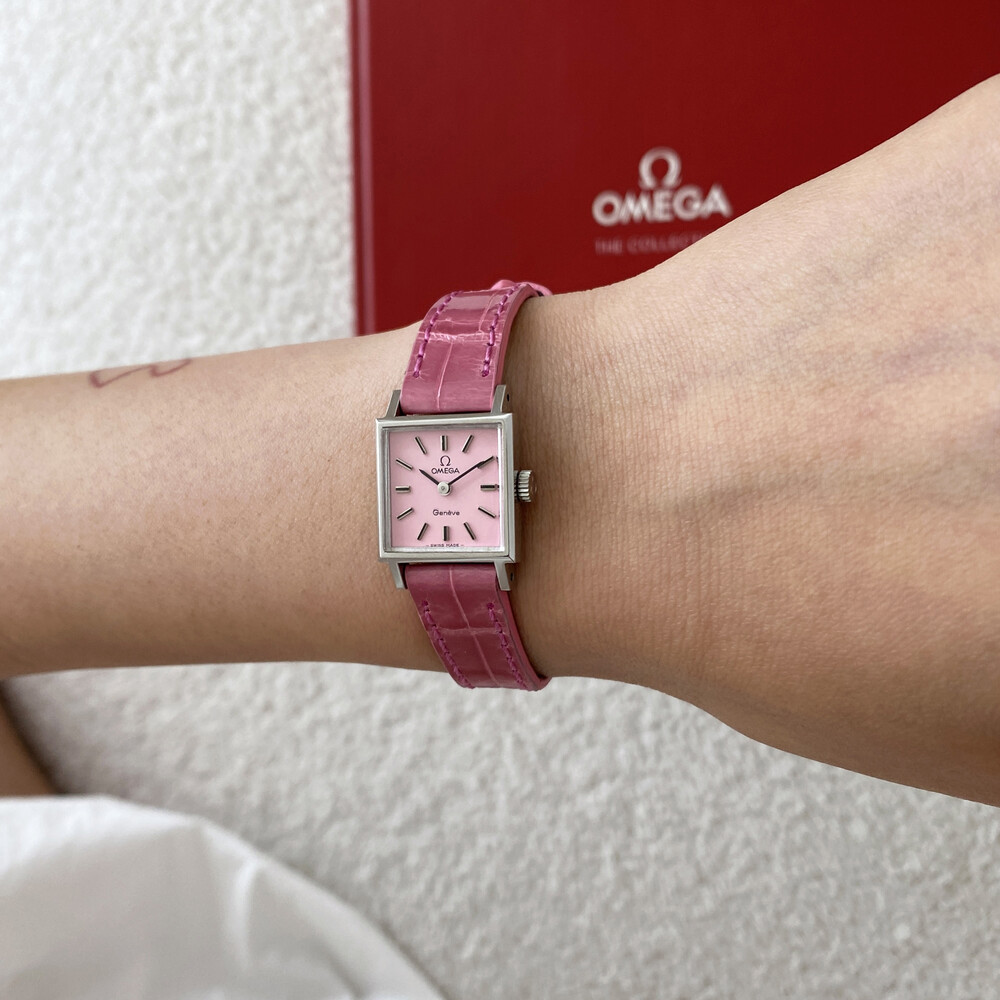 1974년도에 제작된 여성용 오메가 제네브 모델로 스퀘어 타입의 실버 케이스와