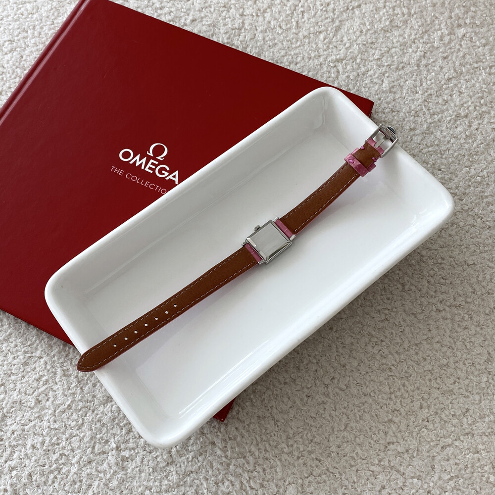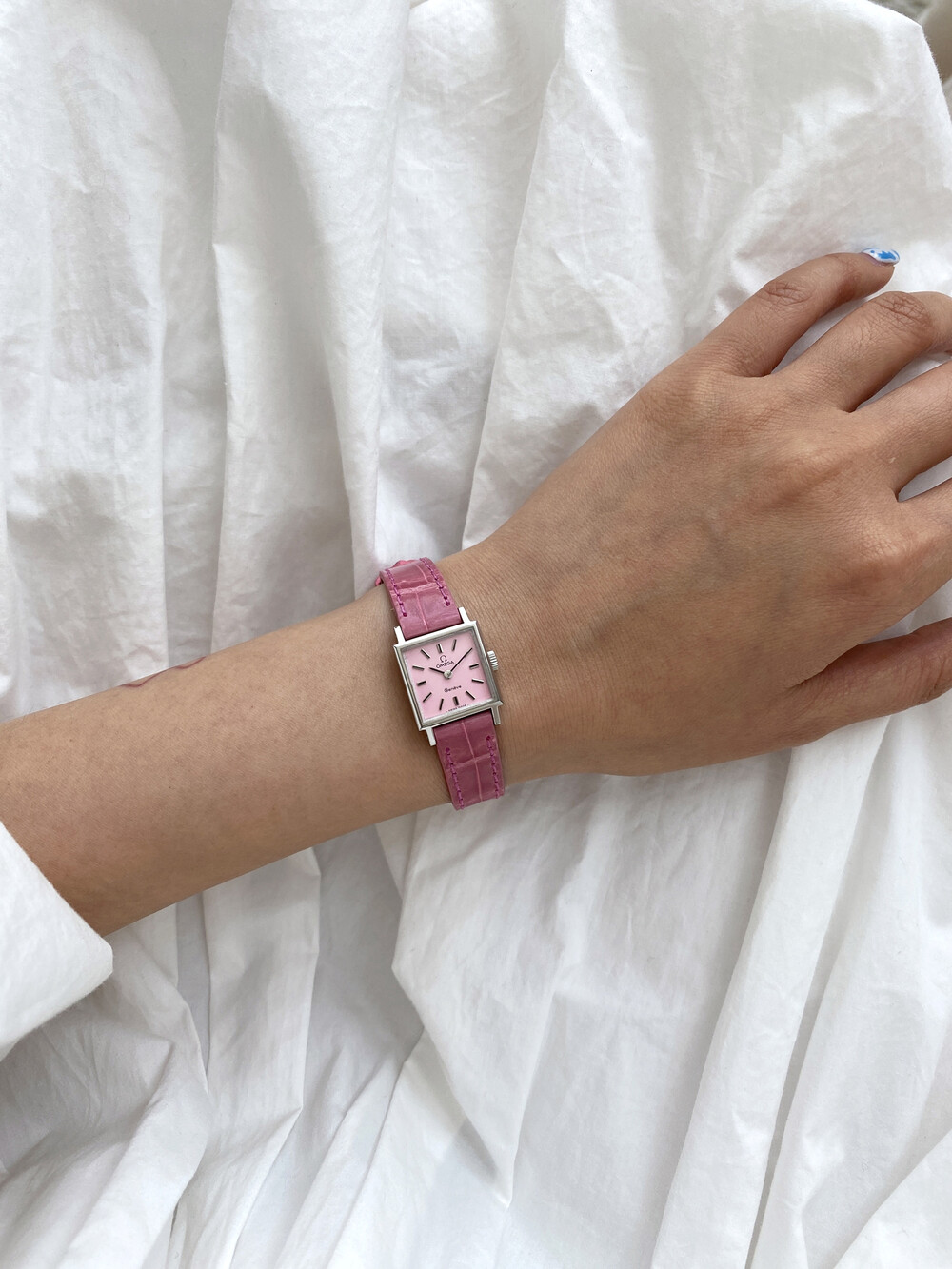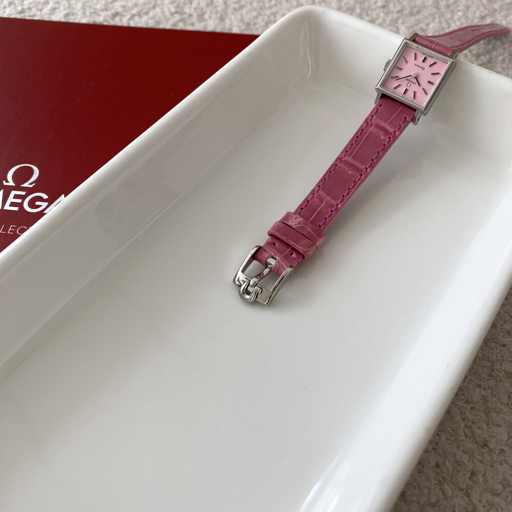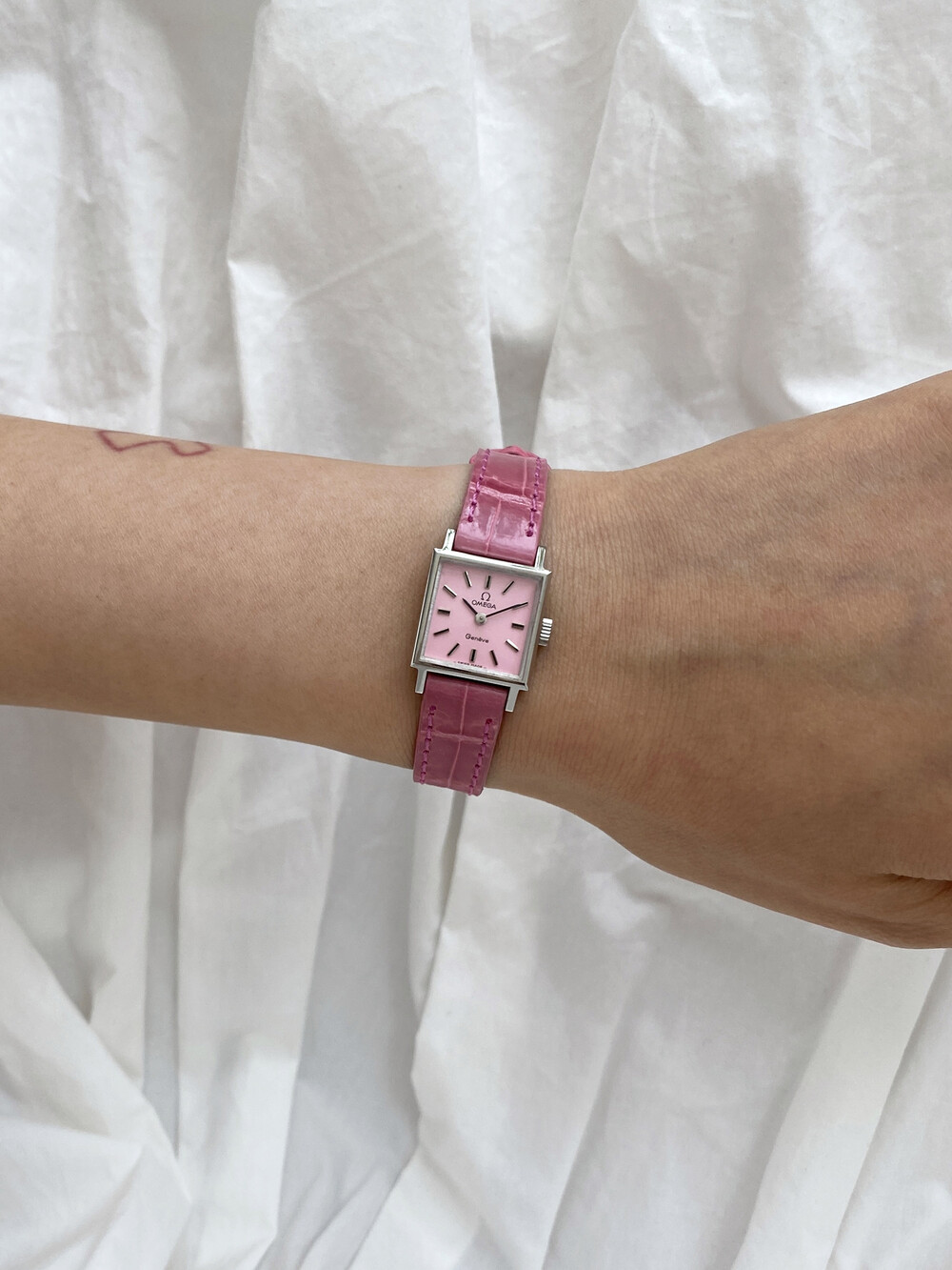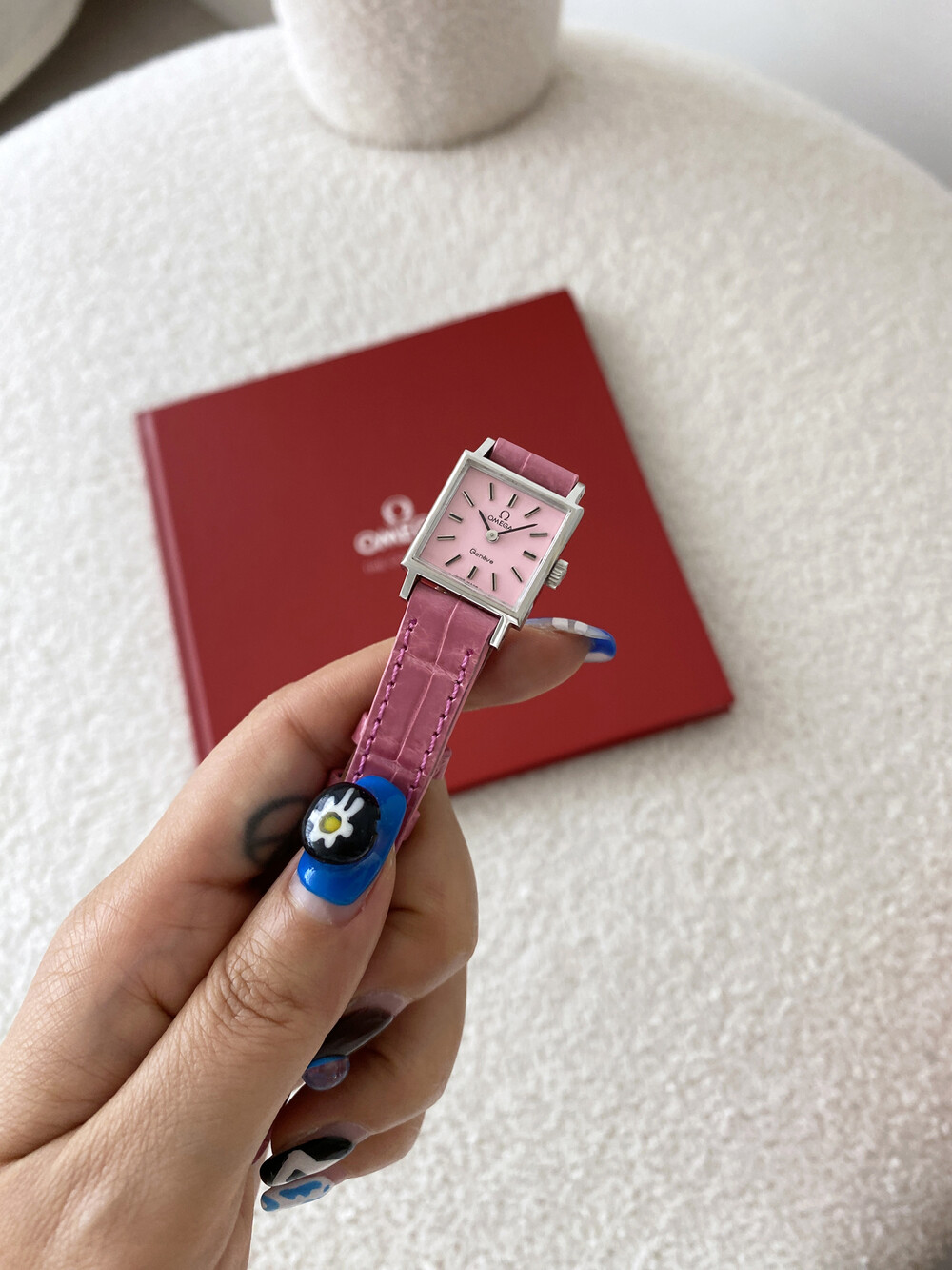 1974년도에 제작된 여성용 오메가 제네브 모델로 스퀘어 타입의 실버 케이스와