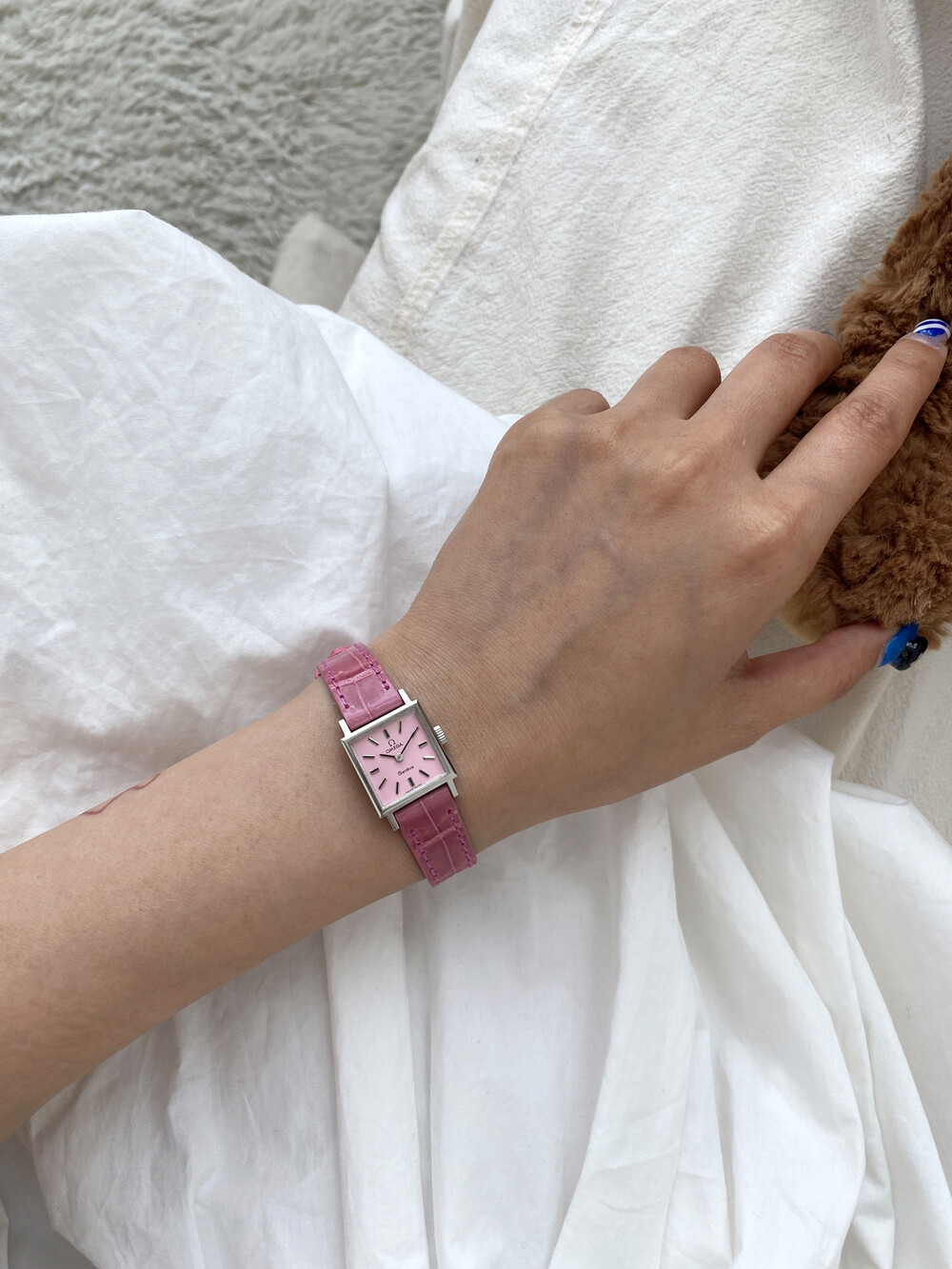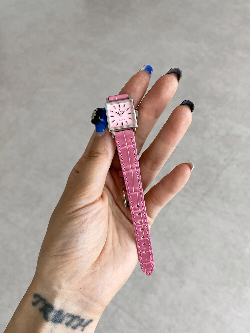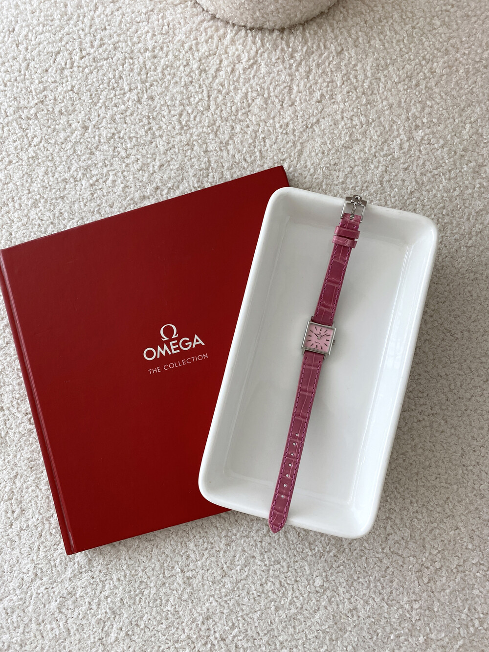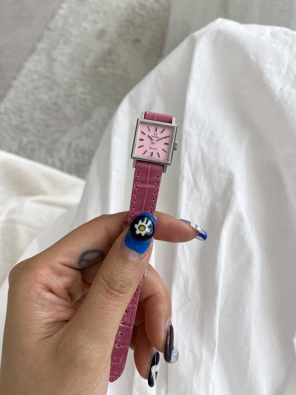1974년도에 제작된 여성용 오메가 제네브 모델로 스퀘어 타입의 실버 케이스와