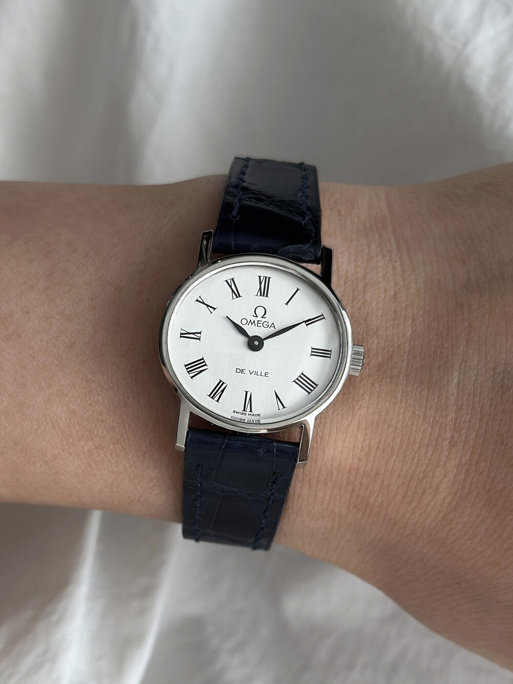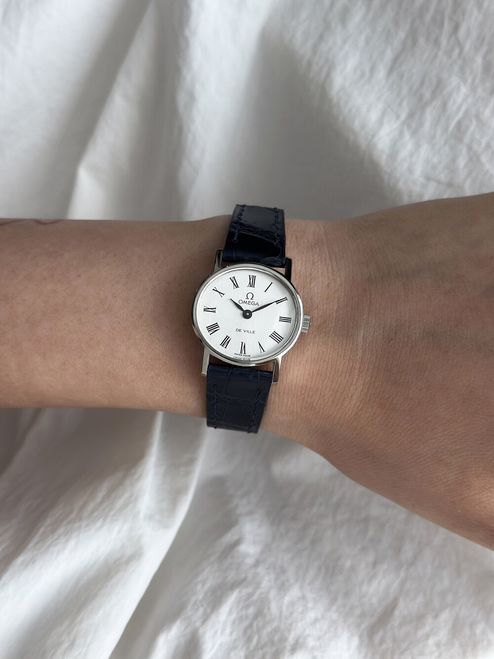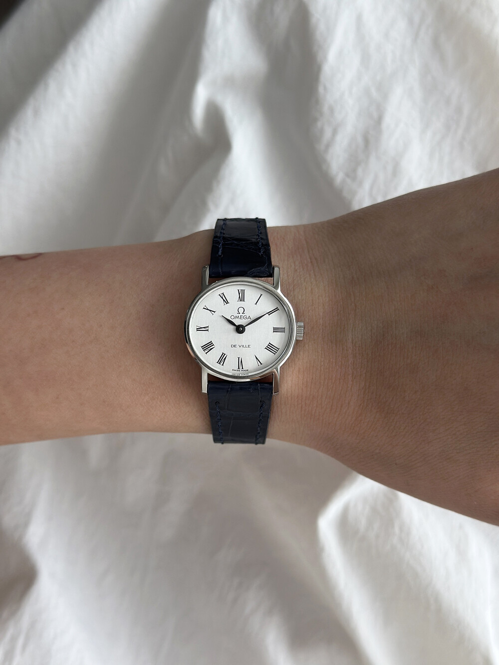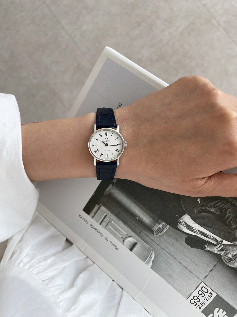 1975년도에 제작된 오메가 드빌 모델로 부드러운 곡선의 실버 케이스와