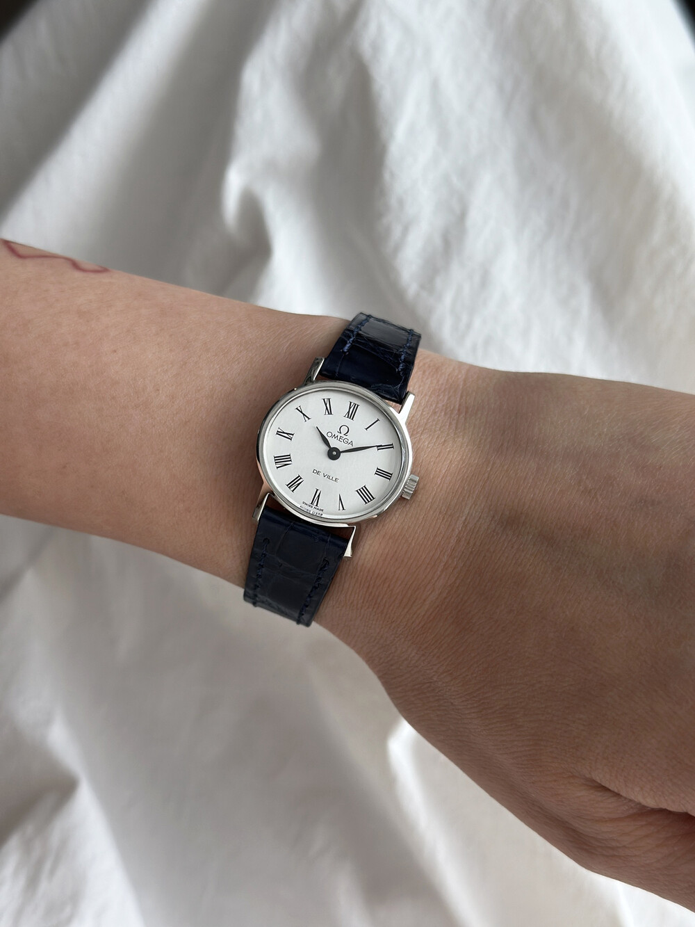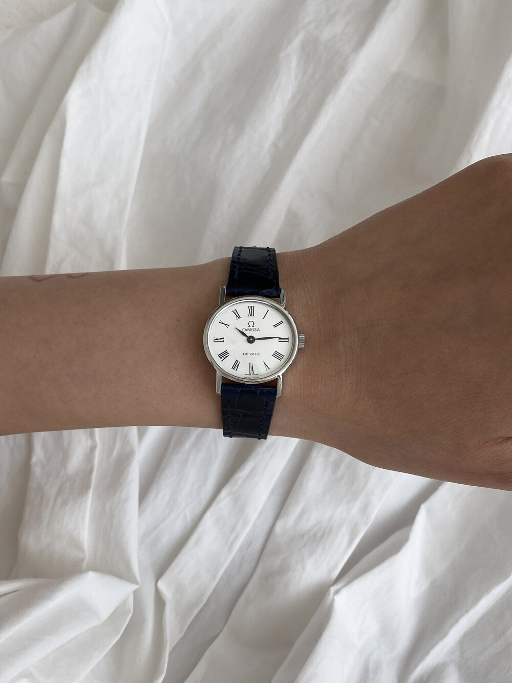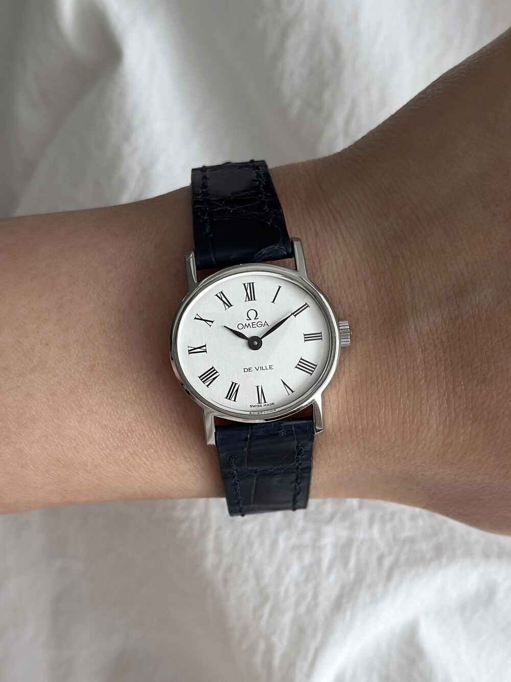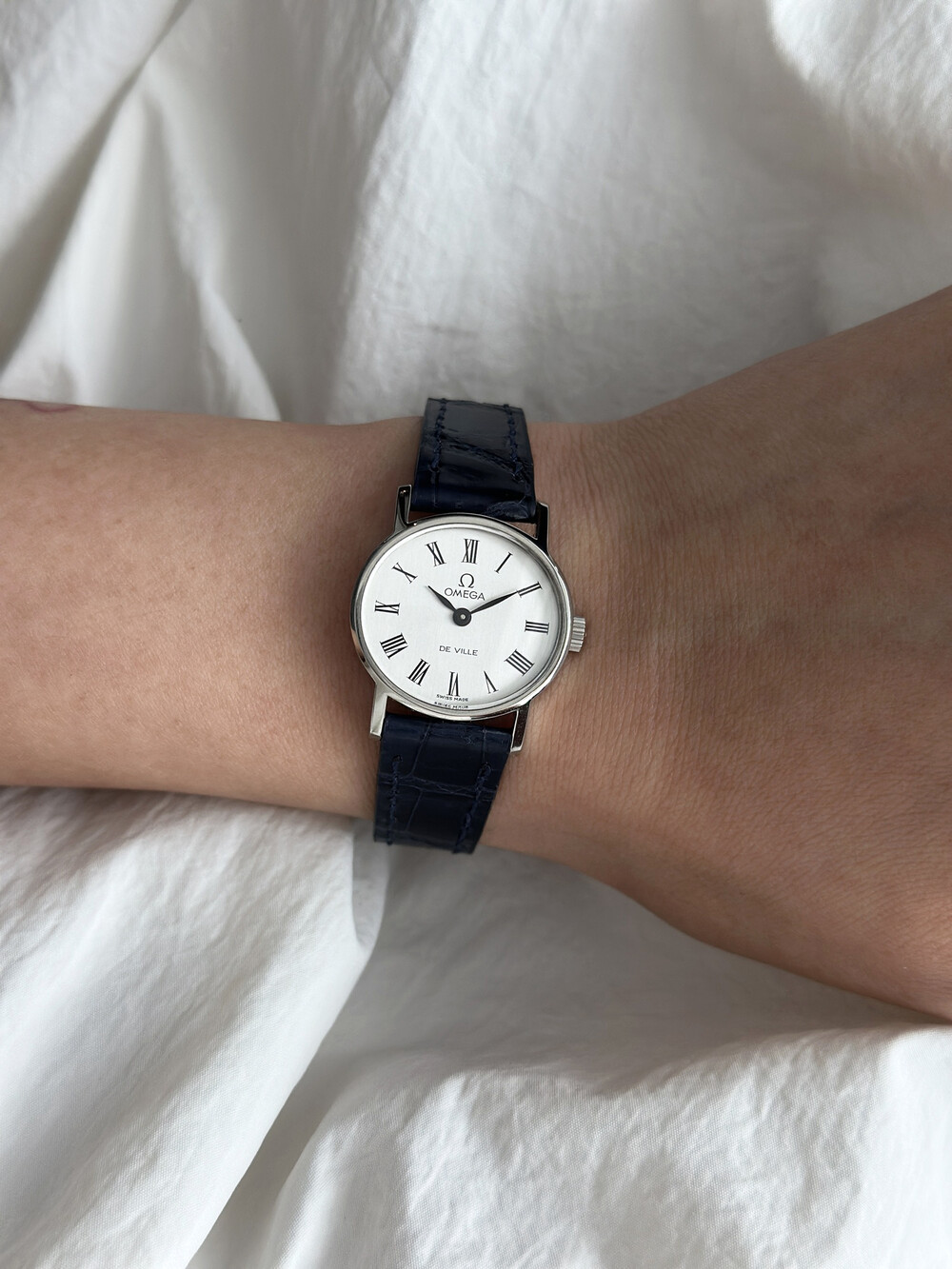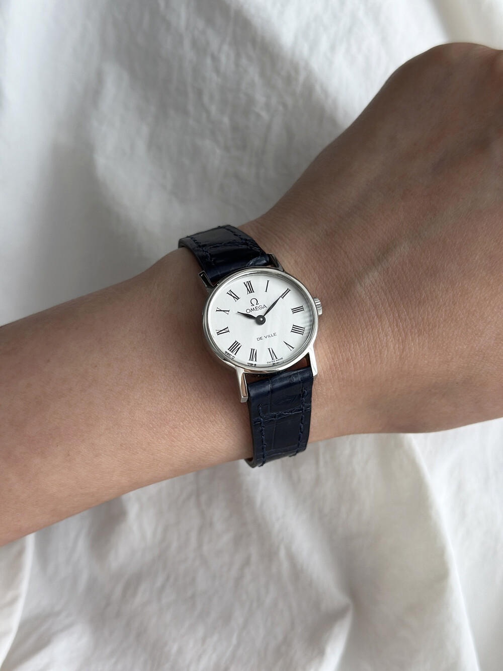1975년도에 제작된 오메가 드빌 모델로 부드러운 곡선의 실버 케이스와