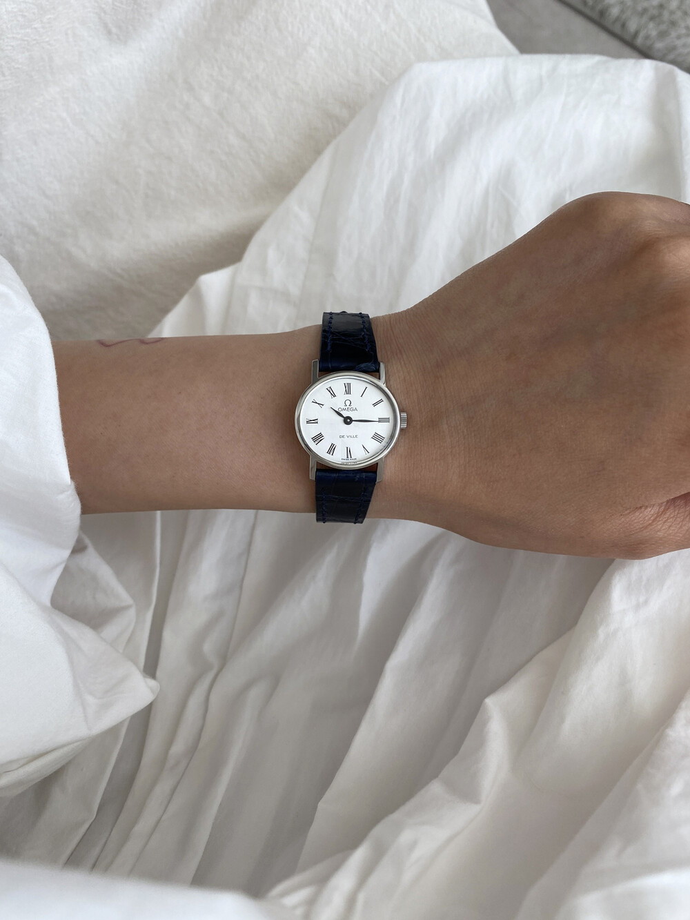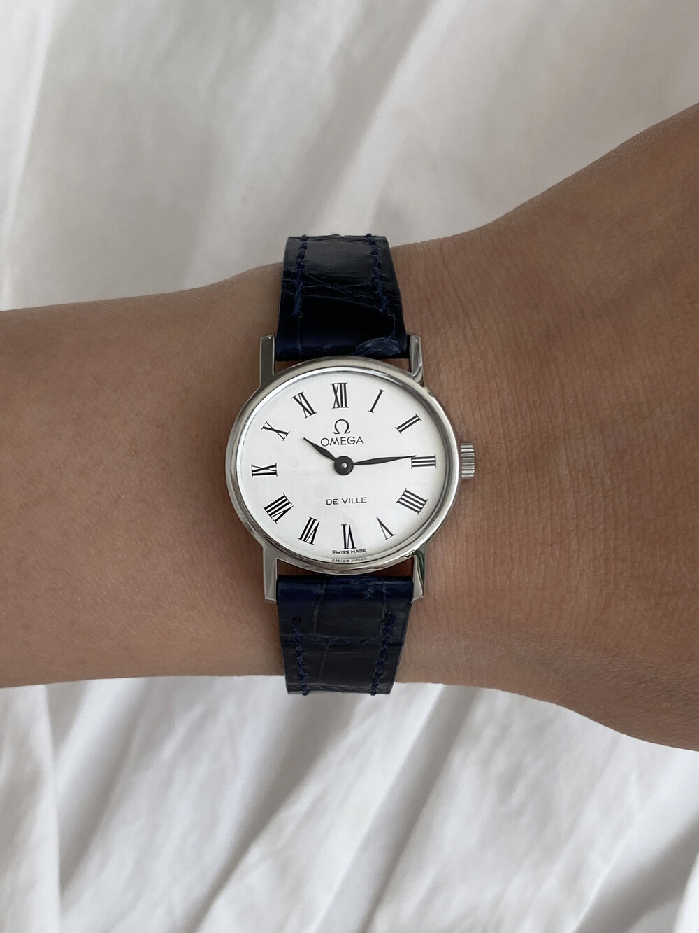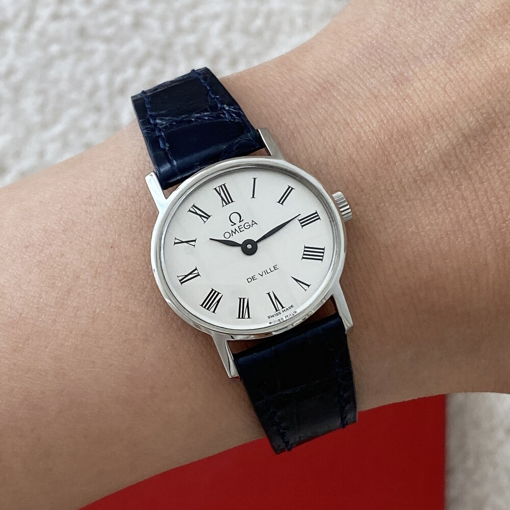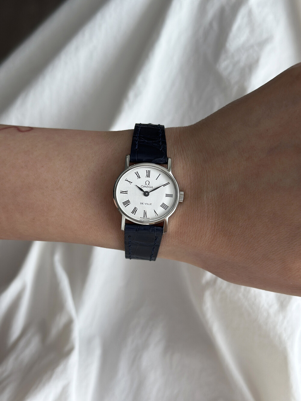 1975년도에 제작된 오메가 드빌 모델로 부드러운 곡선의 실버 케이스와