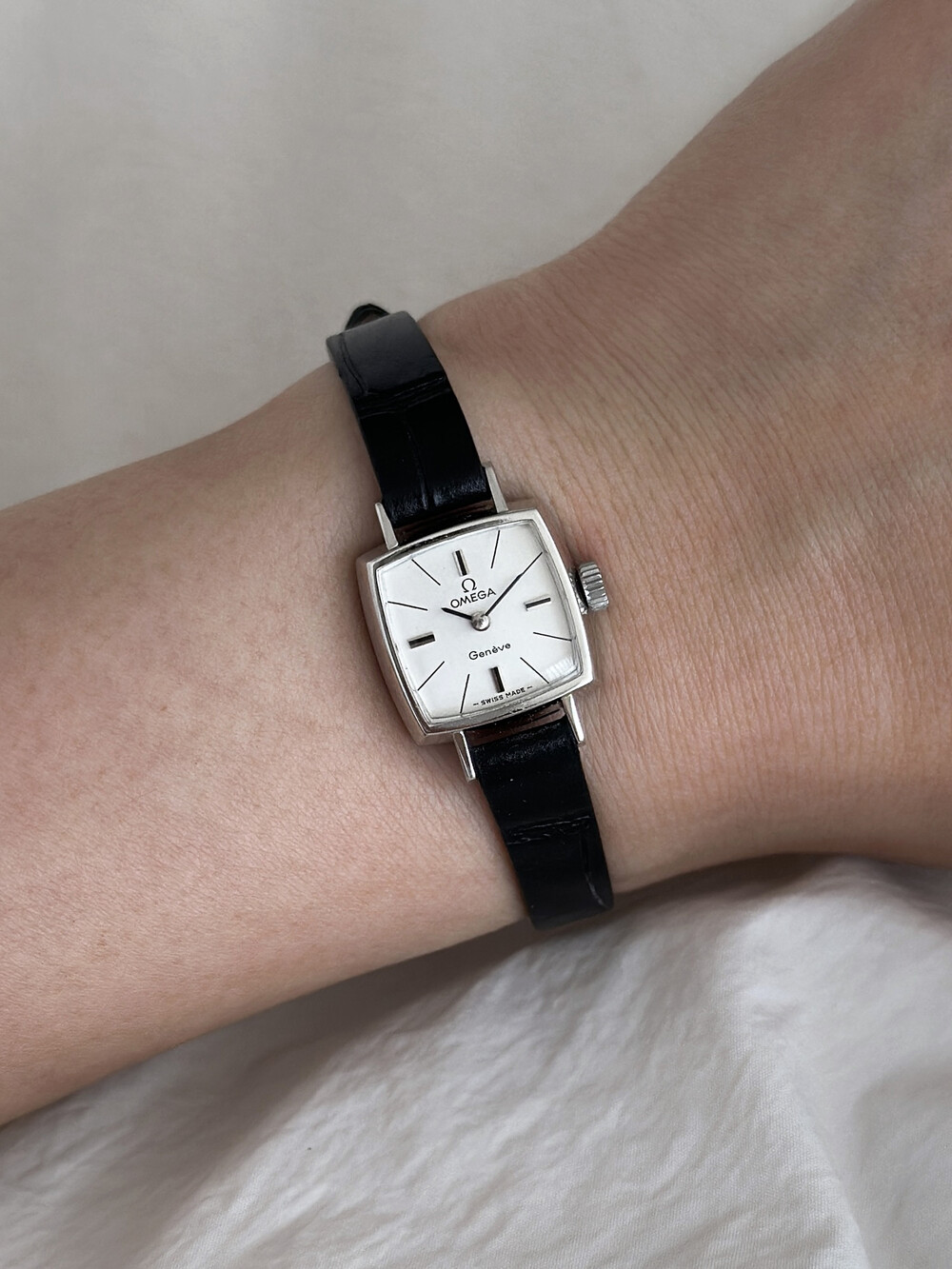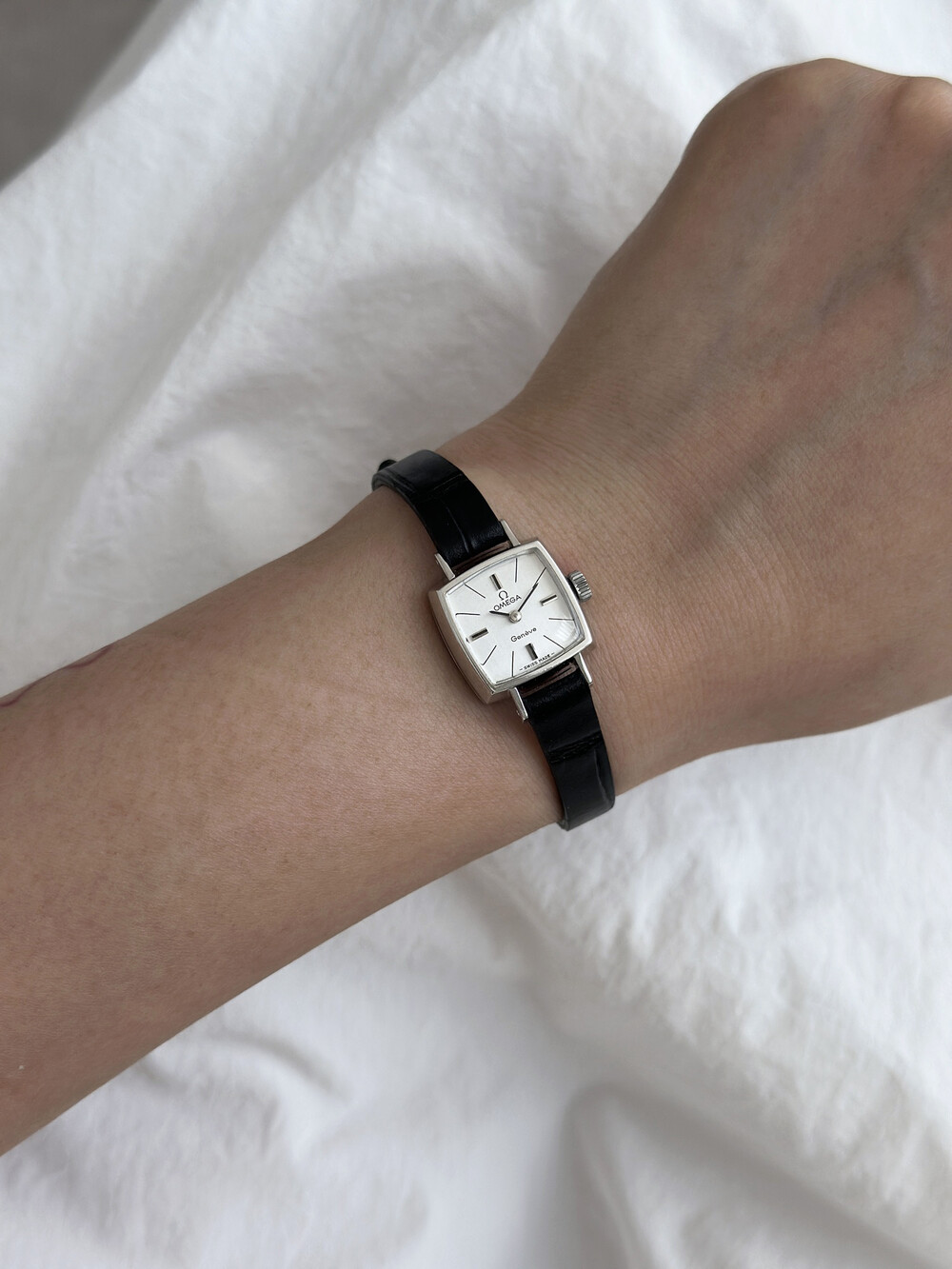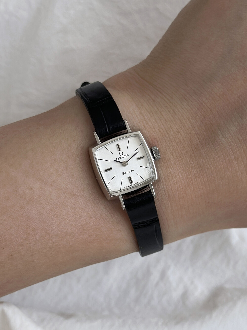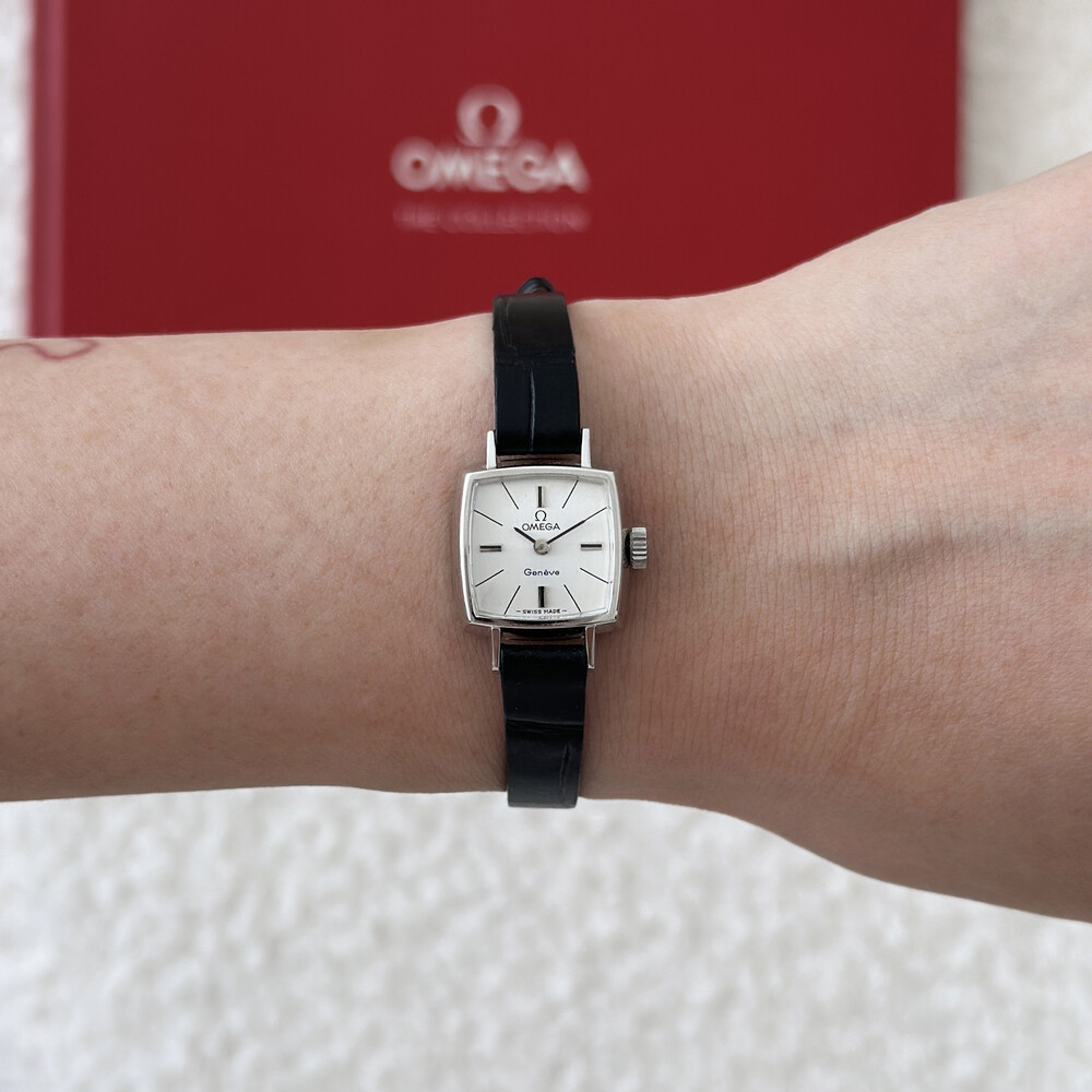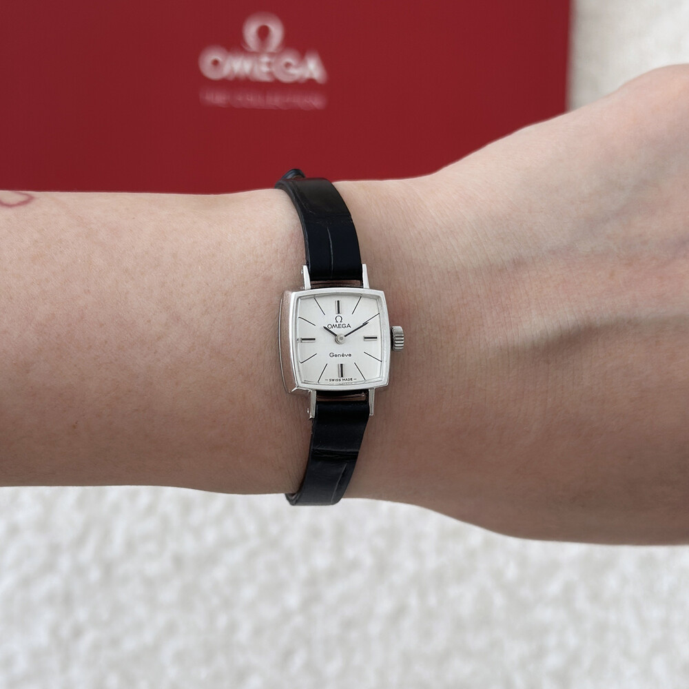 1970년도에 제작된 오메가 제네브 모델로 클래식한 스퀘어 케이스와
