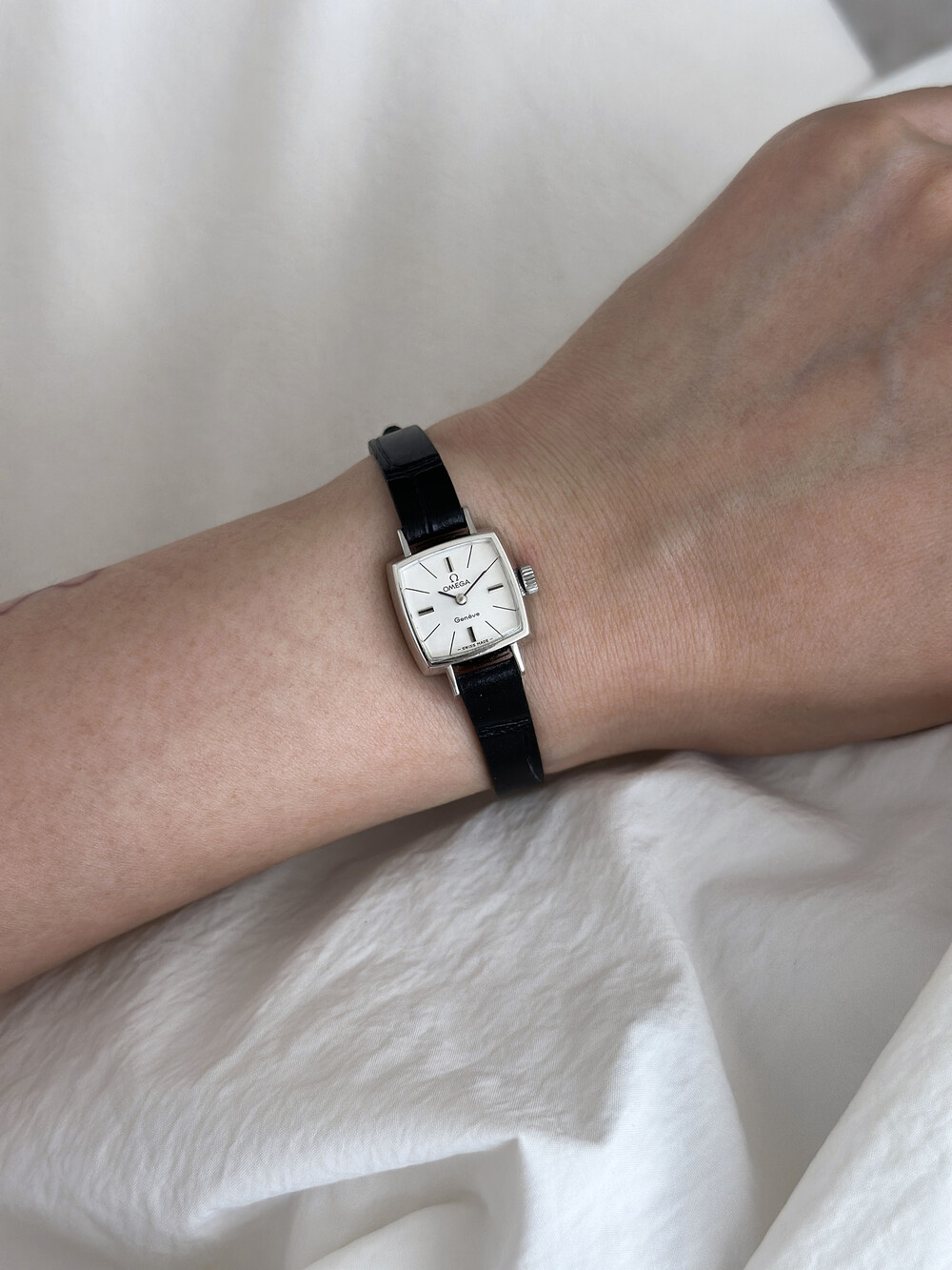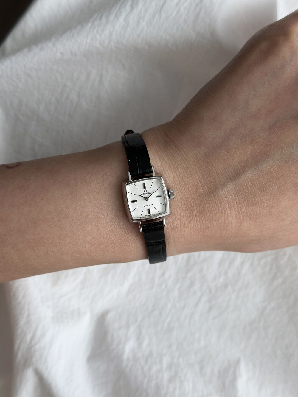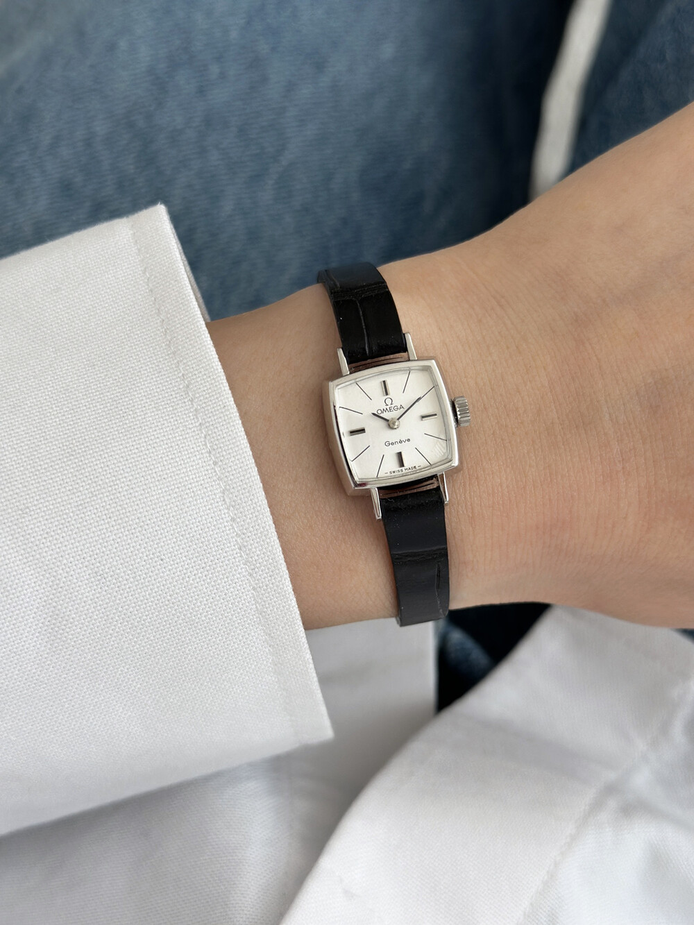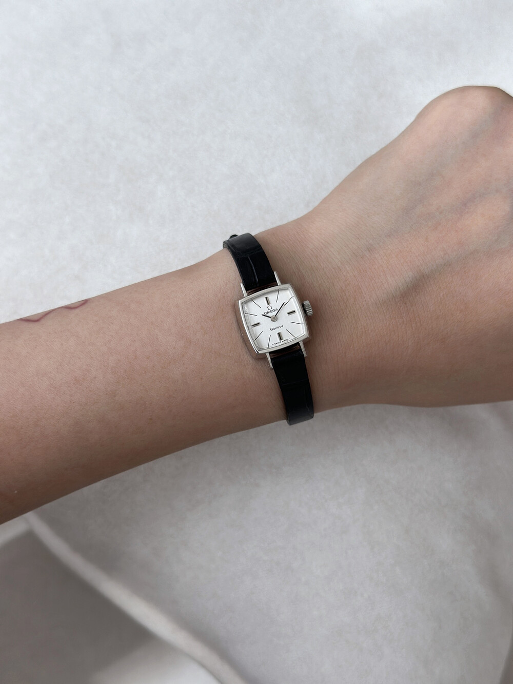 1970년도에 제작된 오메가 제네브 모델로 클래식한 스퀘어 케이스와