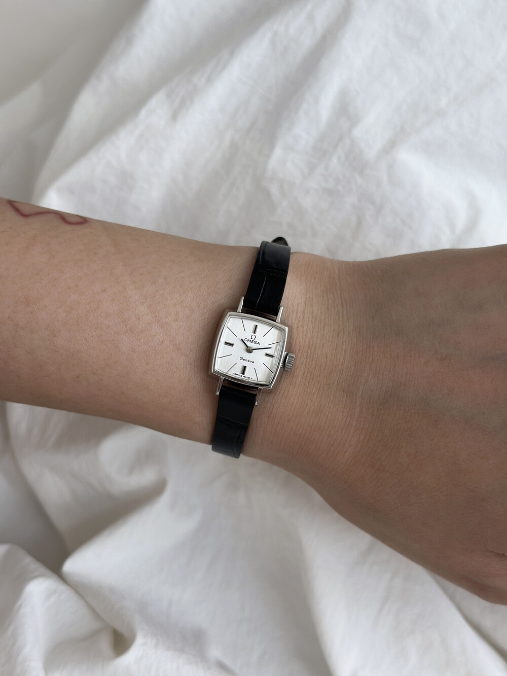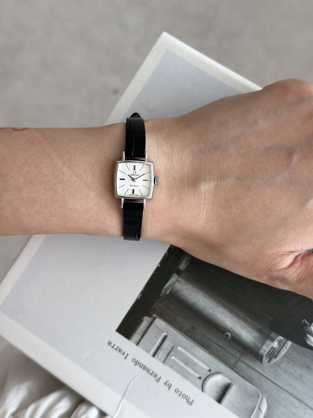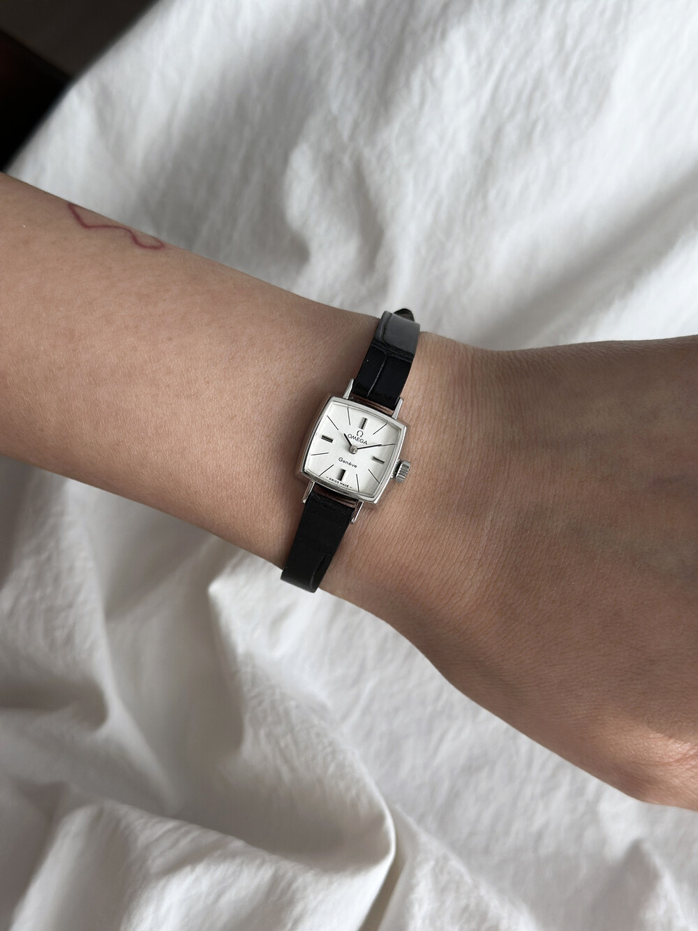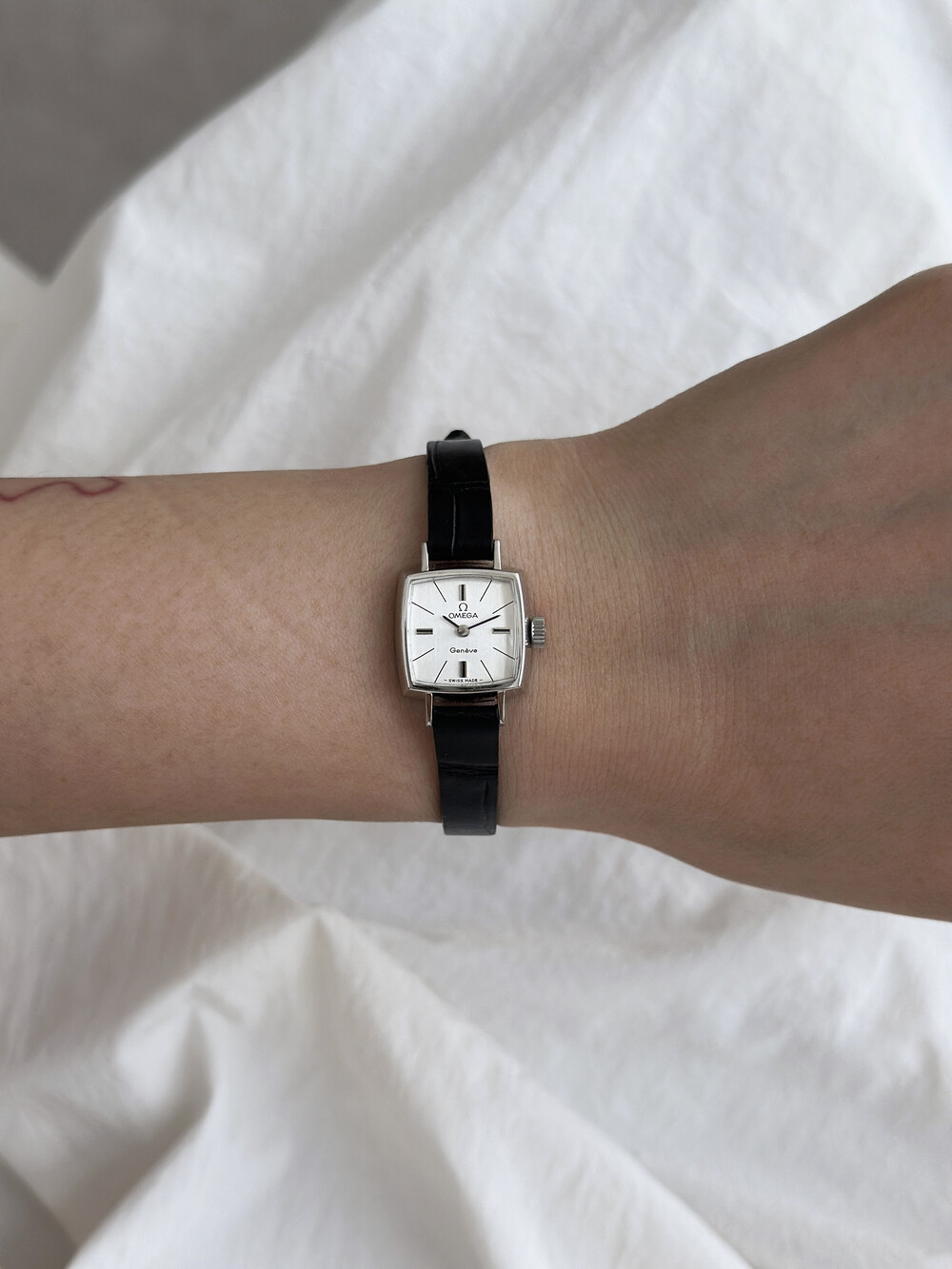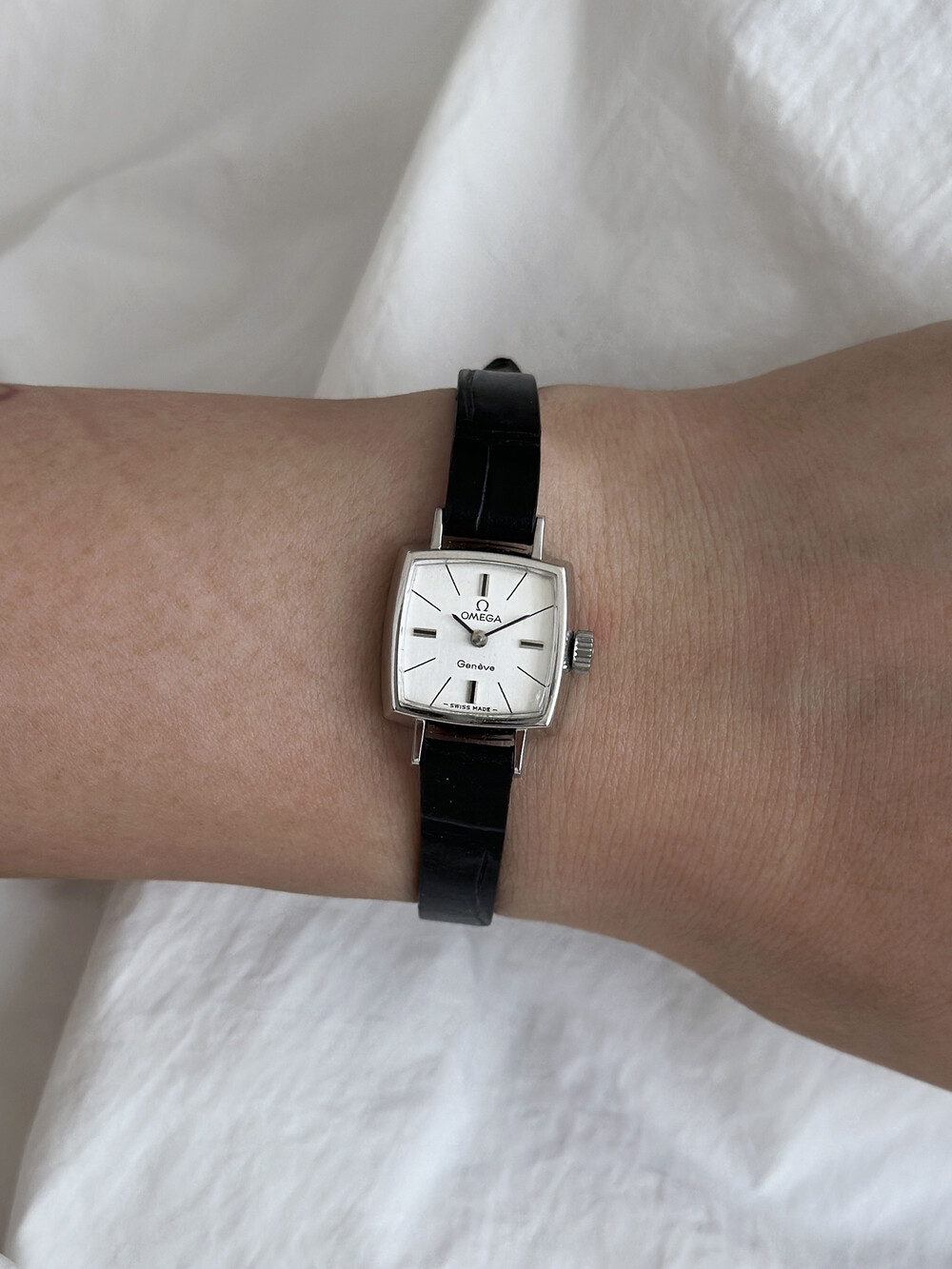 1970년도에 제작된 오메가 제네브 모델로 클래식한 스퀘어 케이스와