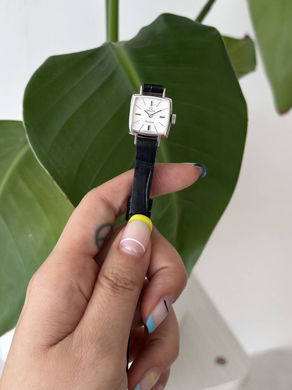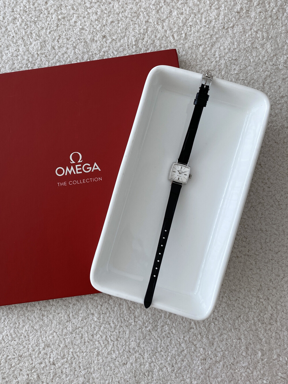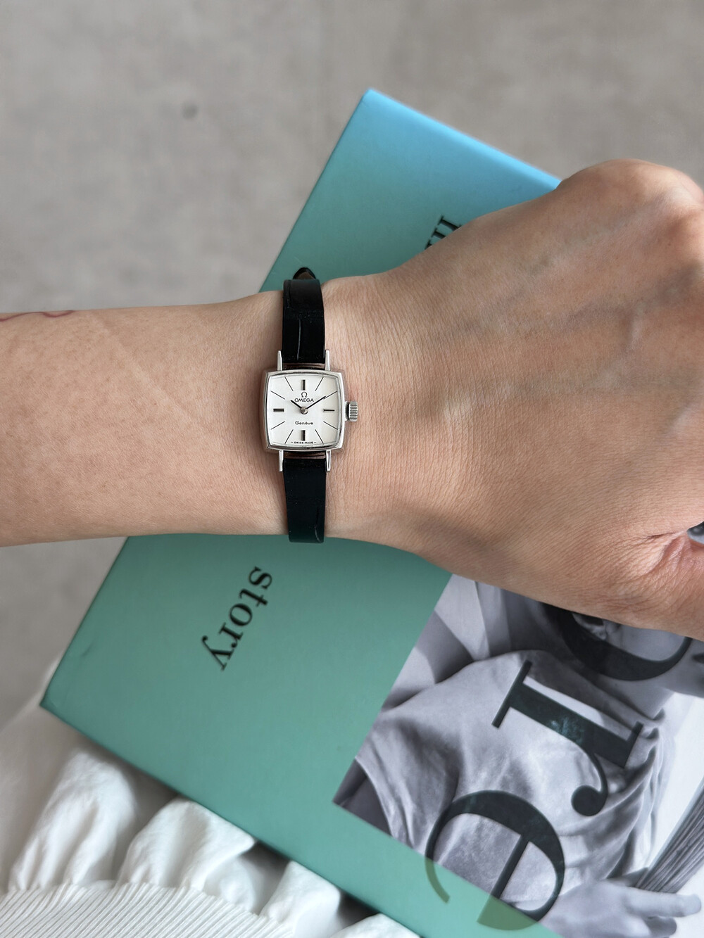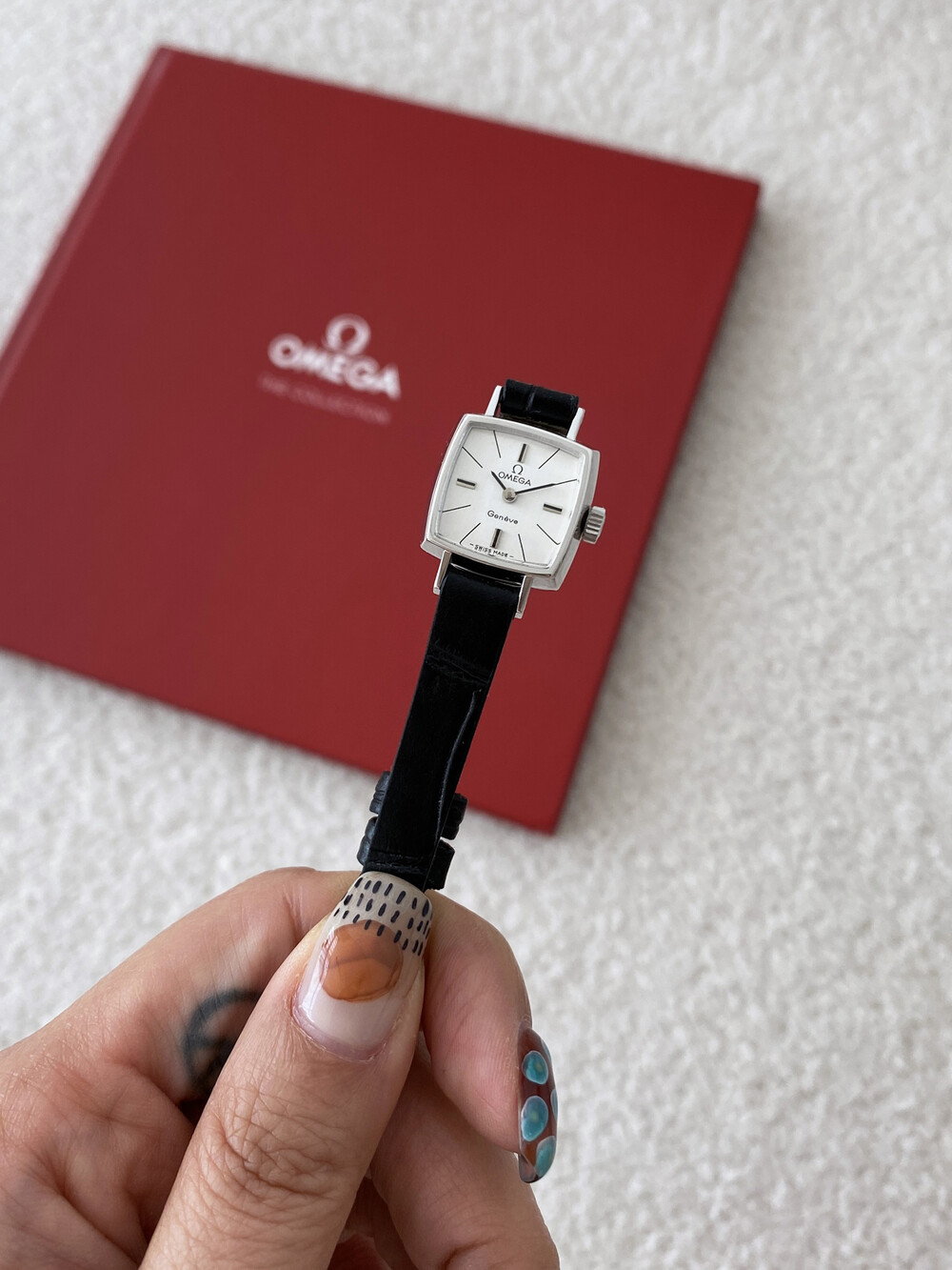 1970년도에 제작된 오메가 제네브 모델로 클래식한 스퀘어 케이스와