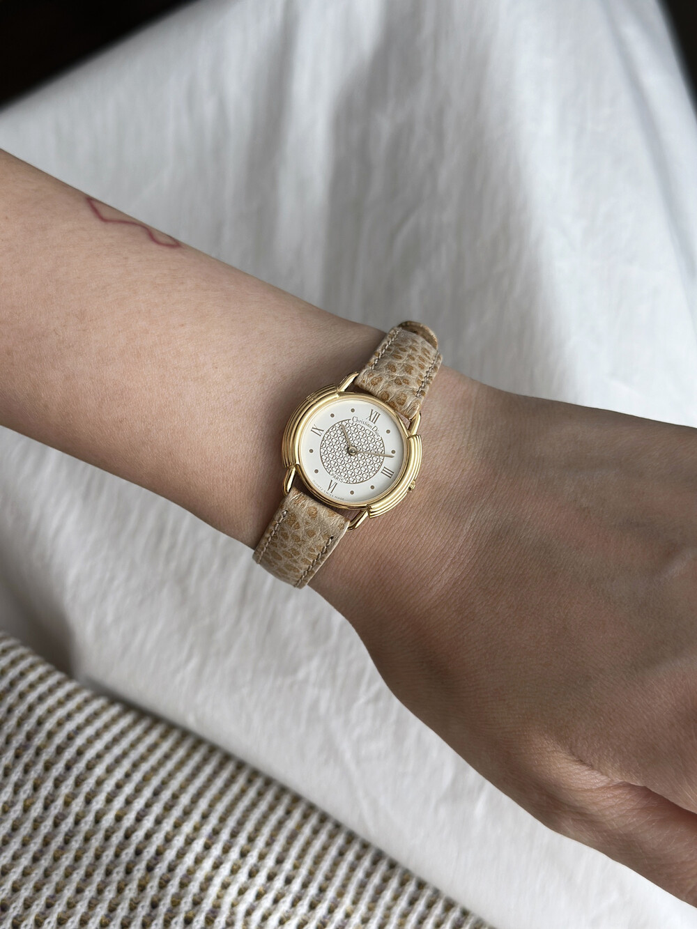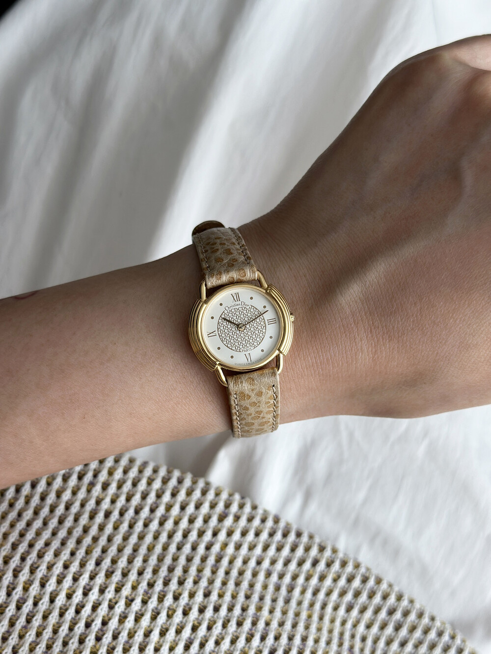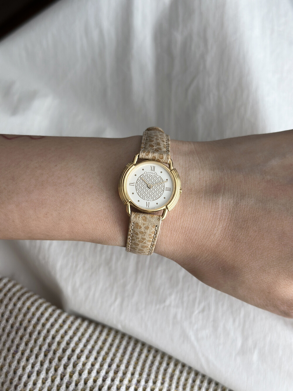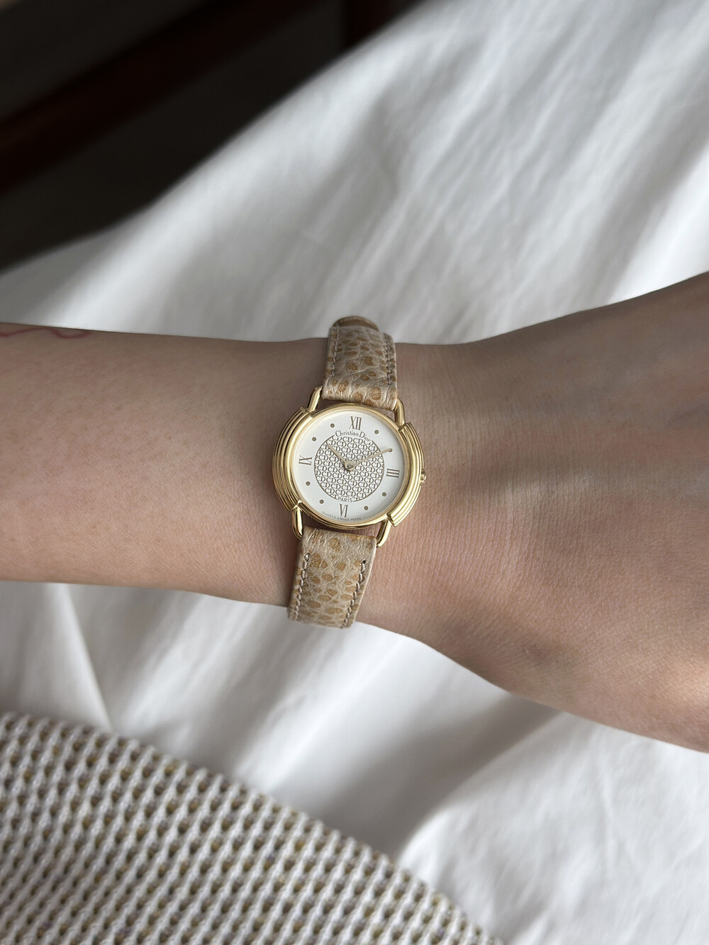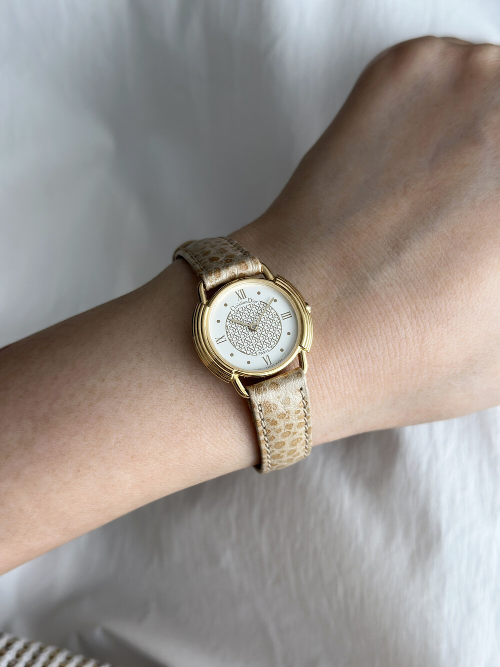 부드러운 골드 톤 케이스와 실버 & 골드 톤 다이얼 위를 장식하는