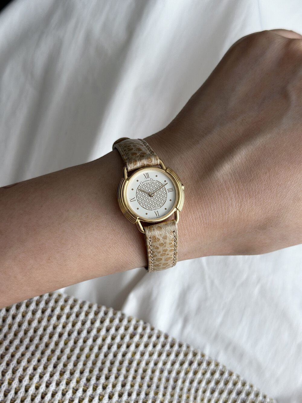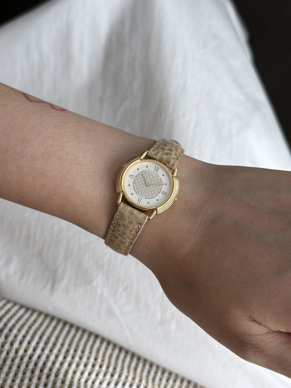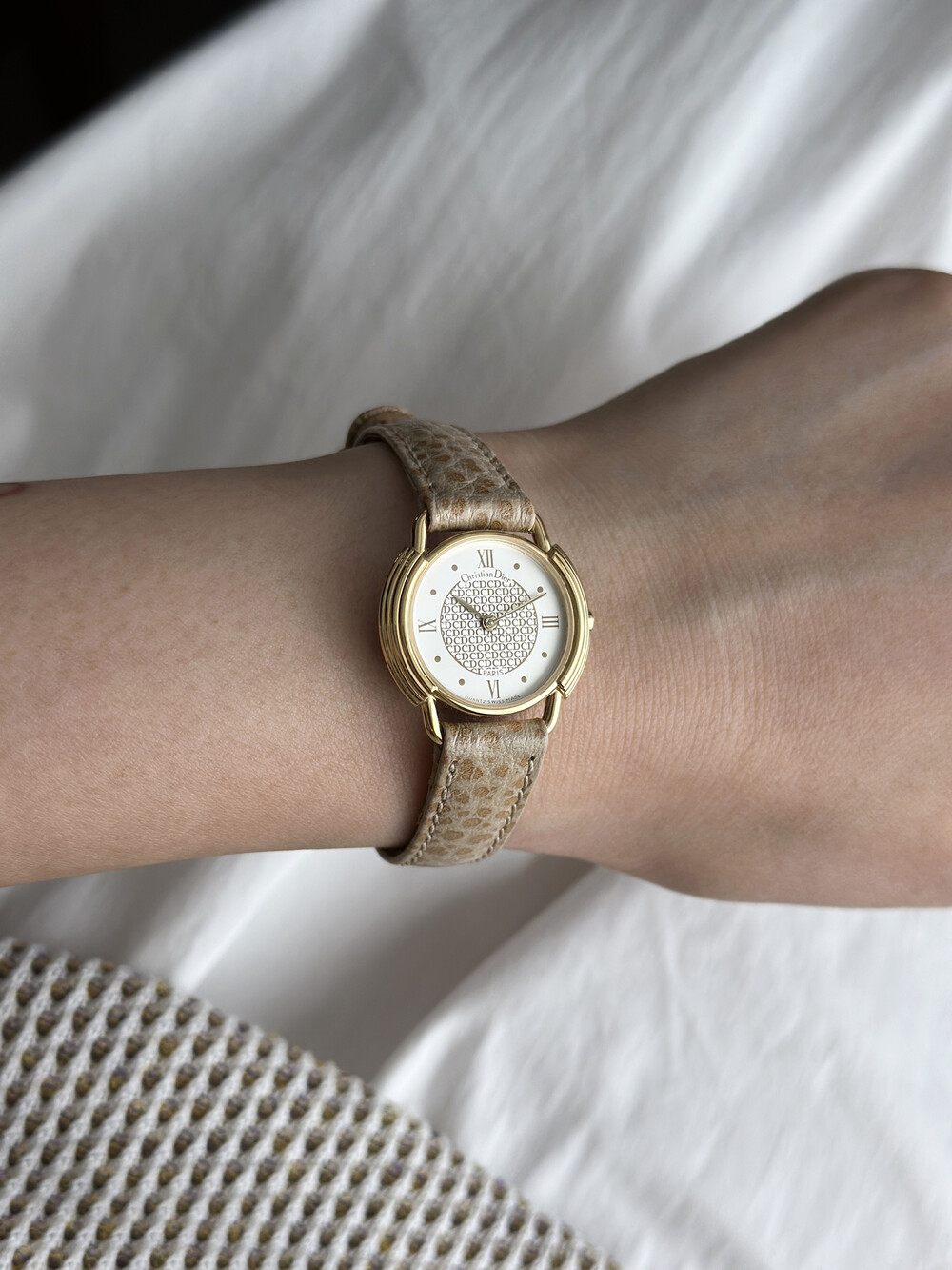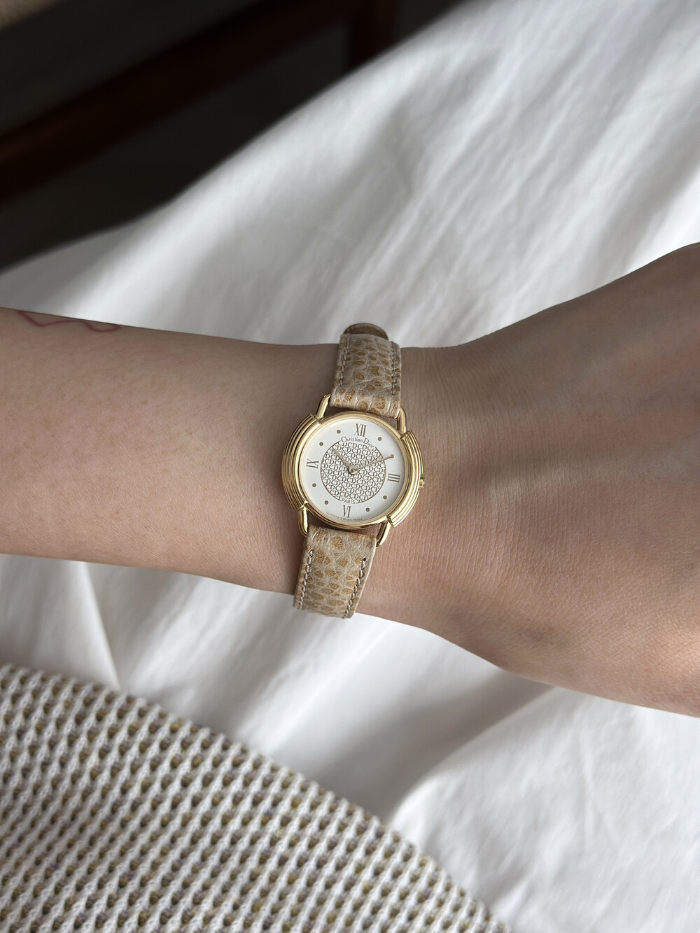 부드러운 골드 톤 케이스와 실버 & 골드 톤 다이얼 위를 장식하는