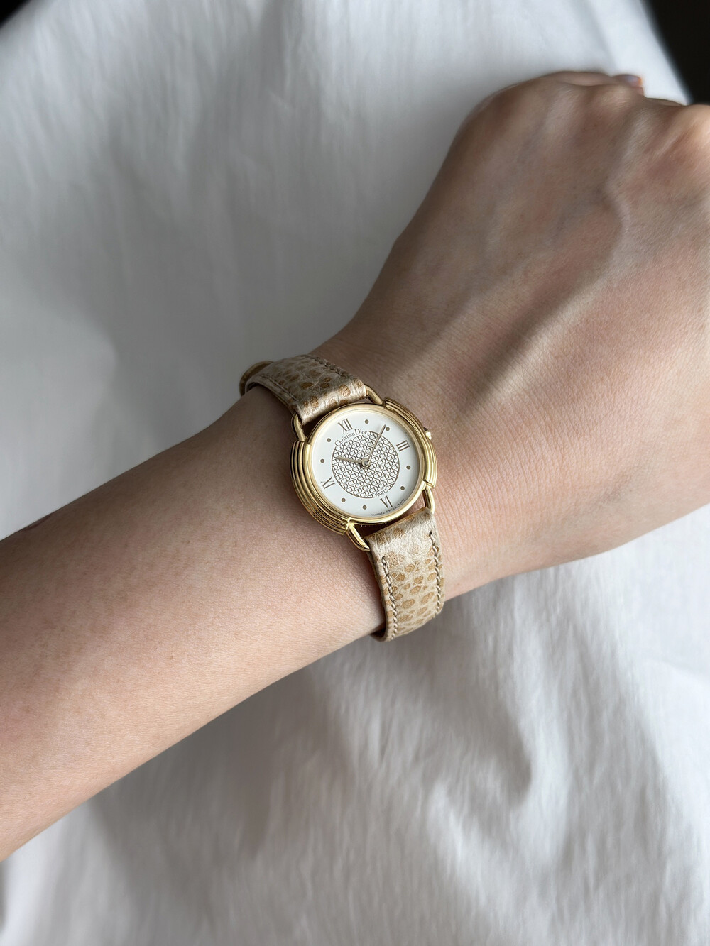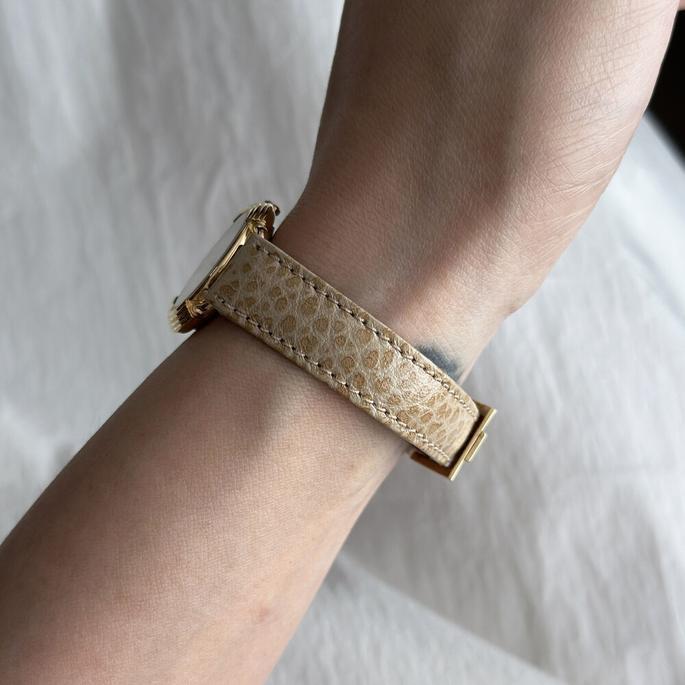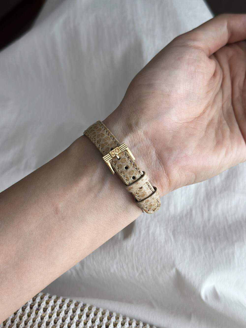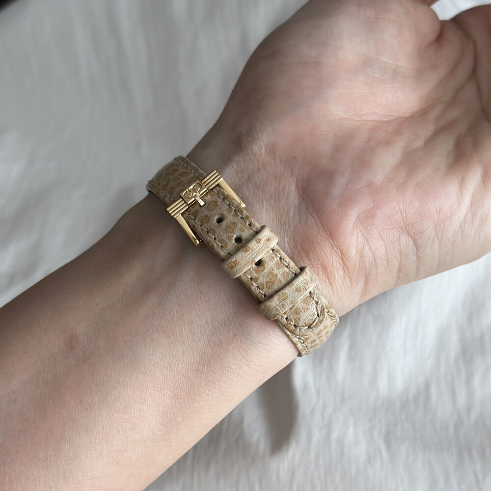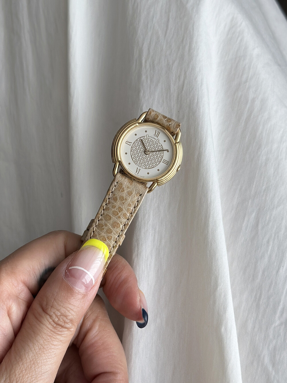 부드러운 골드 톤 케이스와 실버 & 골드 톤 다이얼 위를 장식하는
