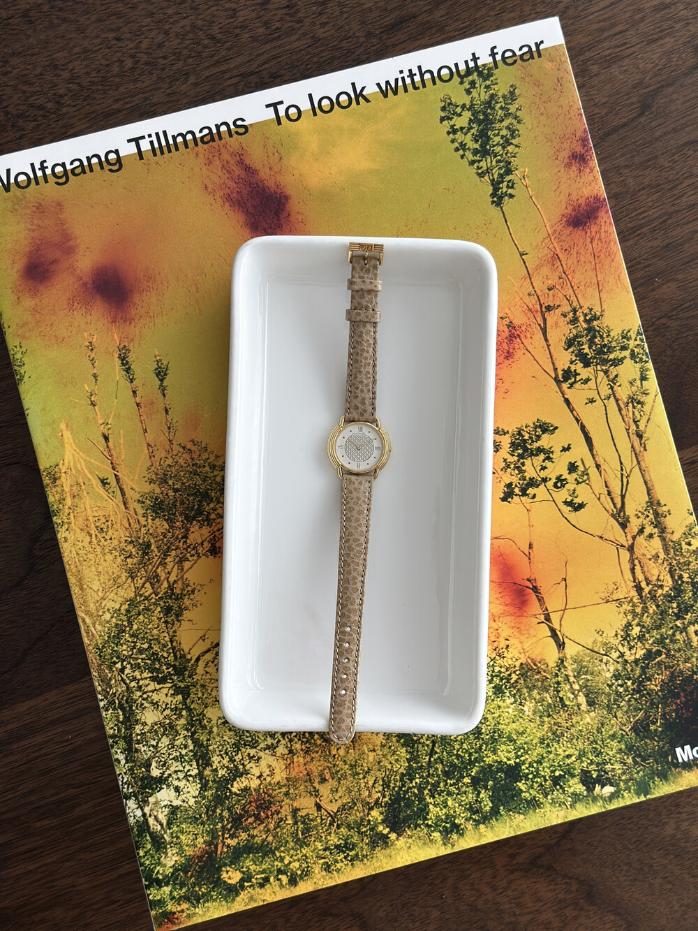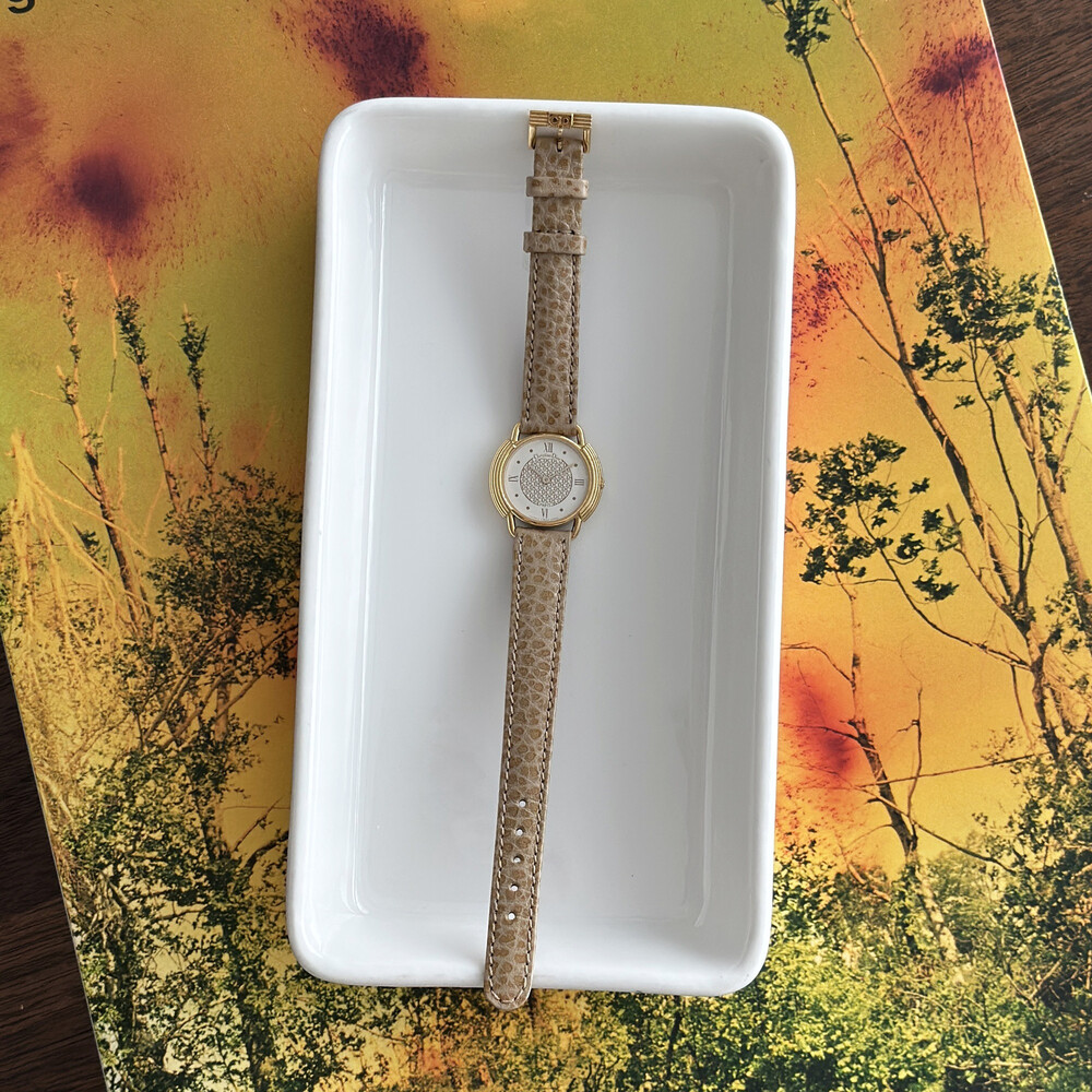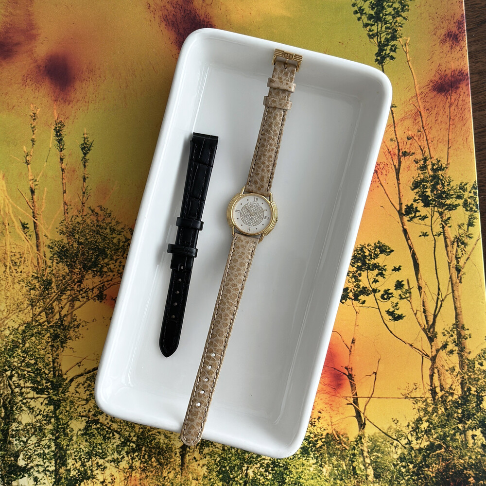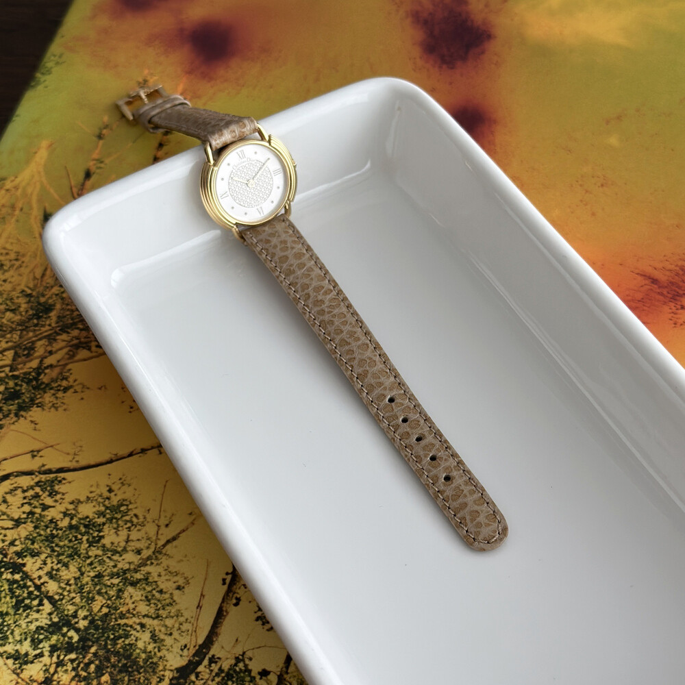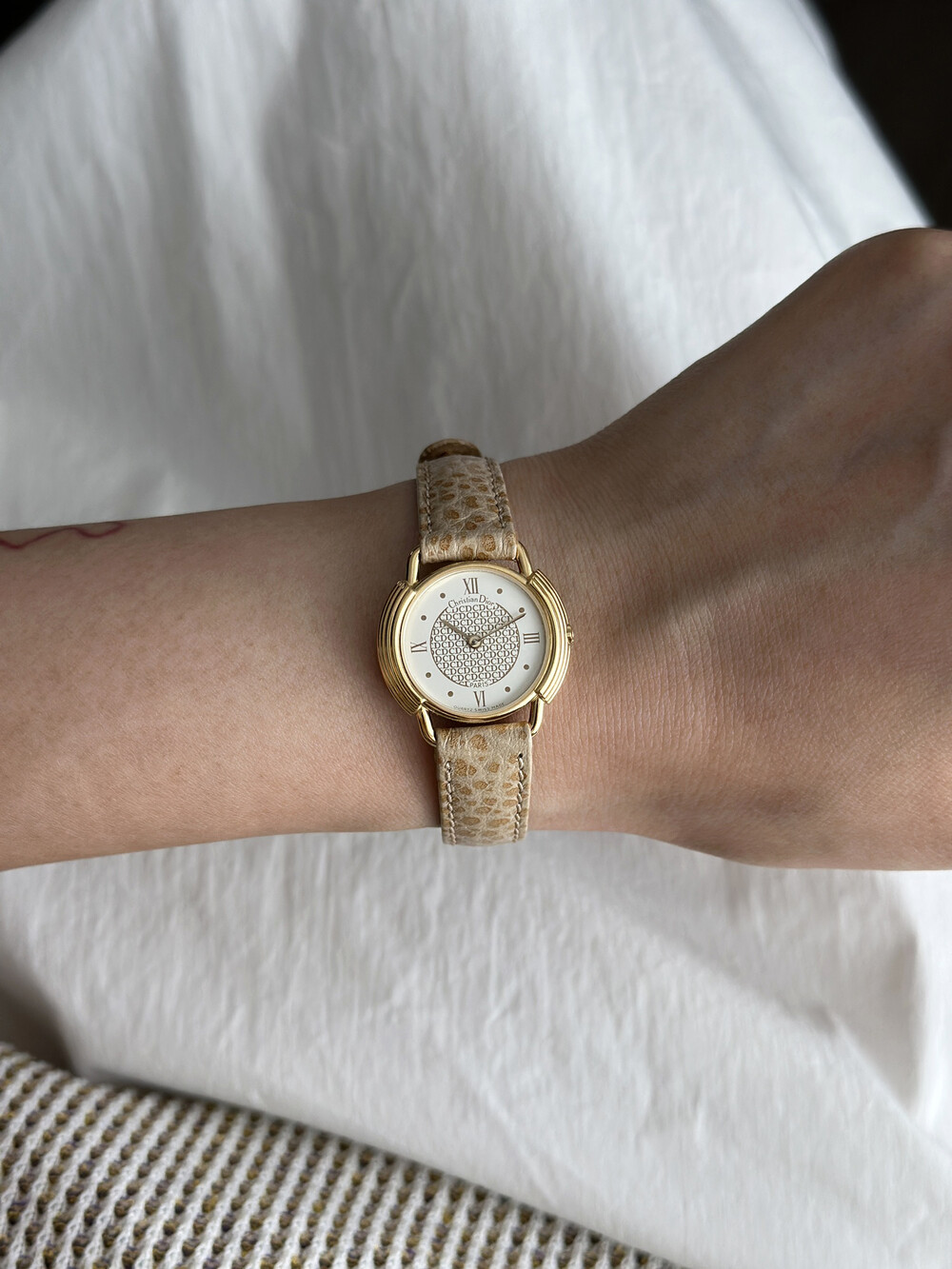부드러운 골드 톤 케이스와 실버 & 골드 톤 다이얼 위를 장식하는