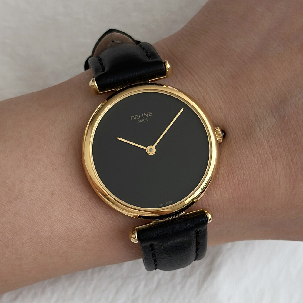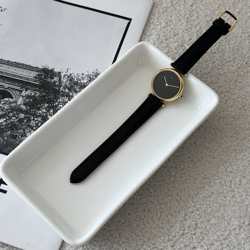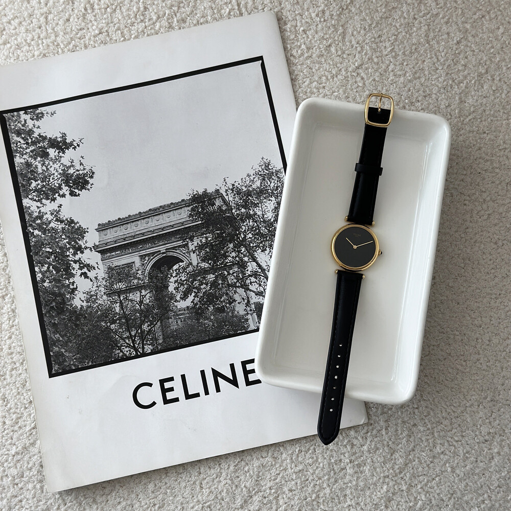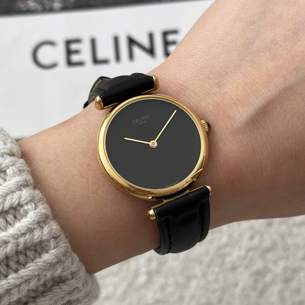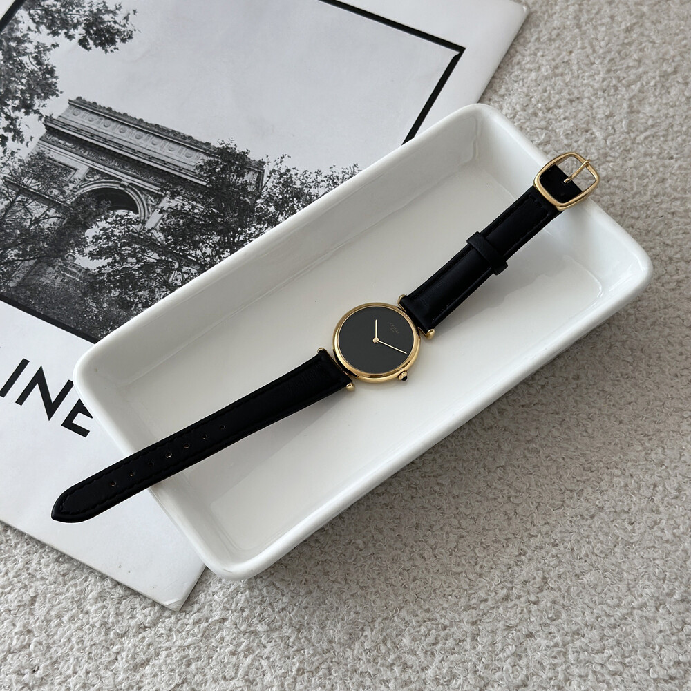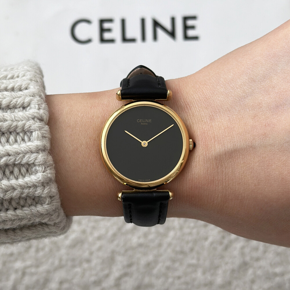 우아한 골드 톤 케이스와 블랙 다이얼, 그리고 다이얼 중앙에 자리한 셀린느 로고가 돋보이는 모델입니다. ETA 무브먼트를 사용해 태엽을 직접 감는 아날로그 방식의 매력이 고스란히 담겨 있습니다.