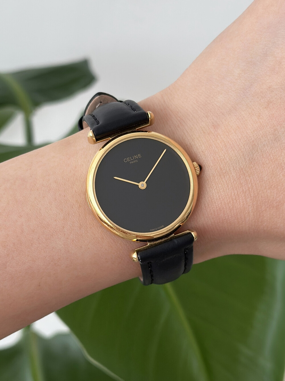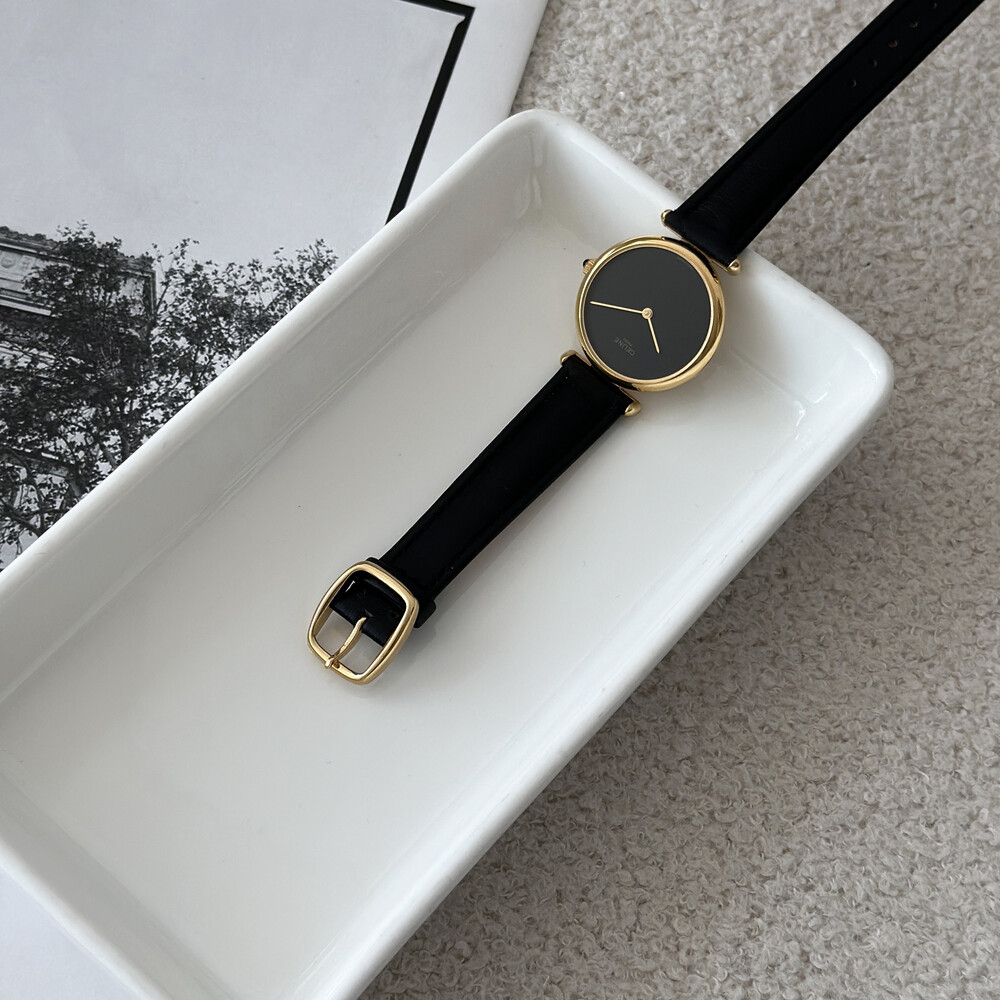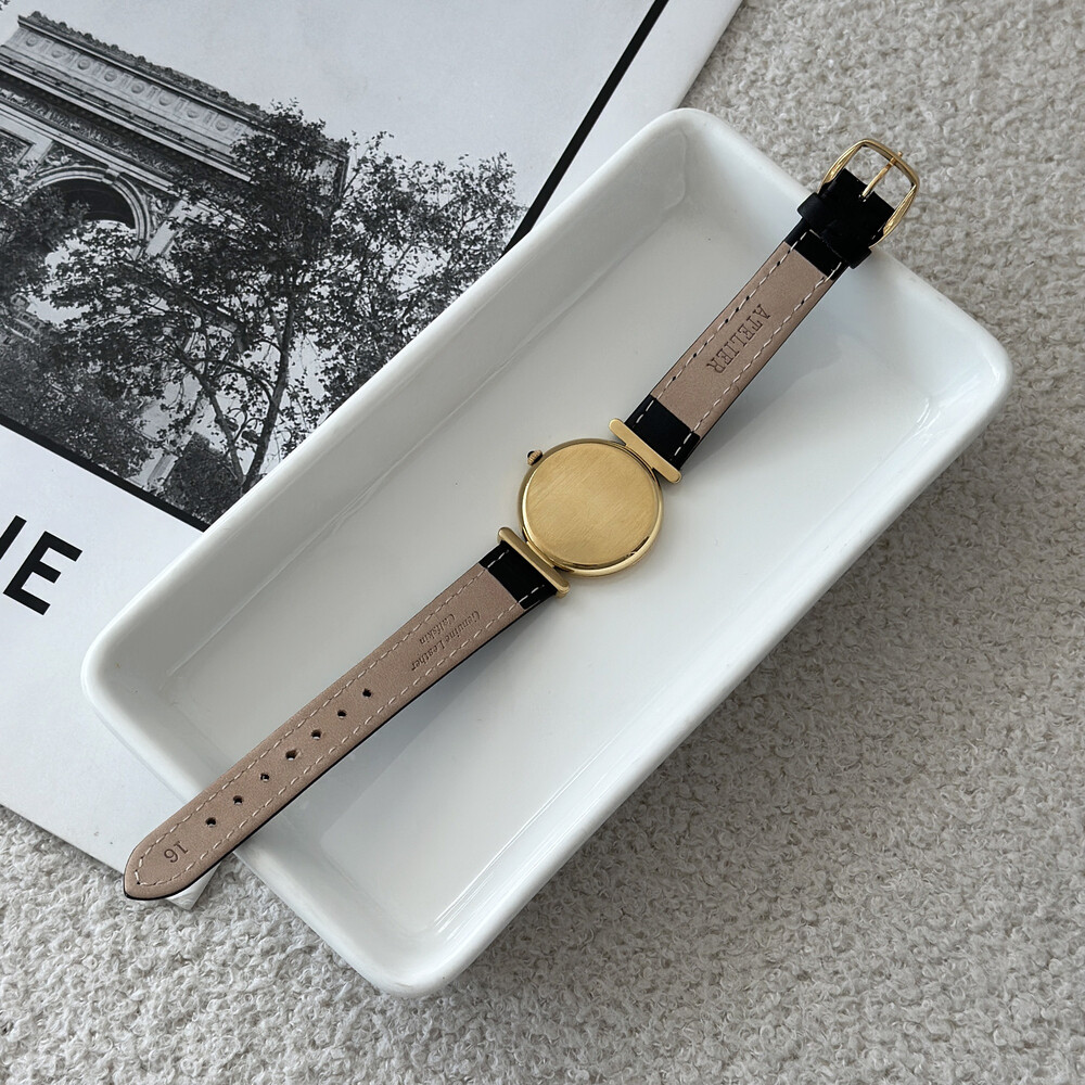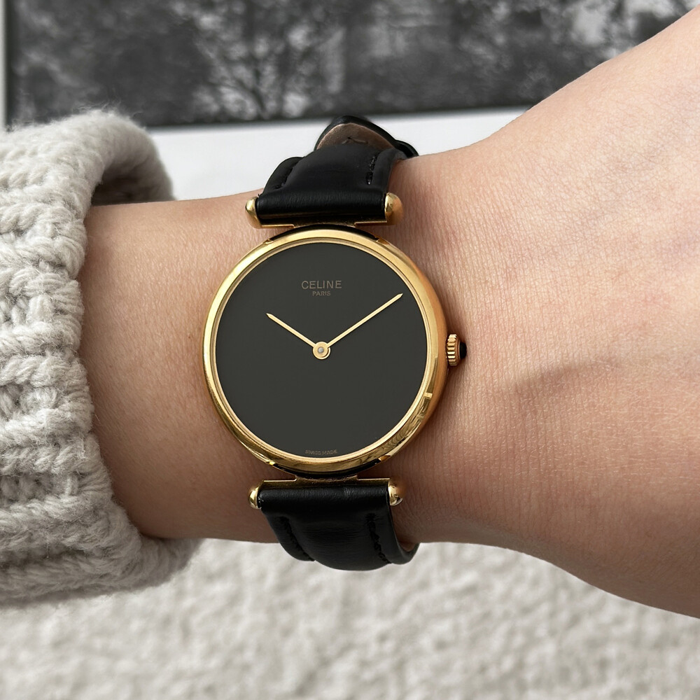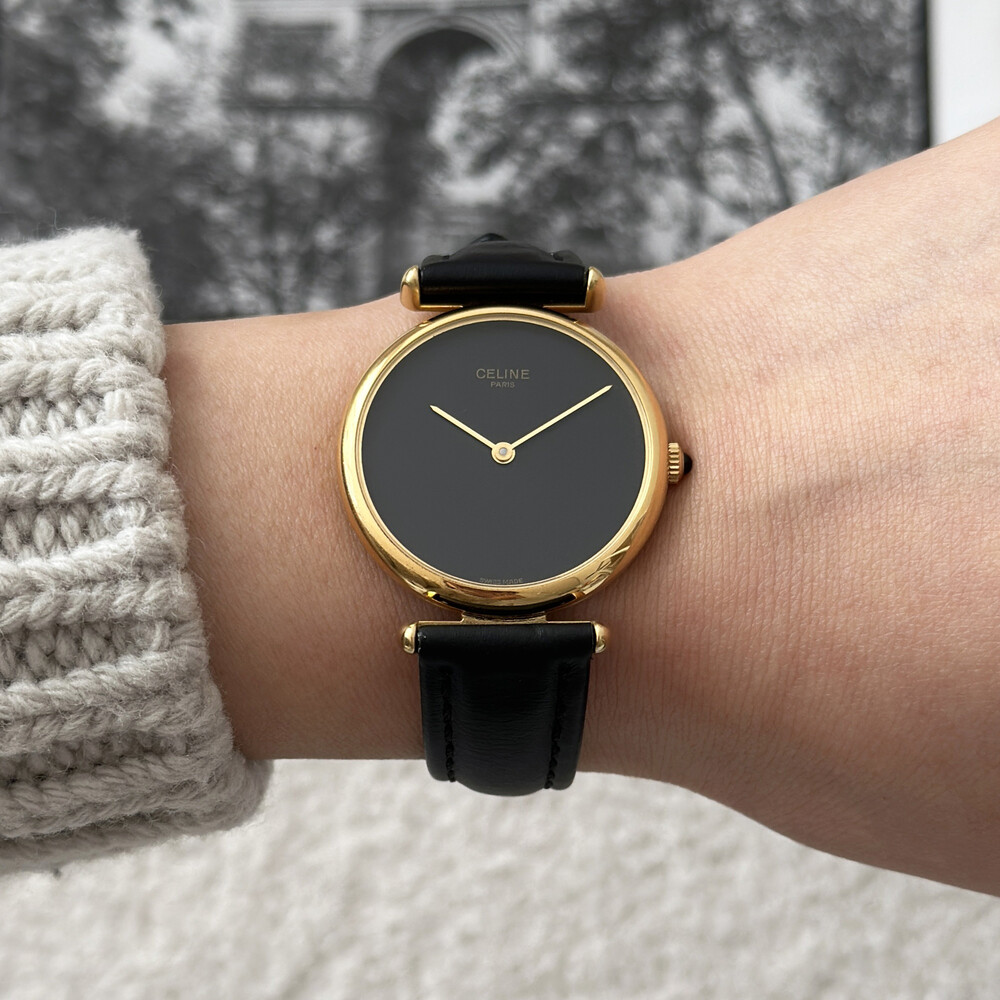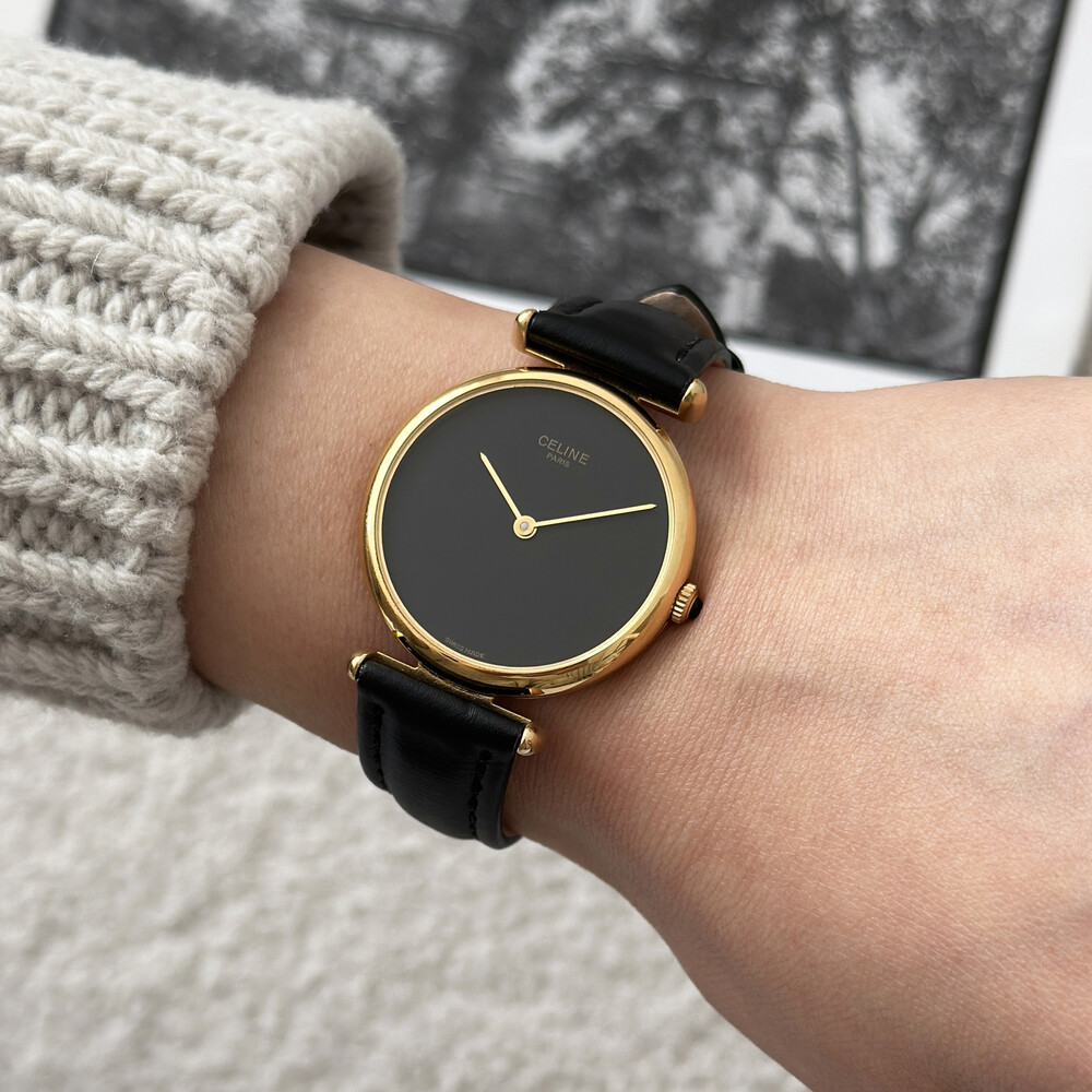 우아한 골드 톤 케이스와 블랙 다이얼, 그리고 다이얼 중앙에 자리한 셀린느 로고가 돋보이는 모델입니다. ETA 무브먼트를 사용해 태엽을 직접 감는 아날로그 방식의 매력이 고스란히 담겨 있습니다.