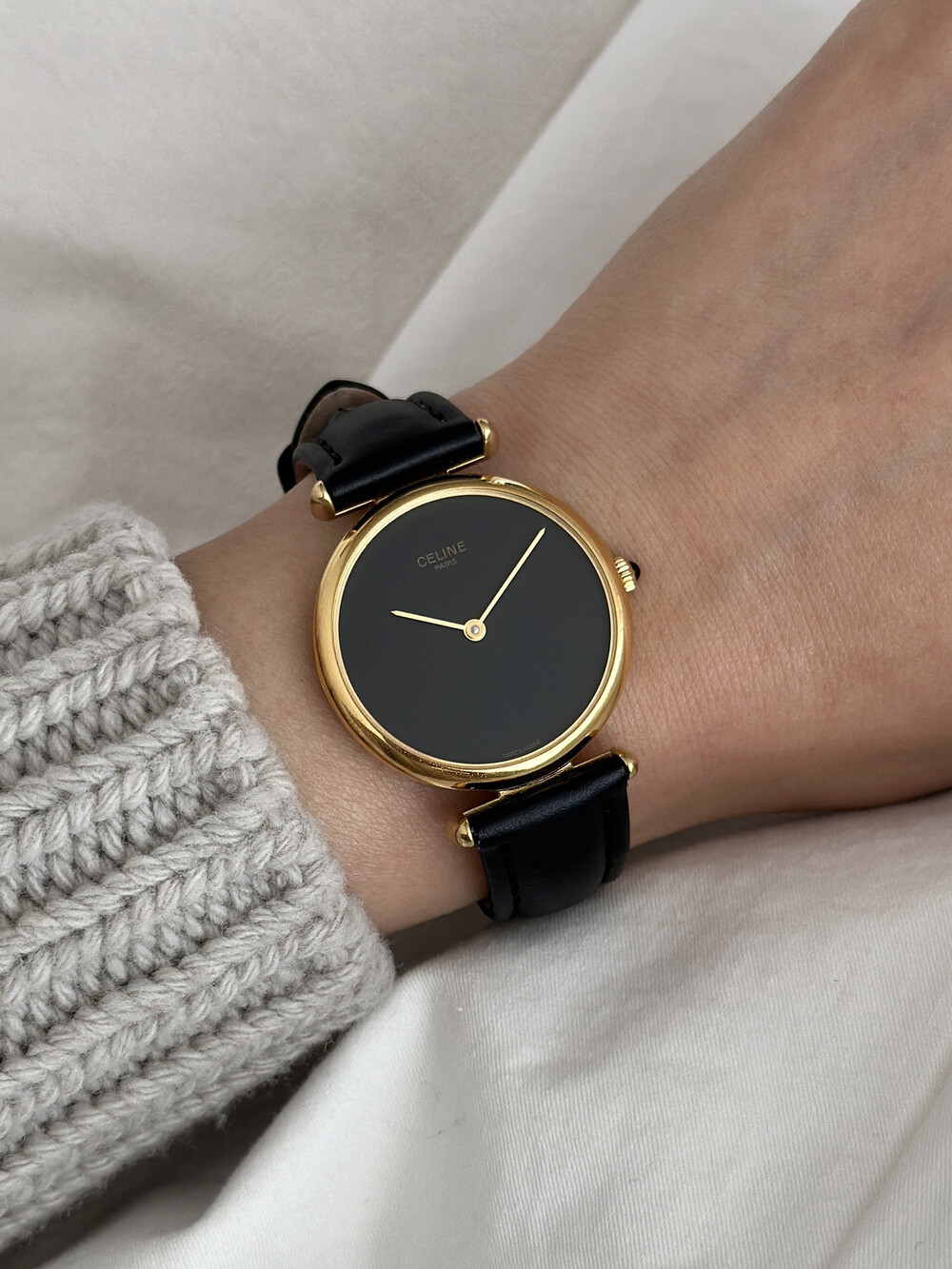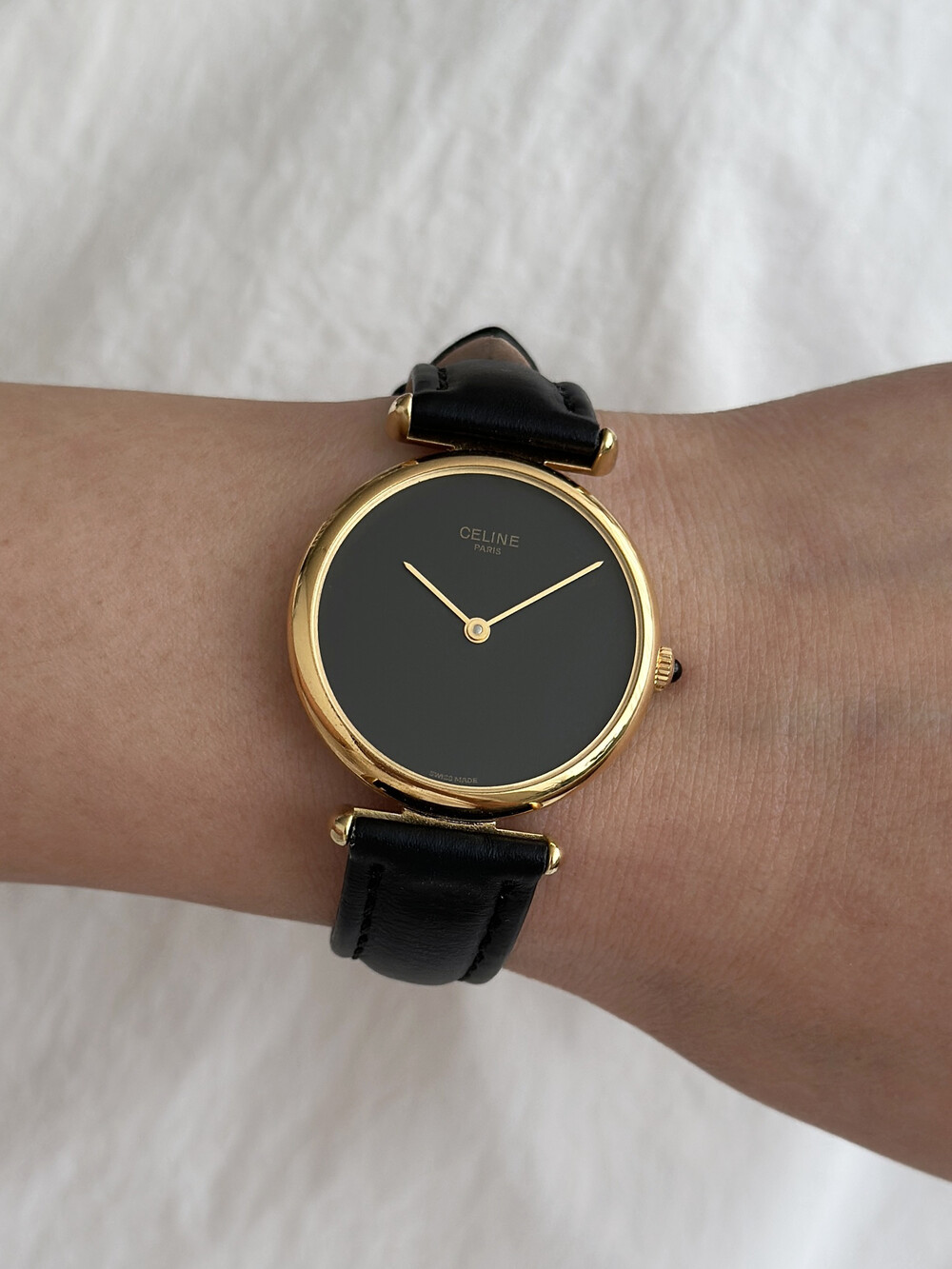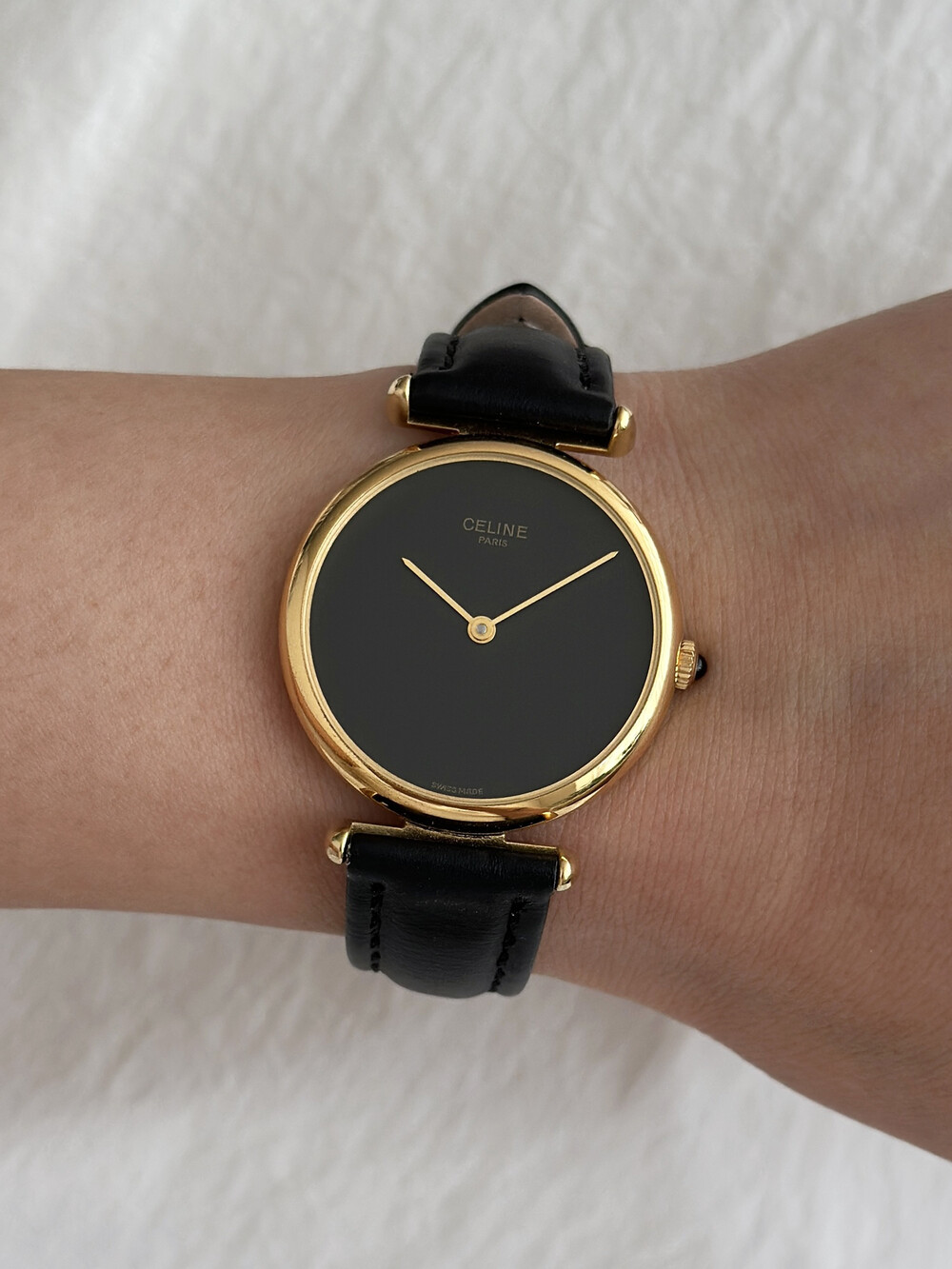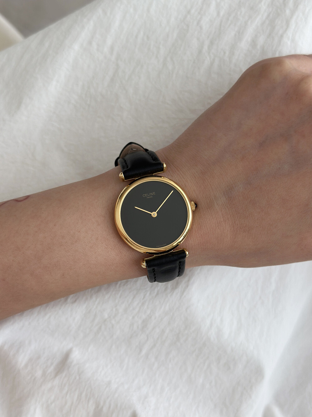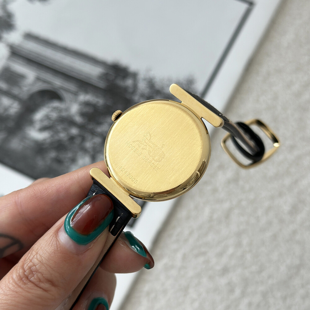우아한 골드 톤 케이스와 블랙 다이얼, 그리고 다이얼 중앙에 자리한 셀린느 로고가 돋보이는 모델입니다. ETA 무브먼트를 사용해 태엽을 직접 감는 아날로그 방식의 매력이 고스란히 담겨 있습니다.
