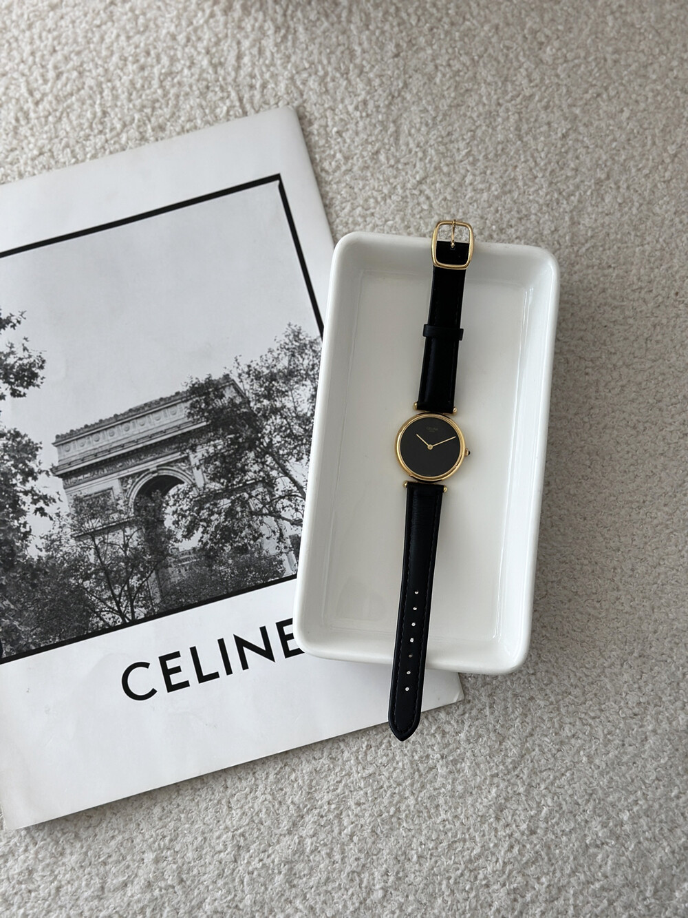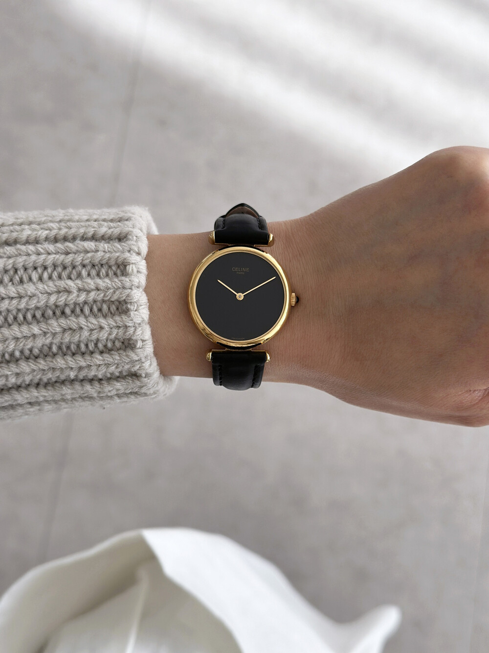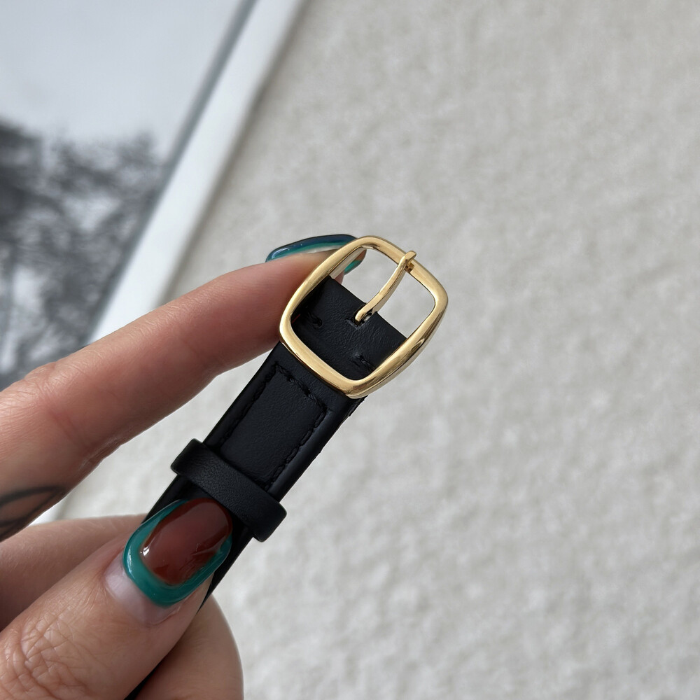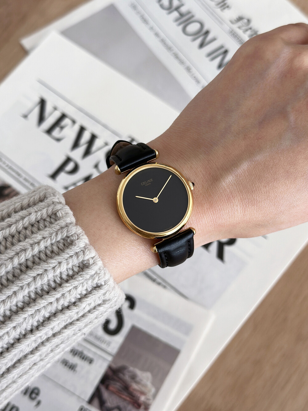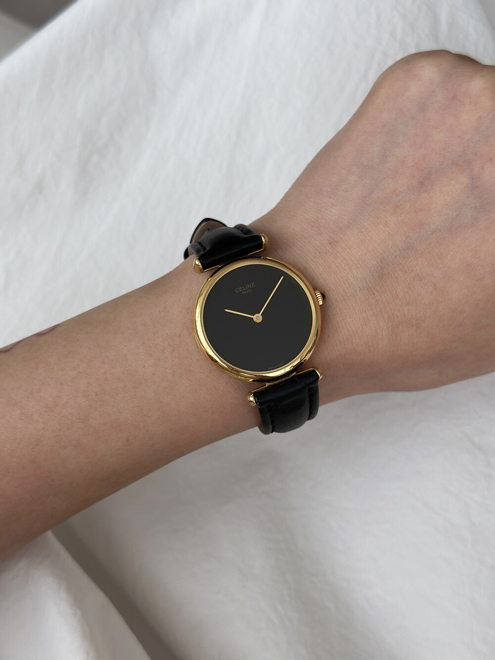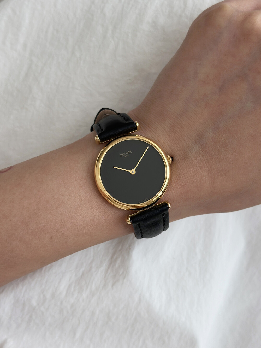 우아한 골드 톤 케이스와 블랙 다이얼, 그리고 다이얼 중앙에 자리한 셀린느 로고가 돋보이는 모델입니다. ETA 무브먼트를 사용해 태엽을 직접 감는 아날로그 방식의 매력이 고스란히 담겨 있습니다.