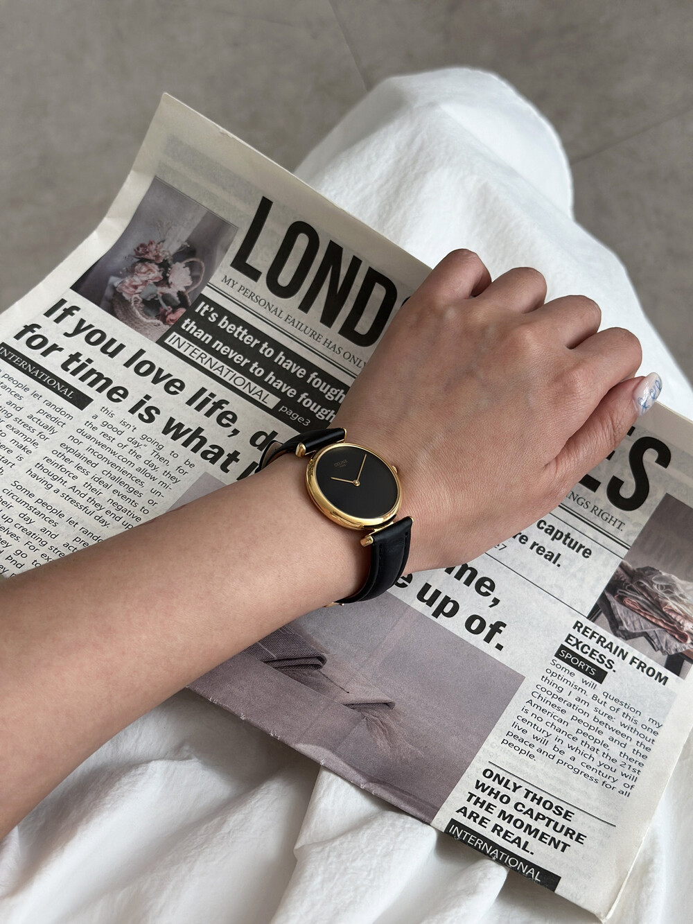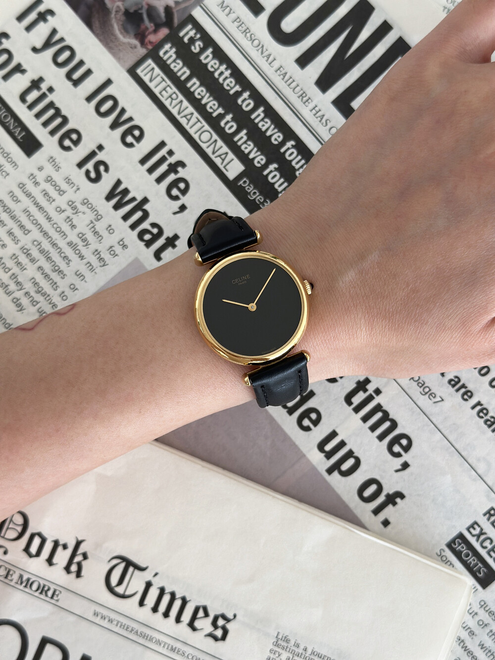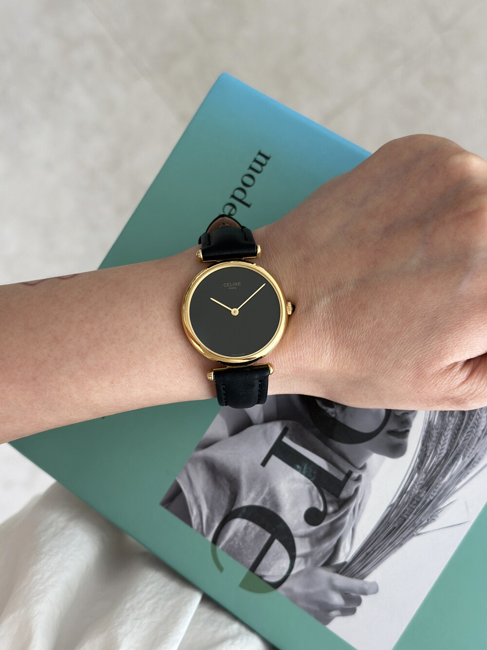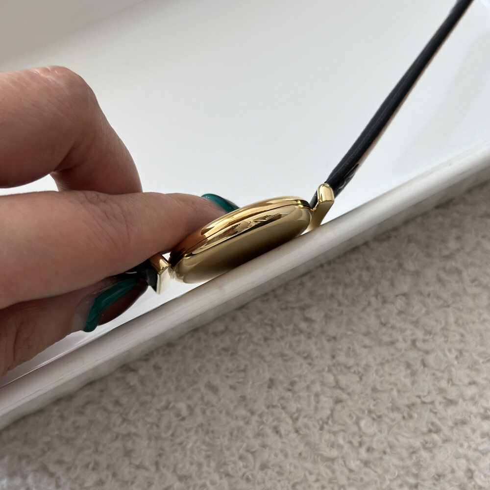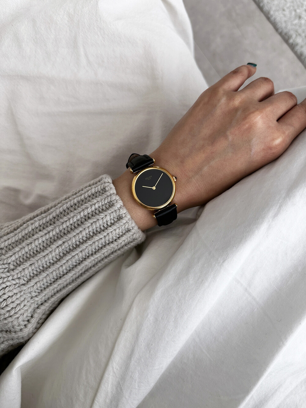 우아한 골드 톤 케이스와 블랙 다이얼, 그리고 다이얼 중앙에 자리한 셀린느 로고가 돋보이는 모델입니다. ETA 무브먼트를 사용해 태엽을 직접 감는 아날로그 방식의 매력이 고스란히 담겨 있습니다.
