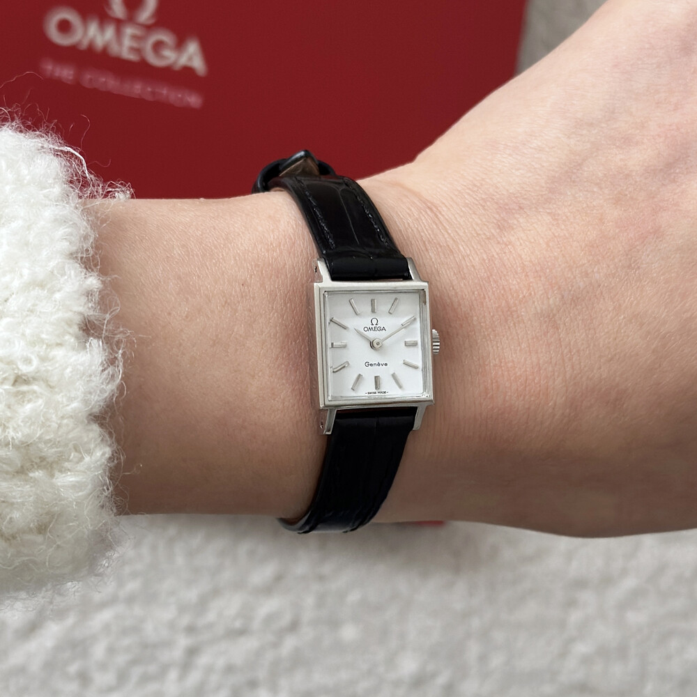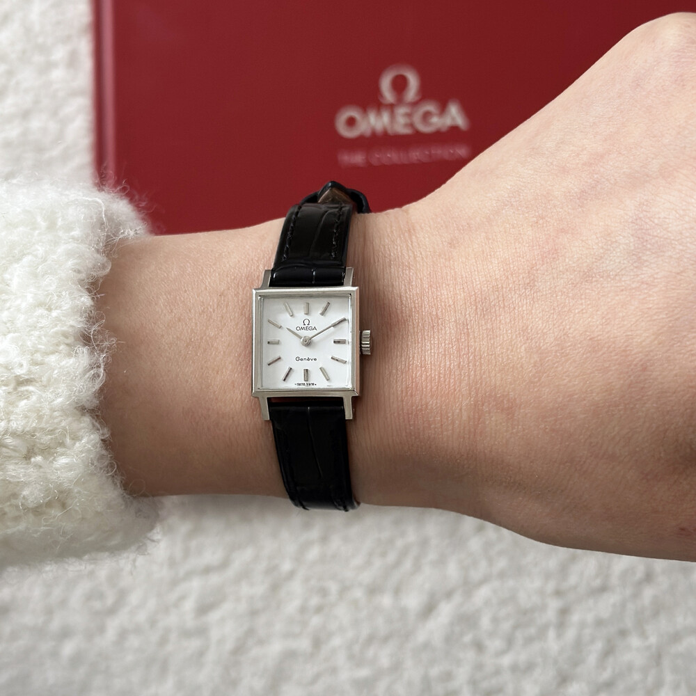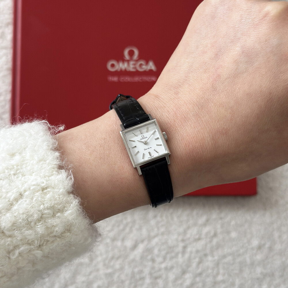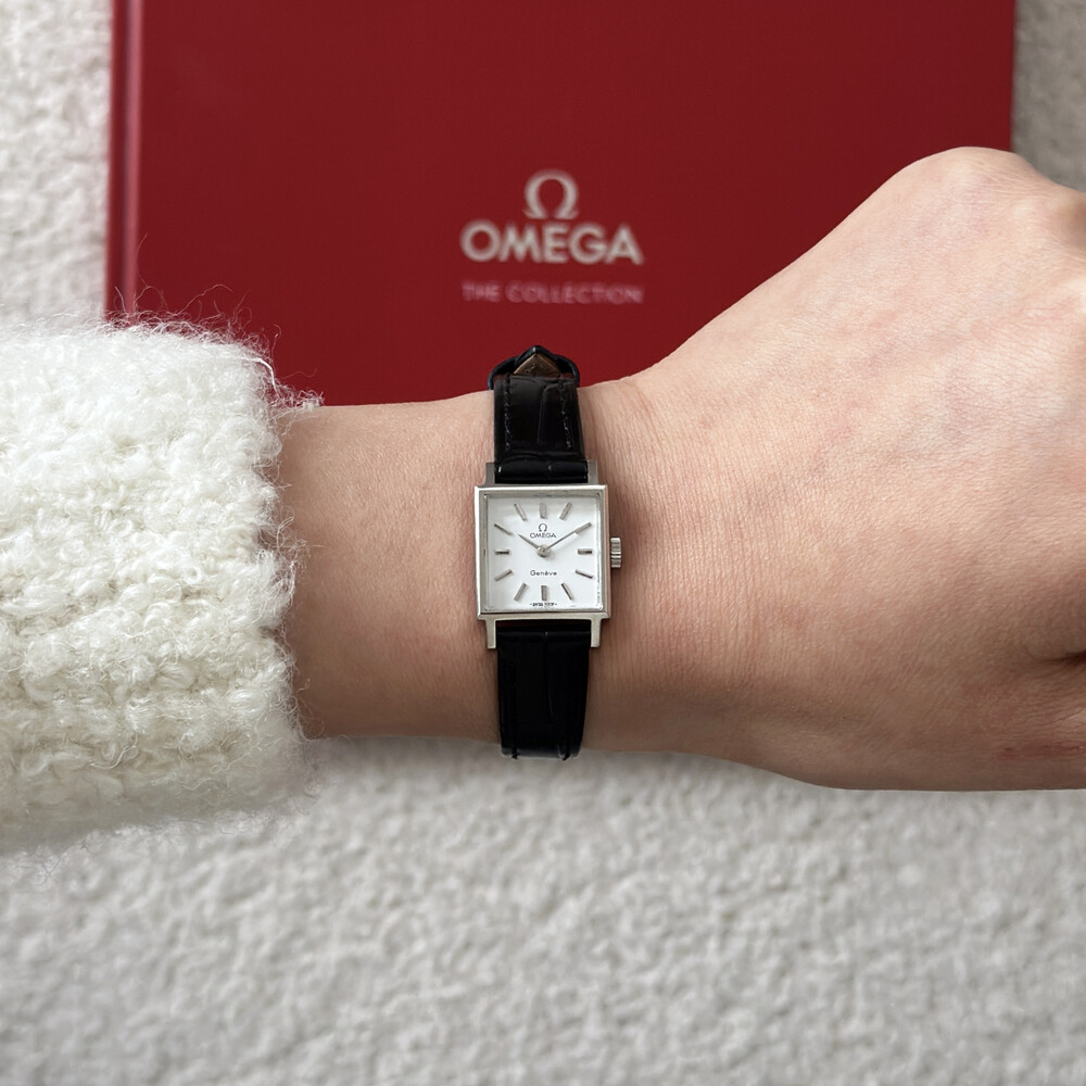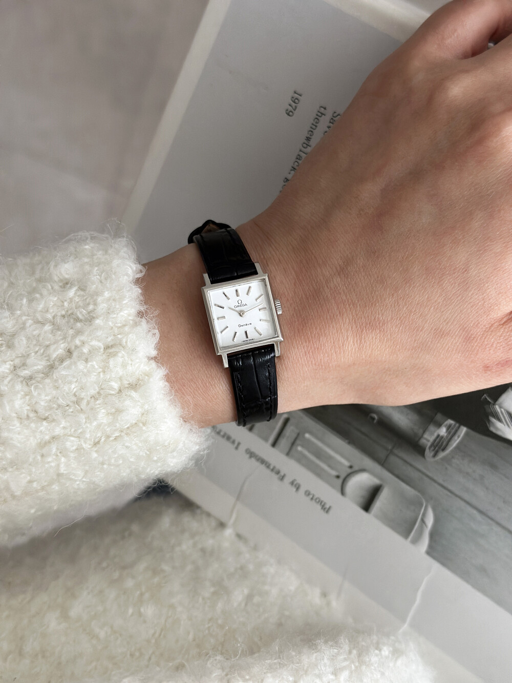 1973년도에 제작된 여성용 오메가 제네브 모델로 스퀘어 타입의 실버 케이스와