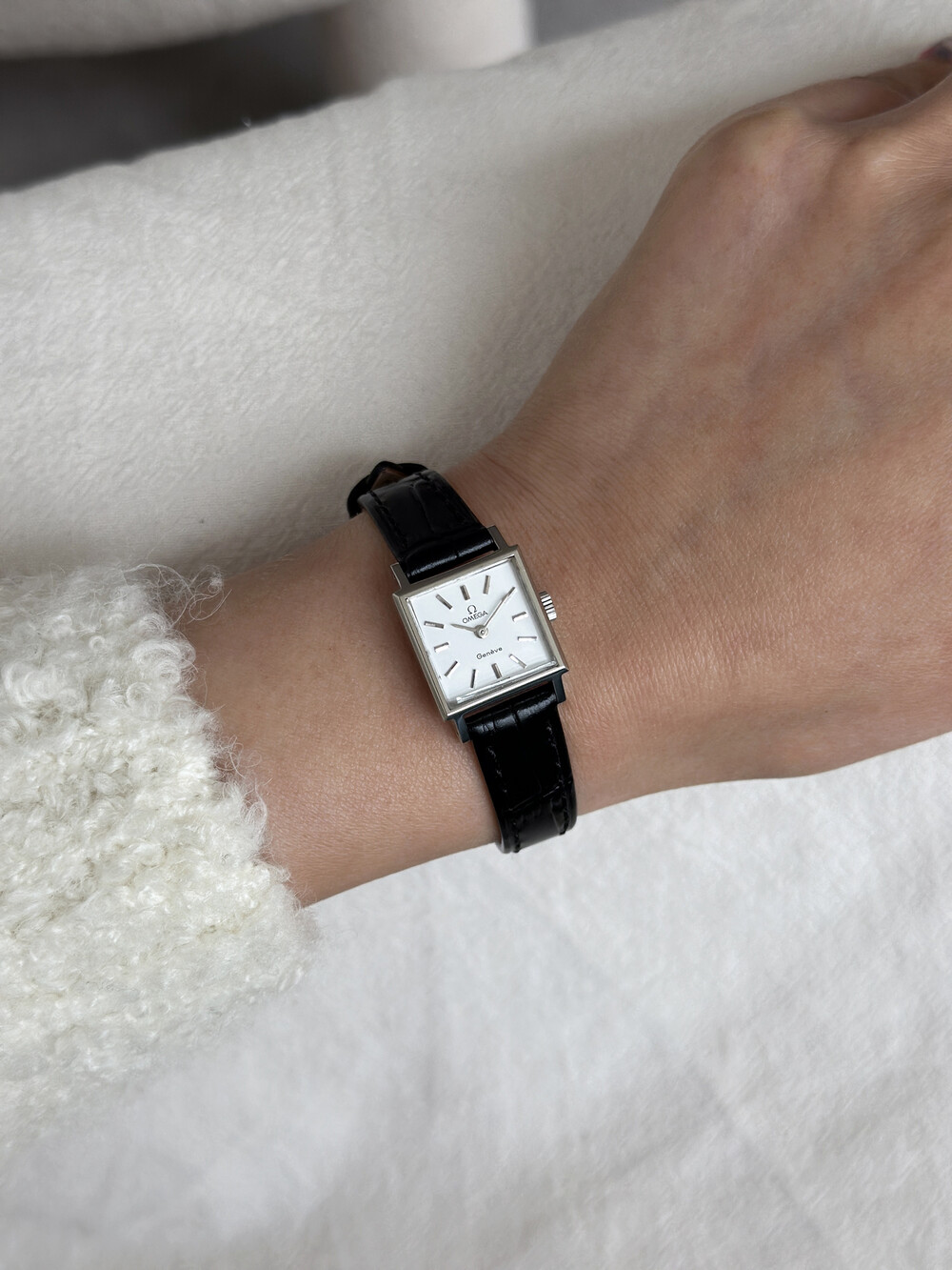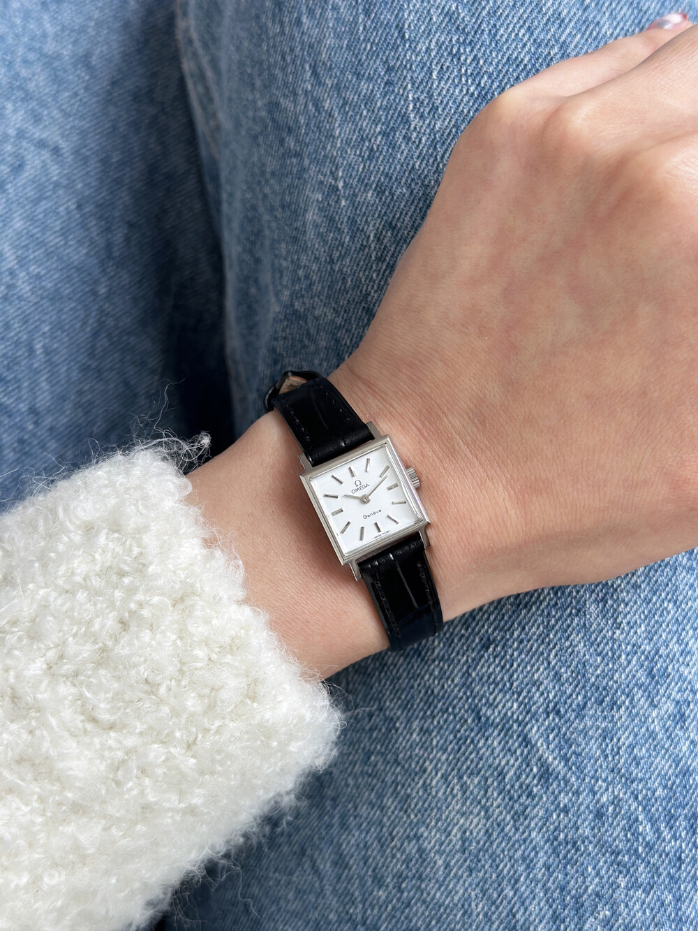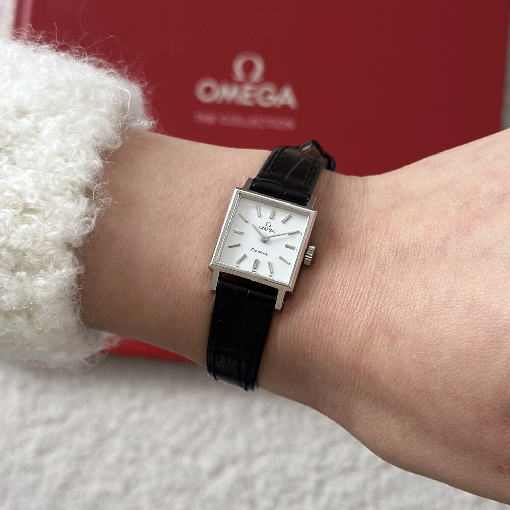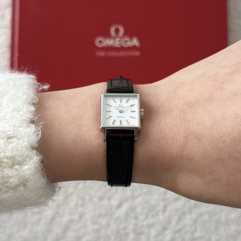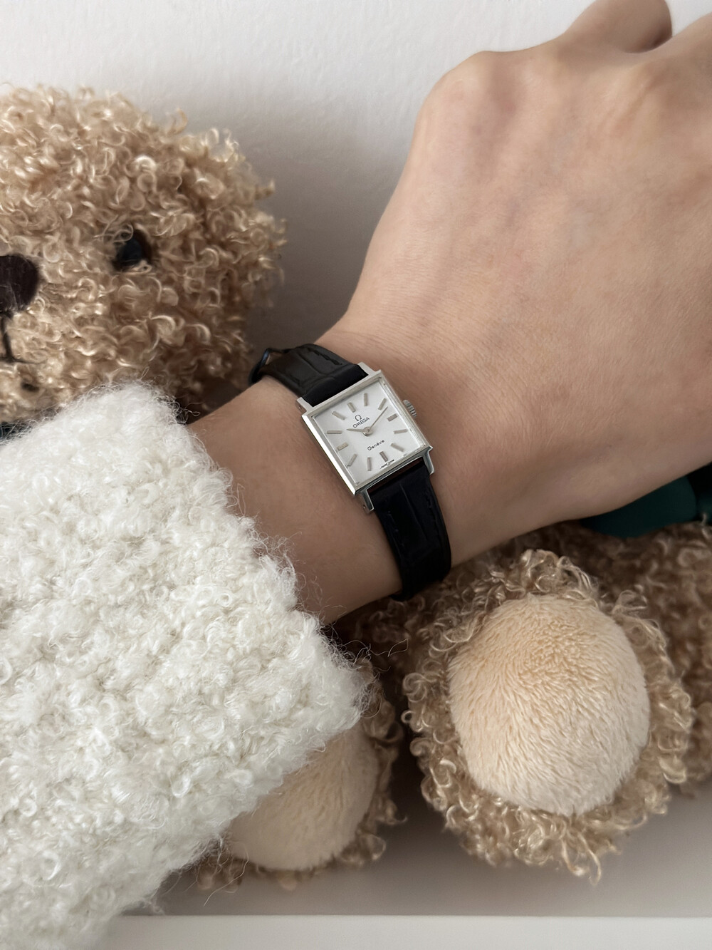 1973년도에 제작된 여성용 오메가 제네브 모델로 스퀘어 타입의 실버 케이스와