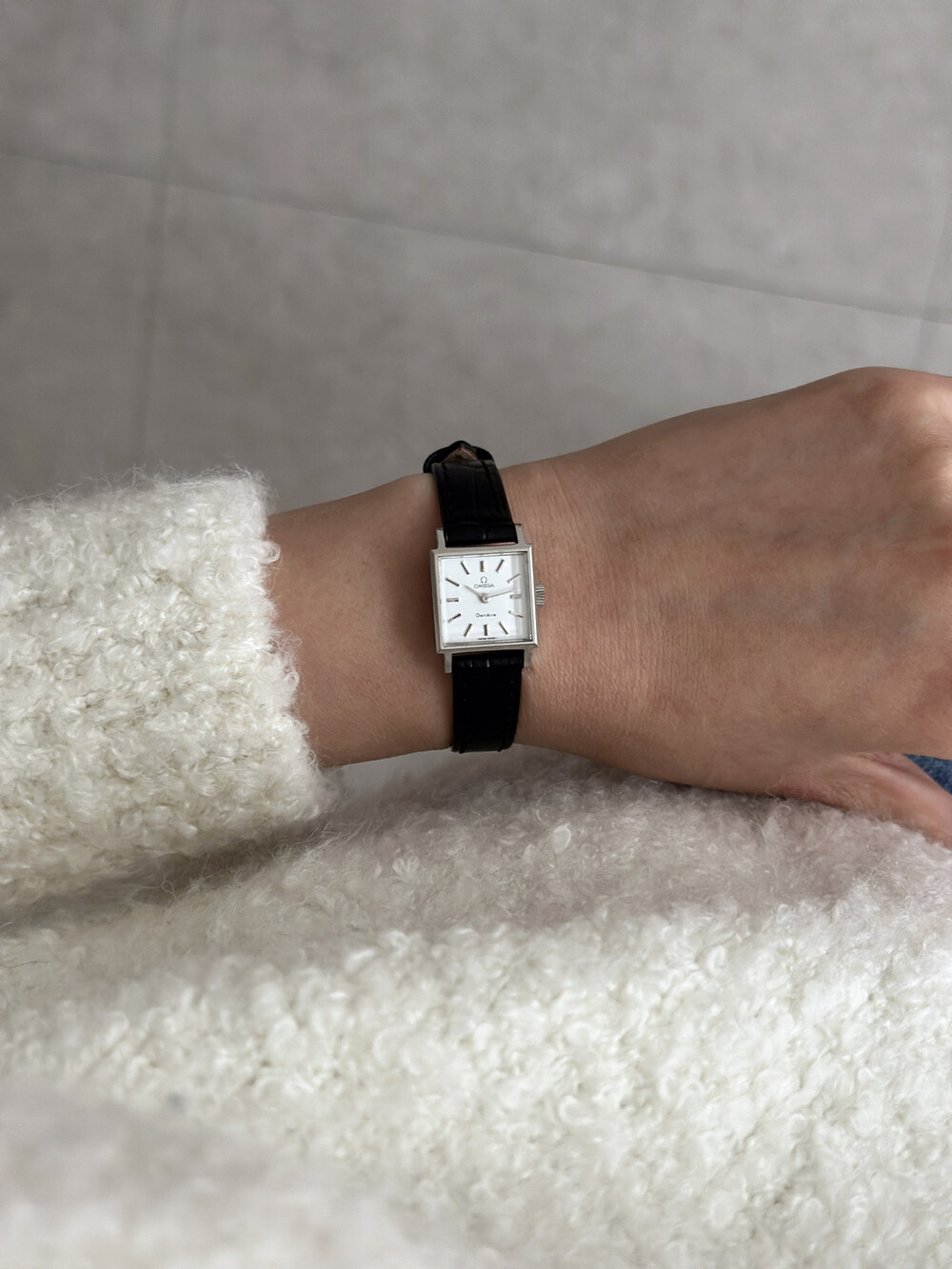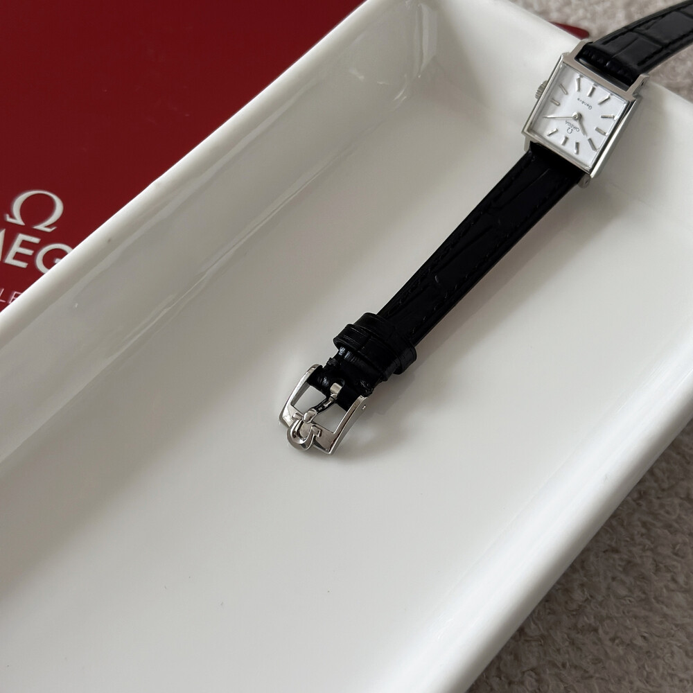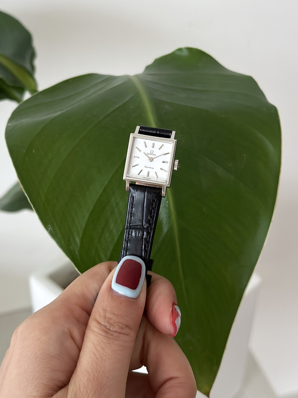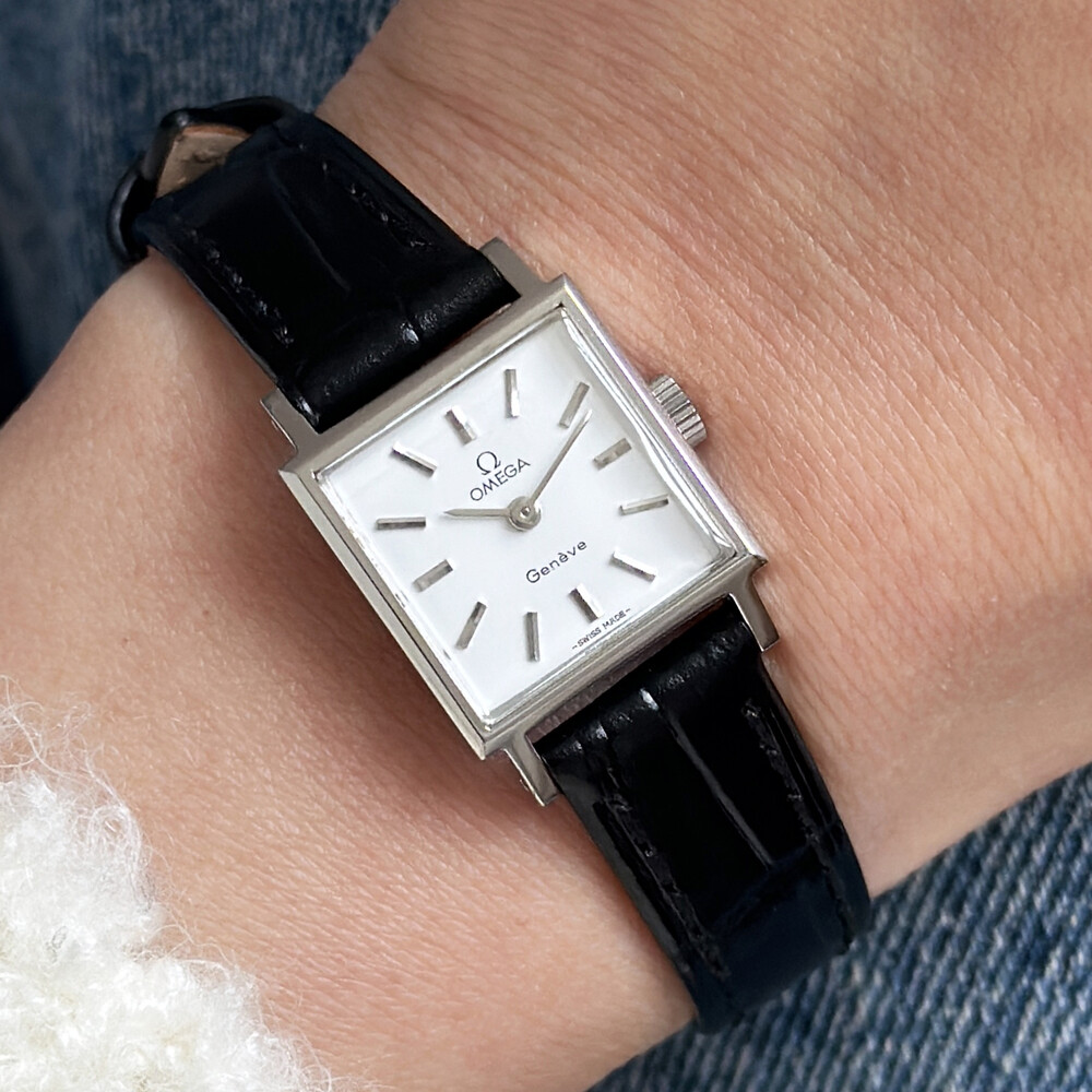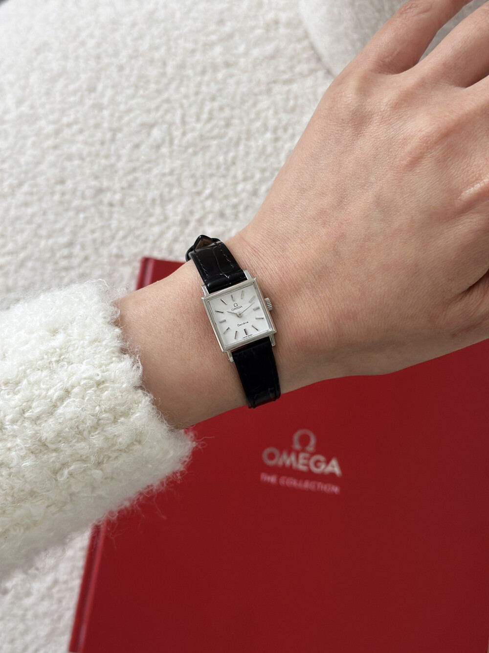1973년도에 제작된 여성용 오메가 제네브 모델로 스퀘어 타입의 실버 케이스와