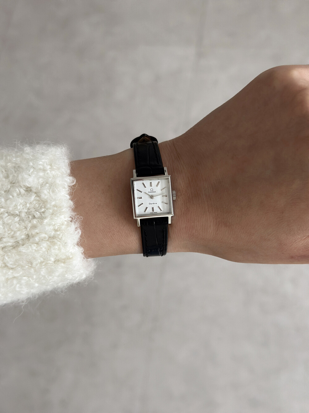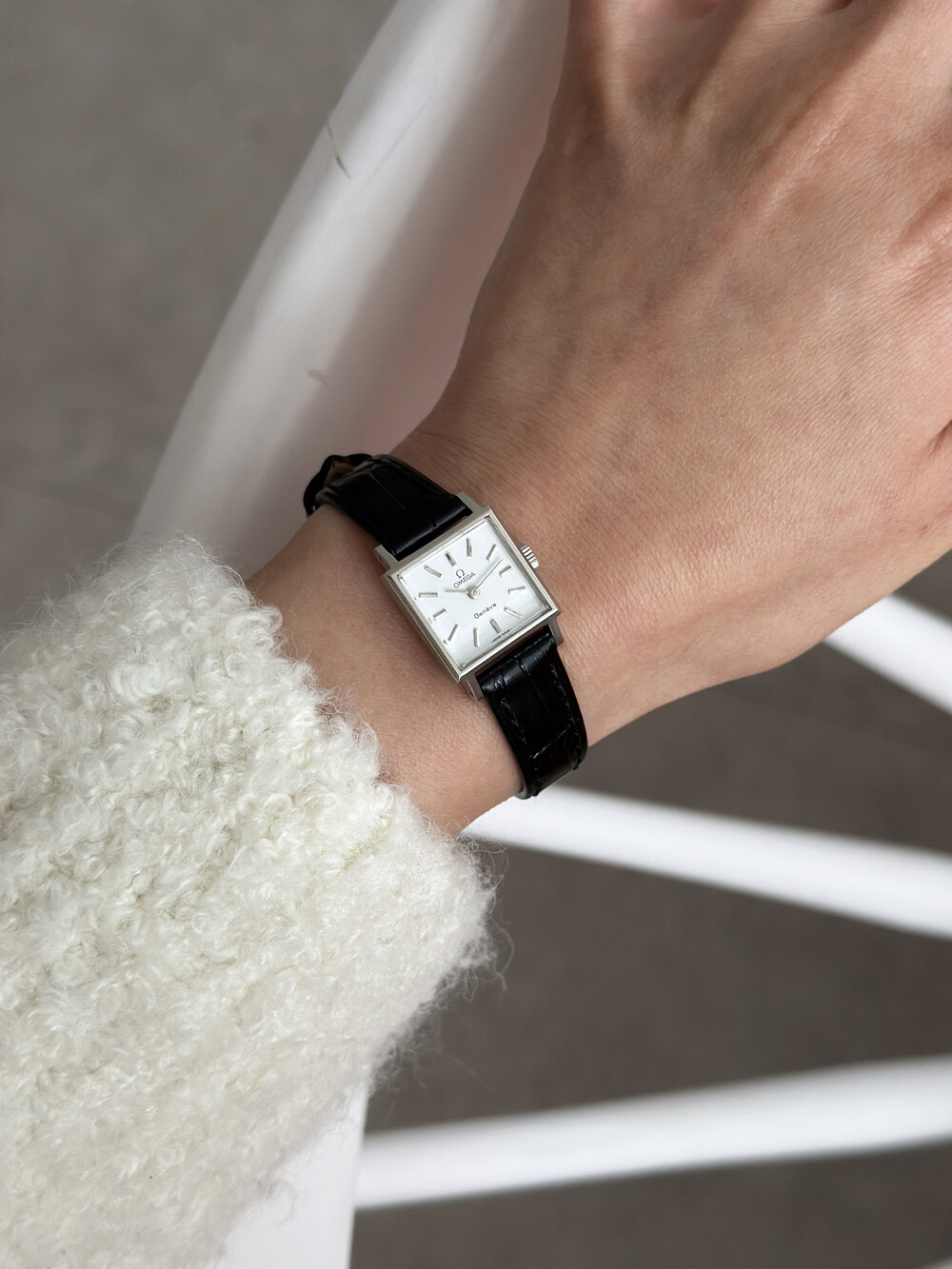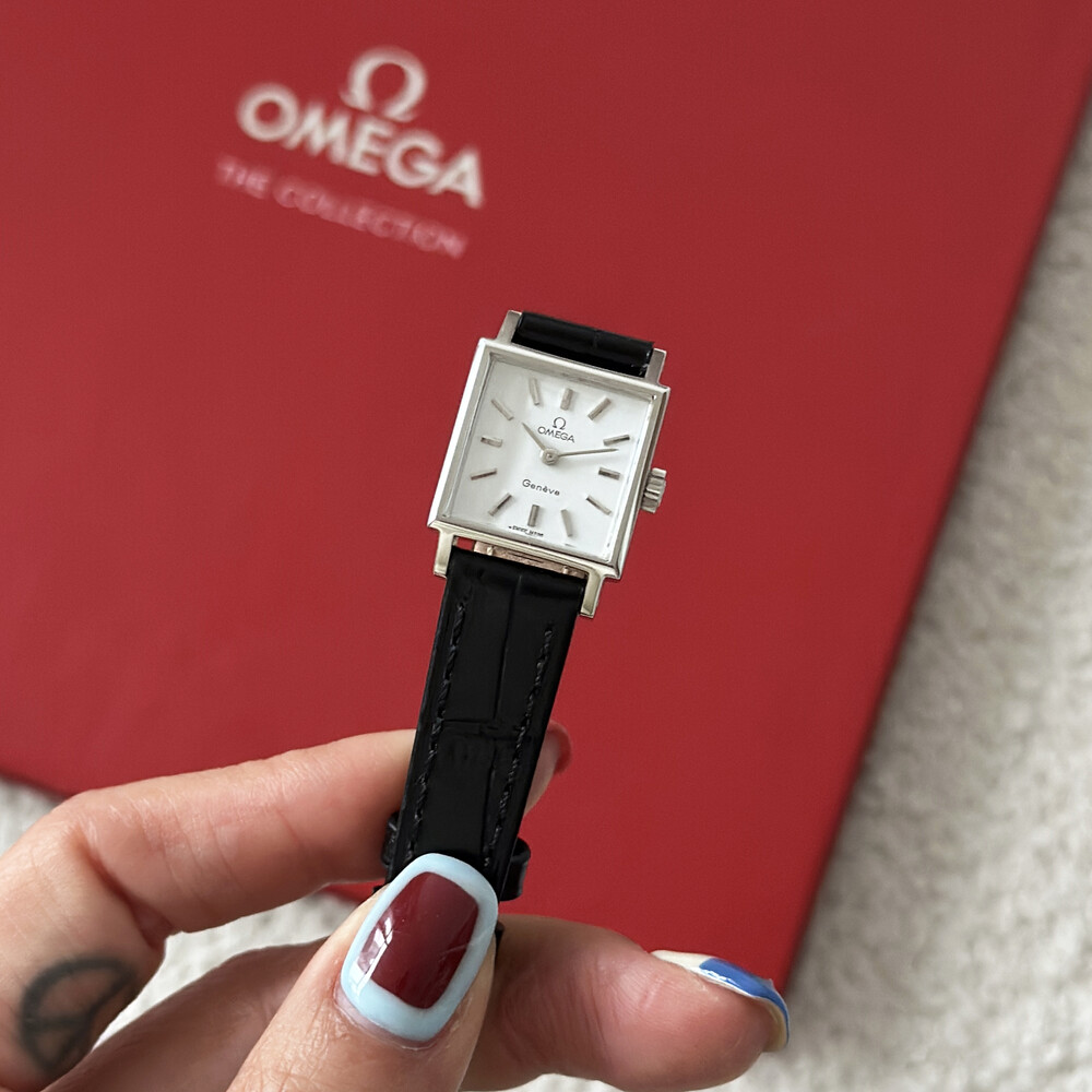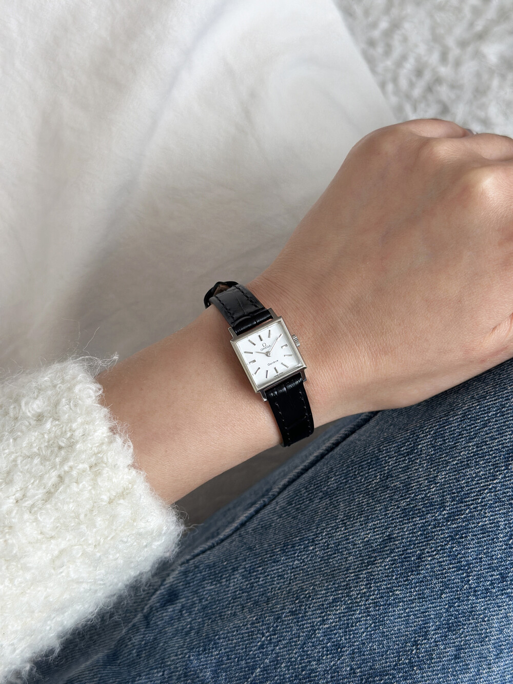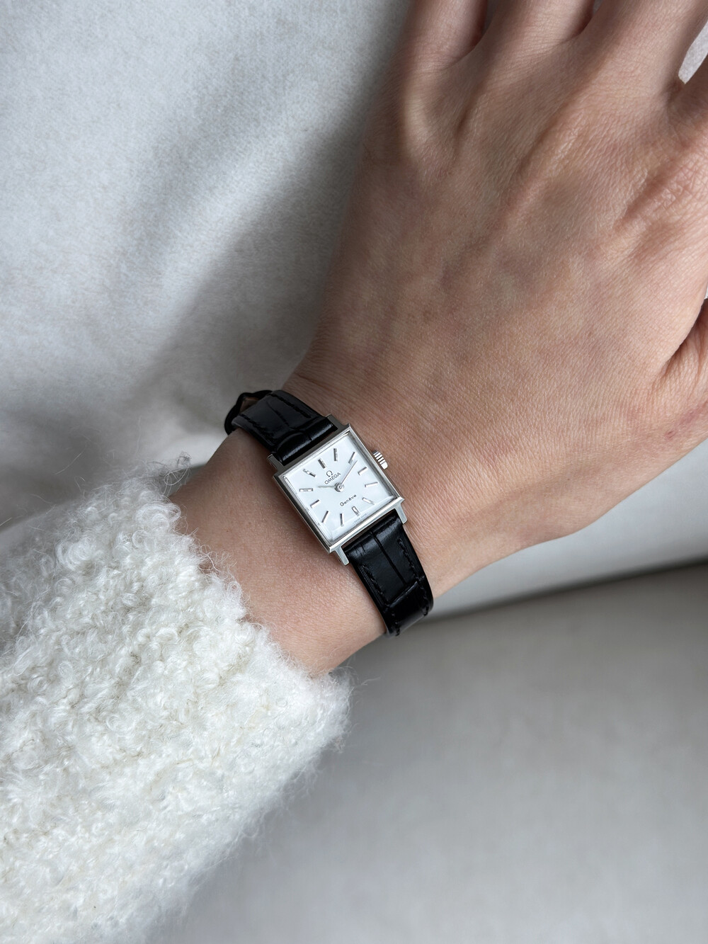 1973년도에 제작된 여성용 오메가 제네브 모델로 스퀘어 타입의 실버 케이스와