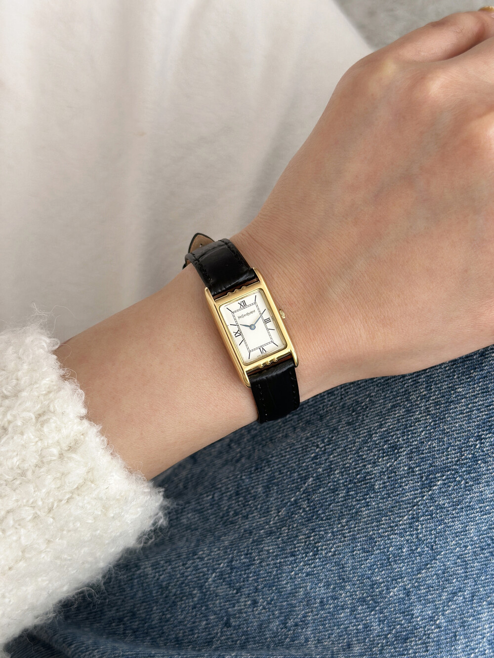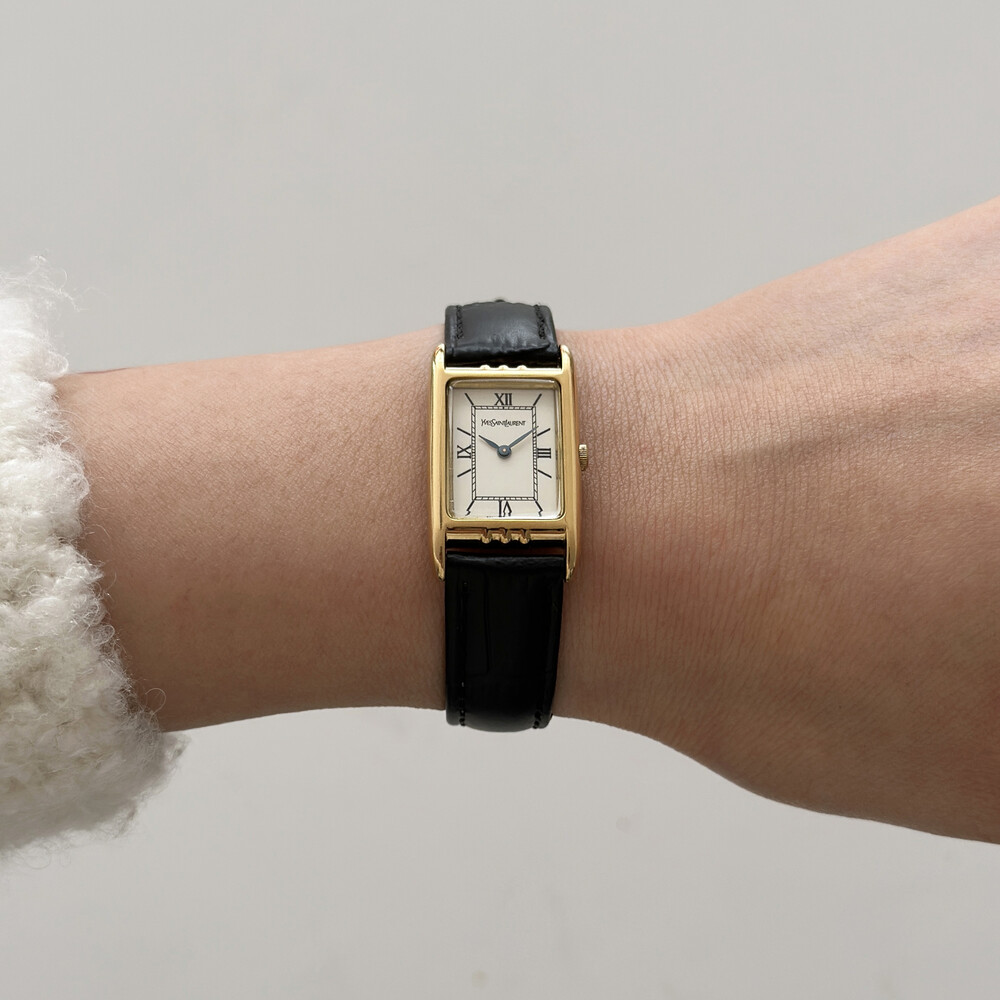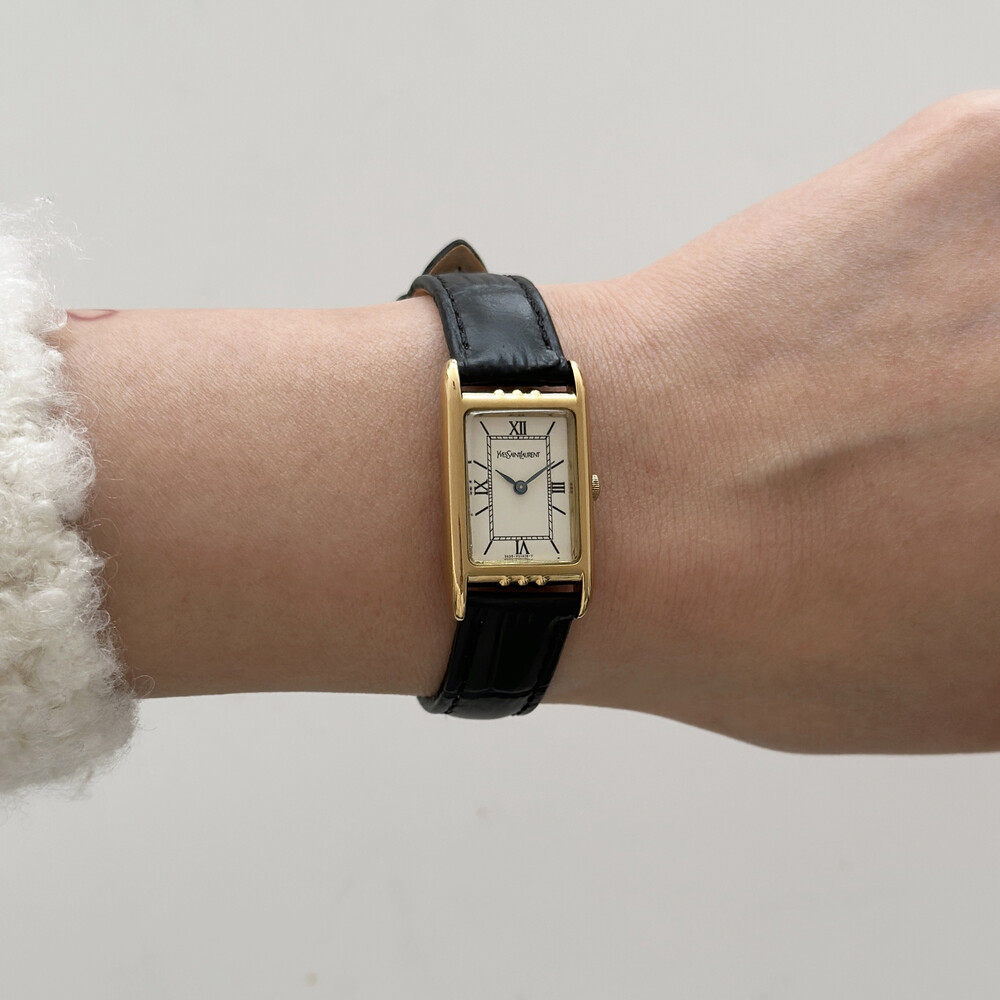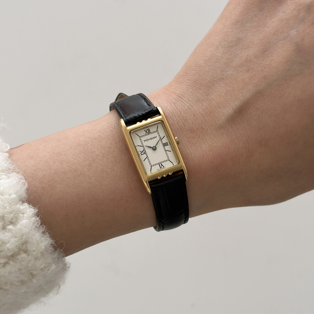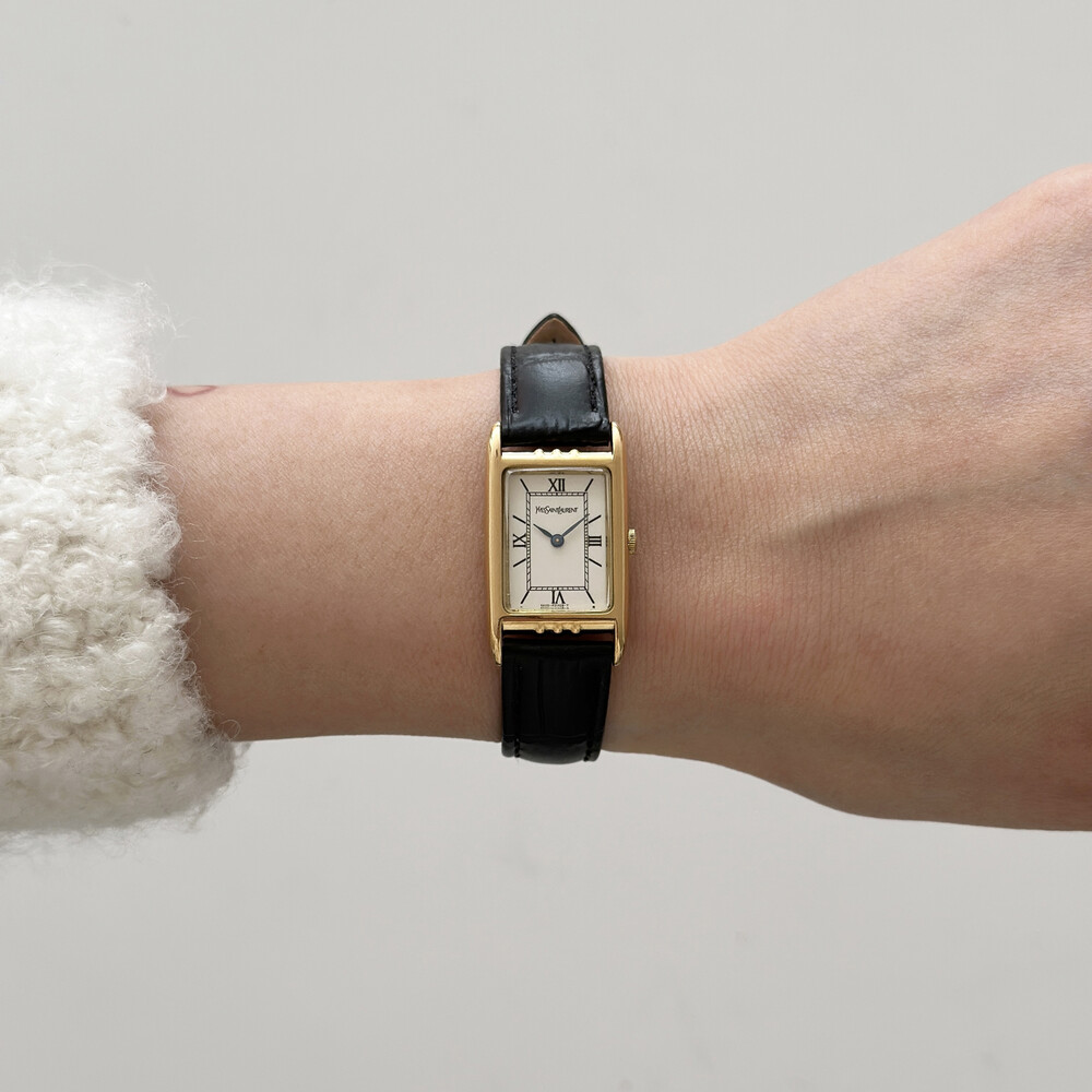 부드러운 곡선의 스퀘어 케이스와 화이트 다이얼 위를 장식하는 생로랑 로고가 매력적인 시계입니다.