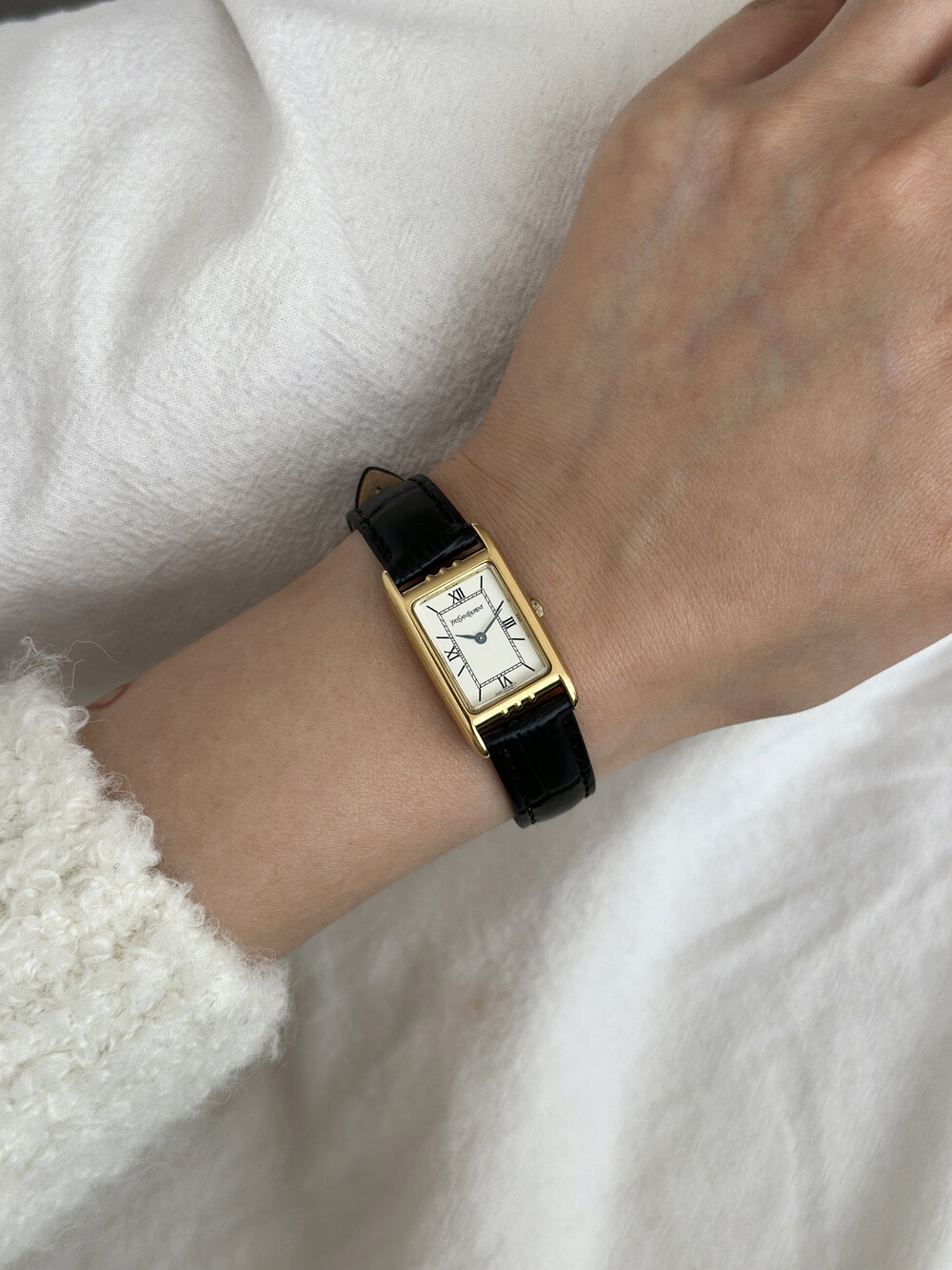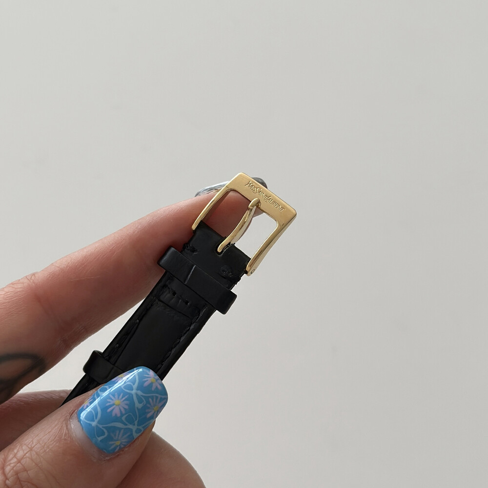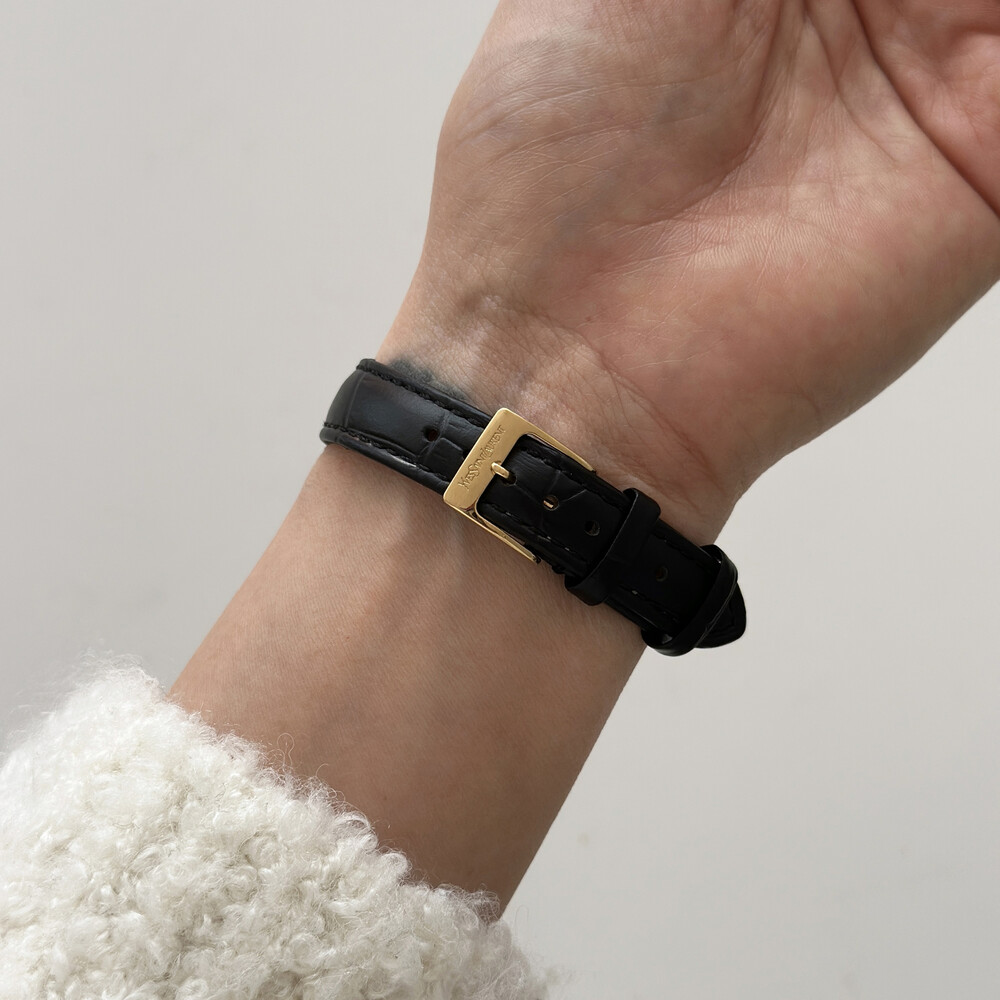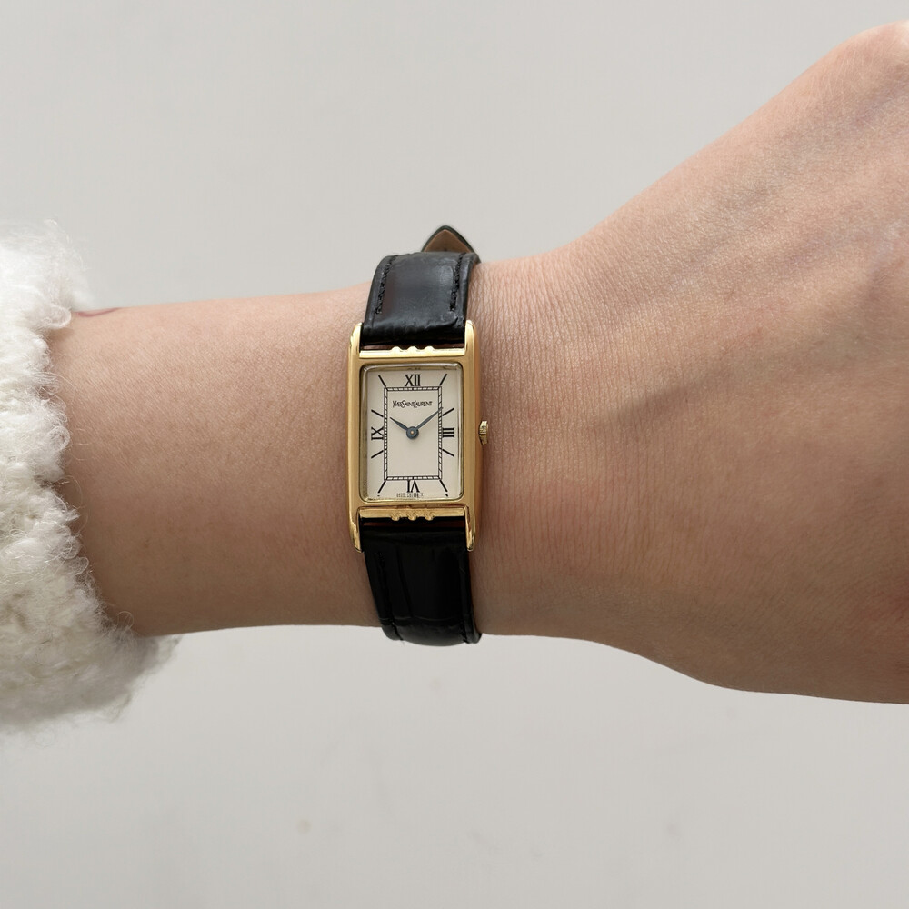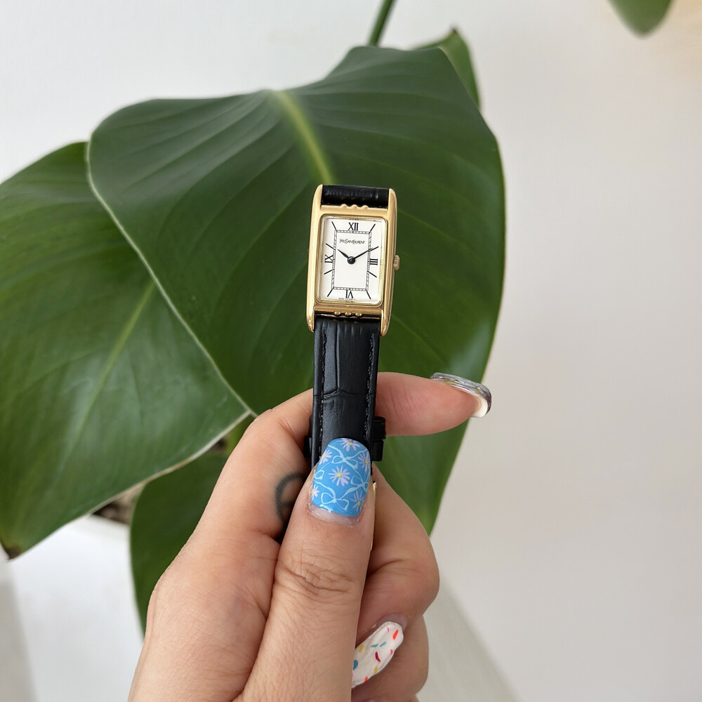 부드러운 곡선의 스퀘어 케이스와 화이트 다이얼 위를 장식하는 생로랑 로고가 매력적인 시계입니다.
