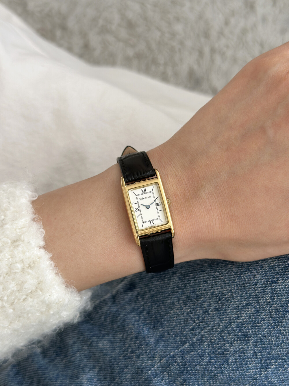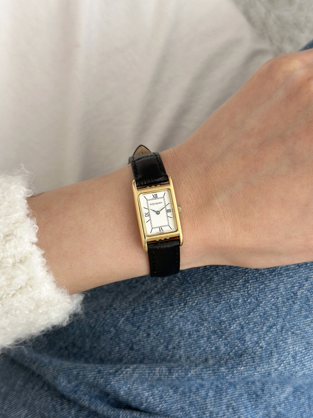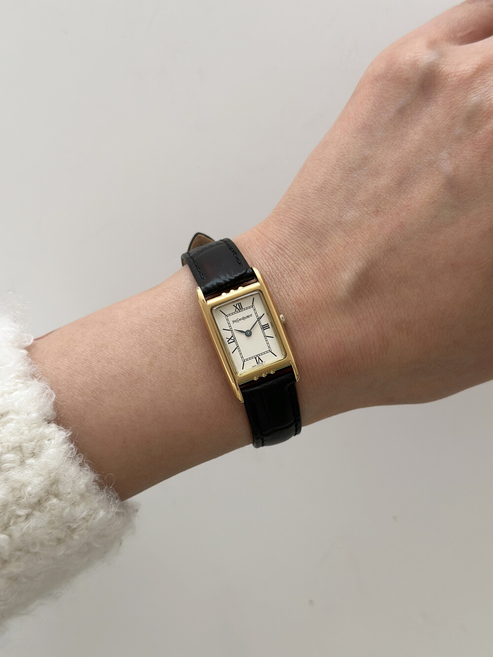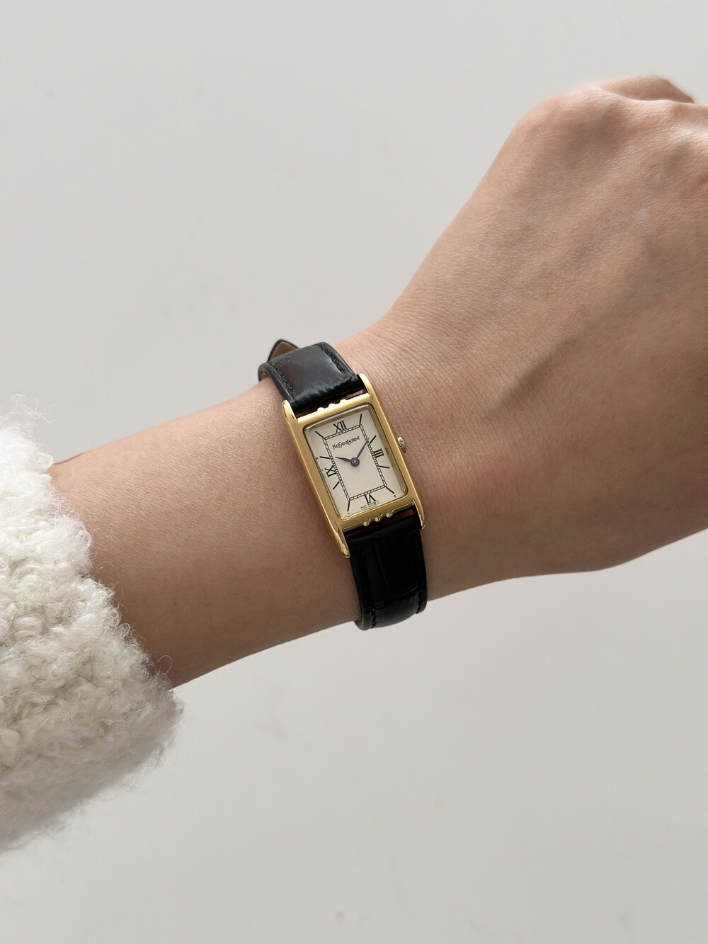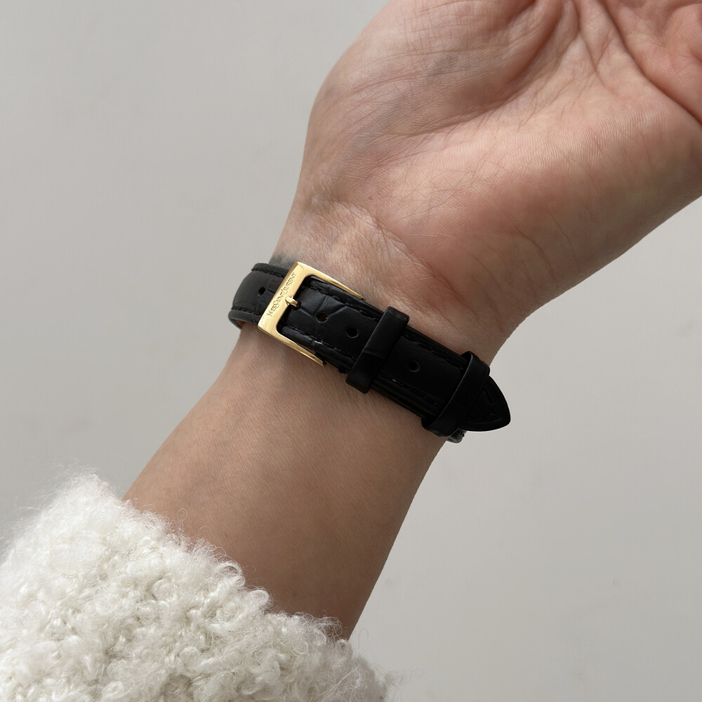 부드러운 곡선의 스퀘어 케이스와 화이트 다이얼 위를 장식하는 생로랑 로고가 매력적인 시계입니다.
