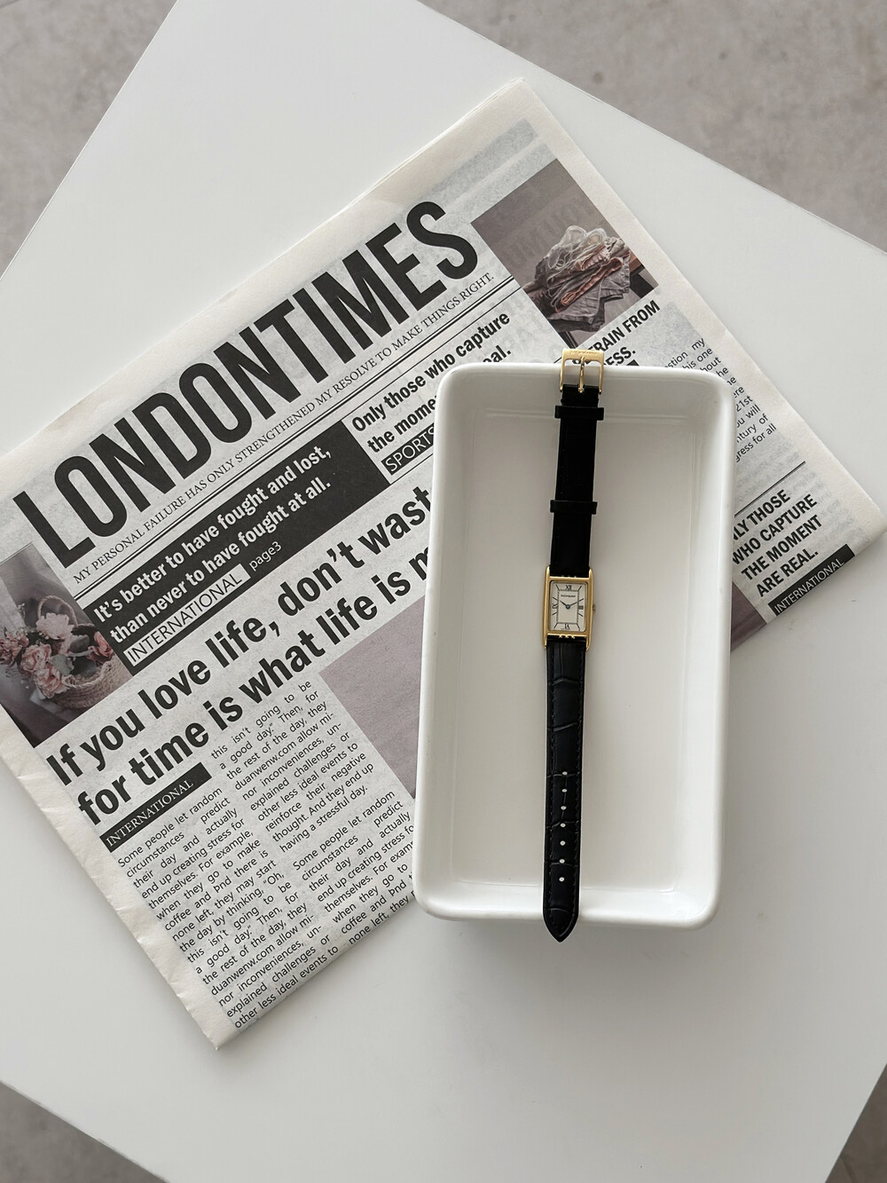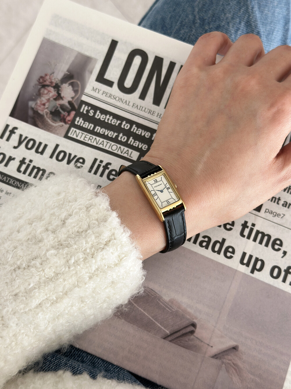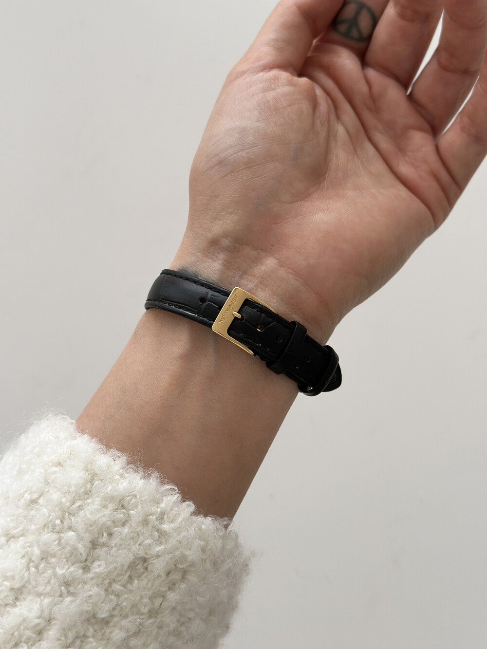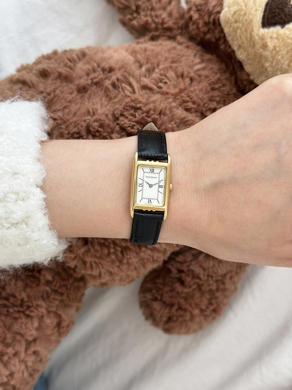 부드러운 곡선의 스퀘어 케이스와 화이트 다이얼 위를 장식하는 생로랑 로고가 매력적인 시계입니다.