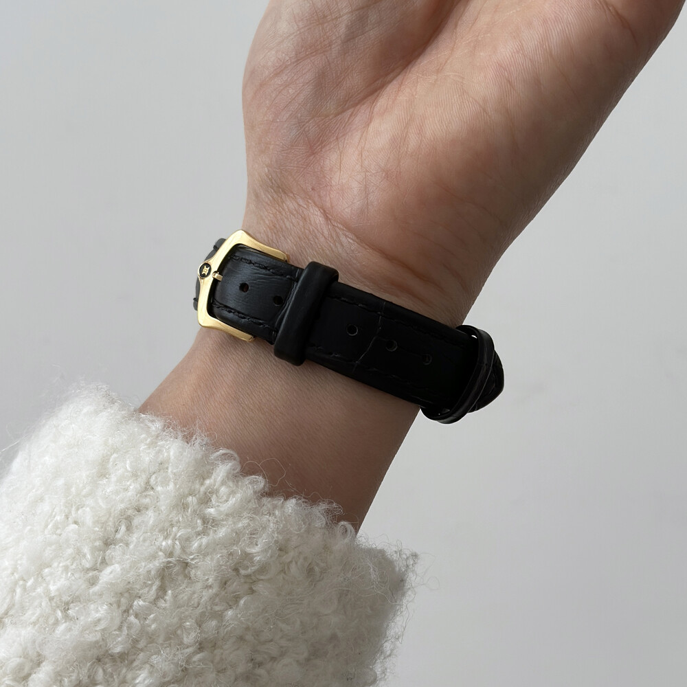 부드러운 골드 톤 케이스와 12시를 장식하는 다이아몬드 인덱스,